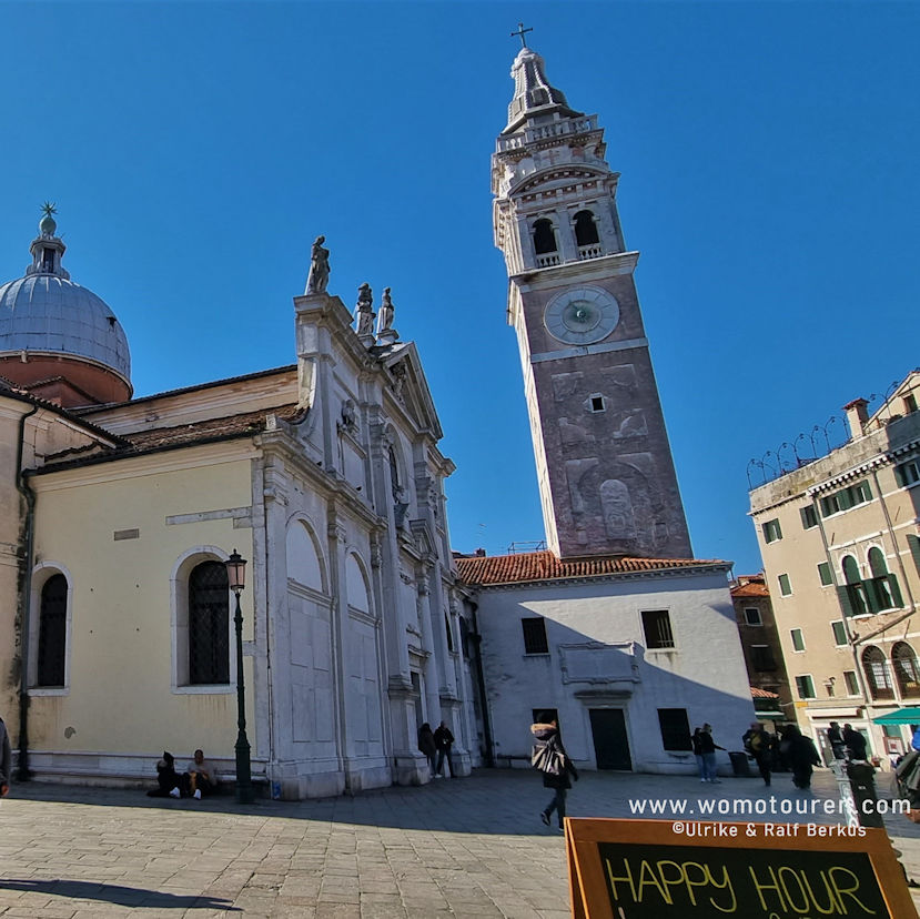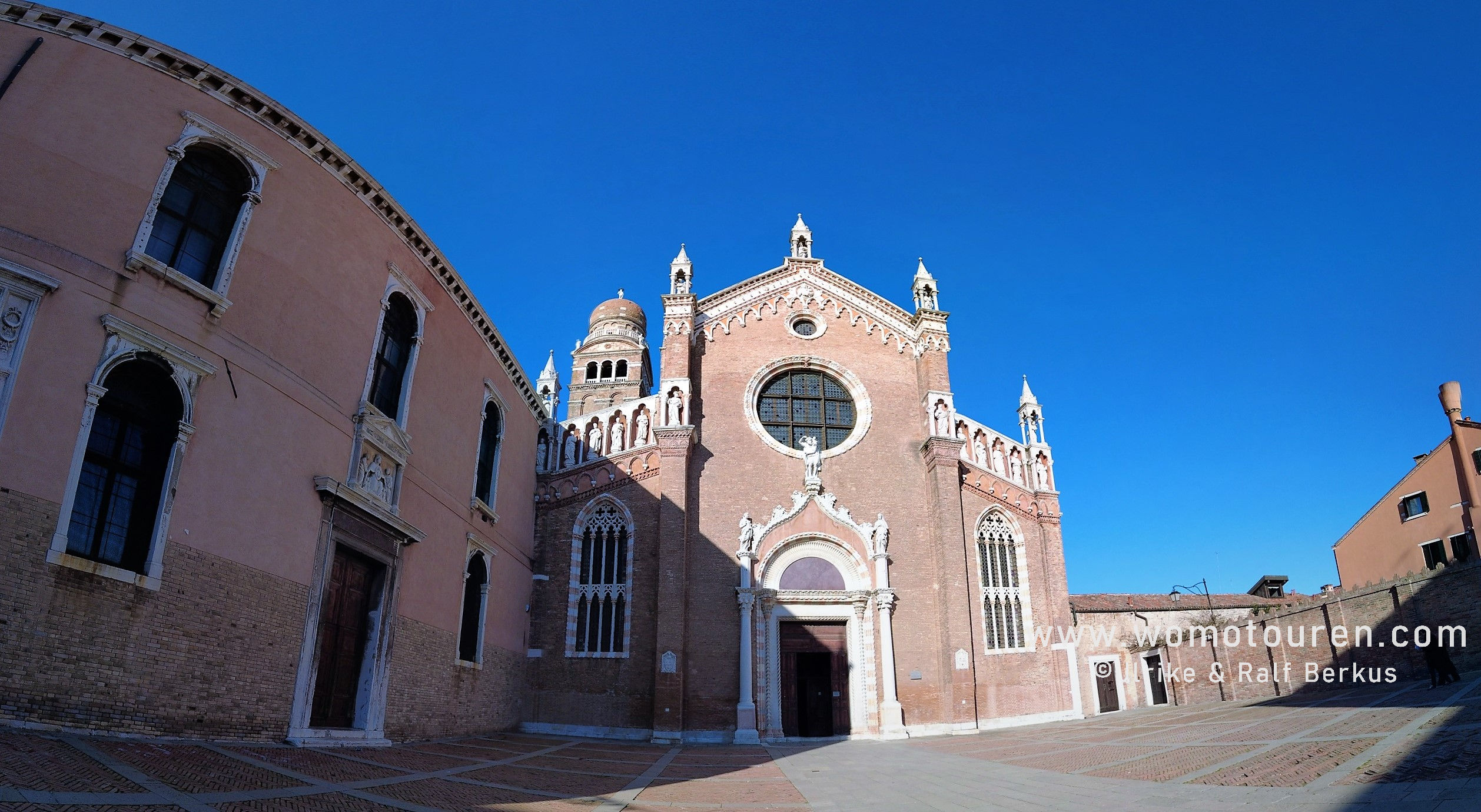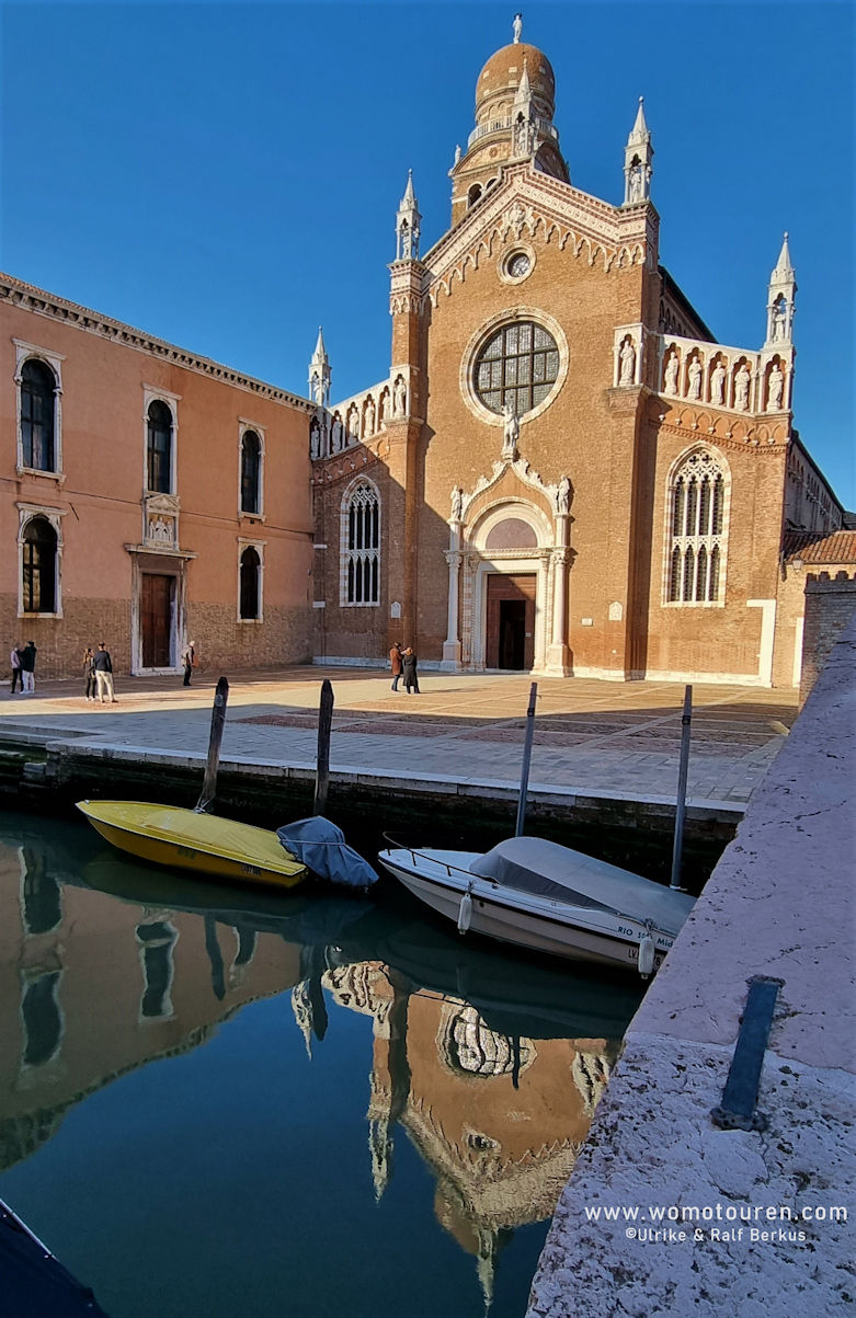 Über die Station San Pietro di Castello erreichen wir nach etwa 20 Minuten Fahrt den Halt Madonna dell’Orto in Canareggio und kurze Zeit später selbige Kirche „Madonna dell’Orto. Wunderschön anzusehen und wegen einiger Werke Tintorettos und seines Grabes bestimmt einen Besuch wert, aber nicht heute. Aber schon von außen ist die Kirche ein echter Hingucker…