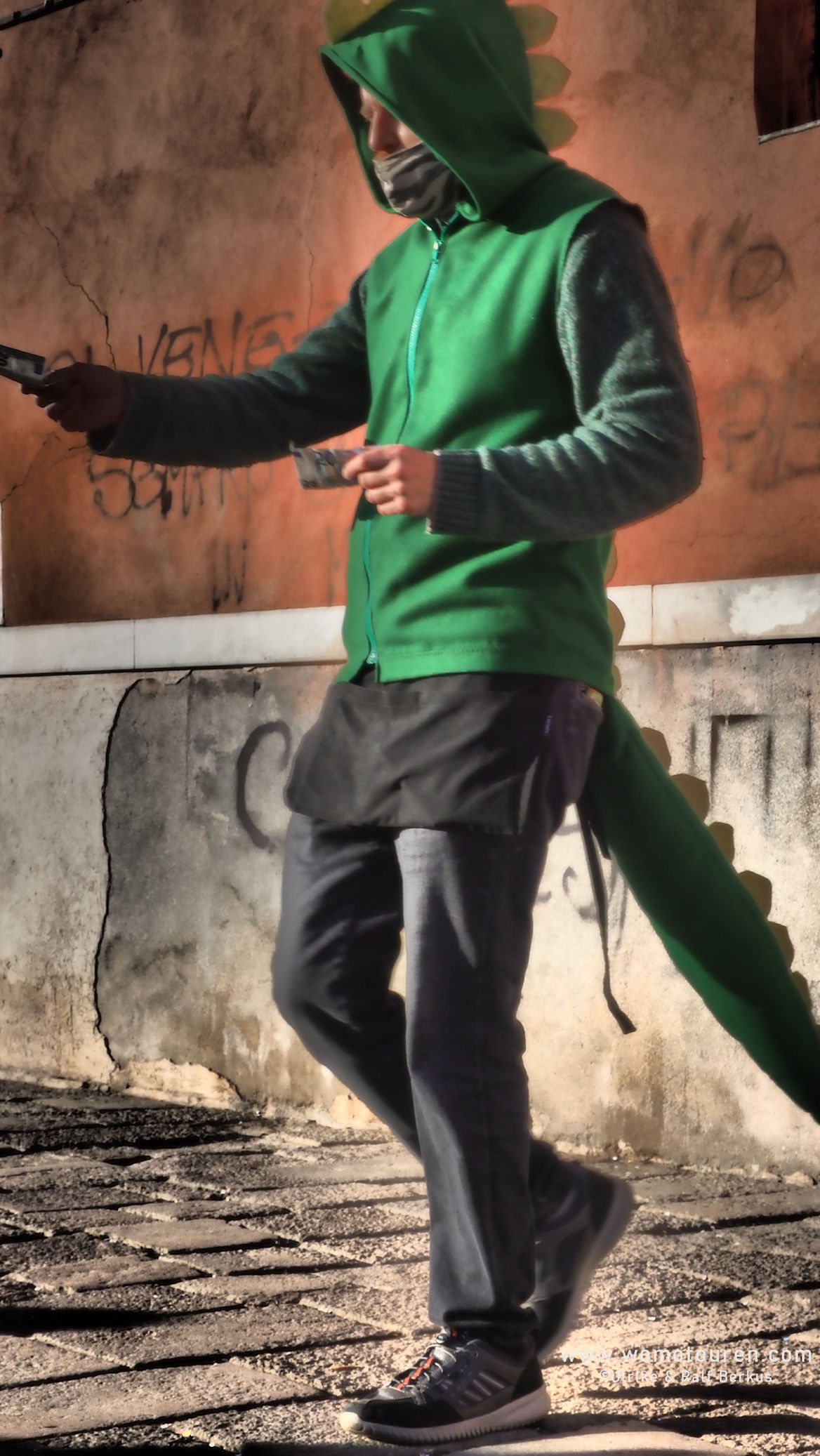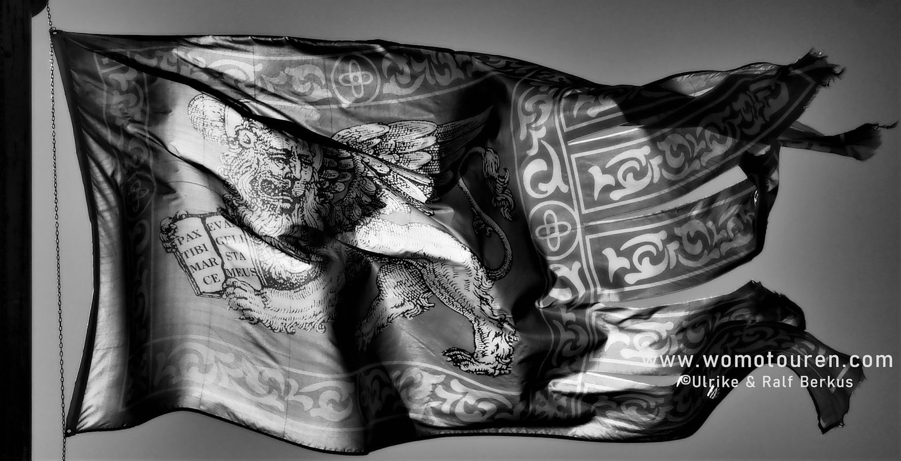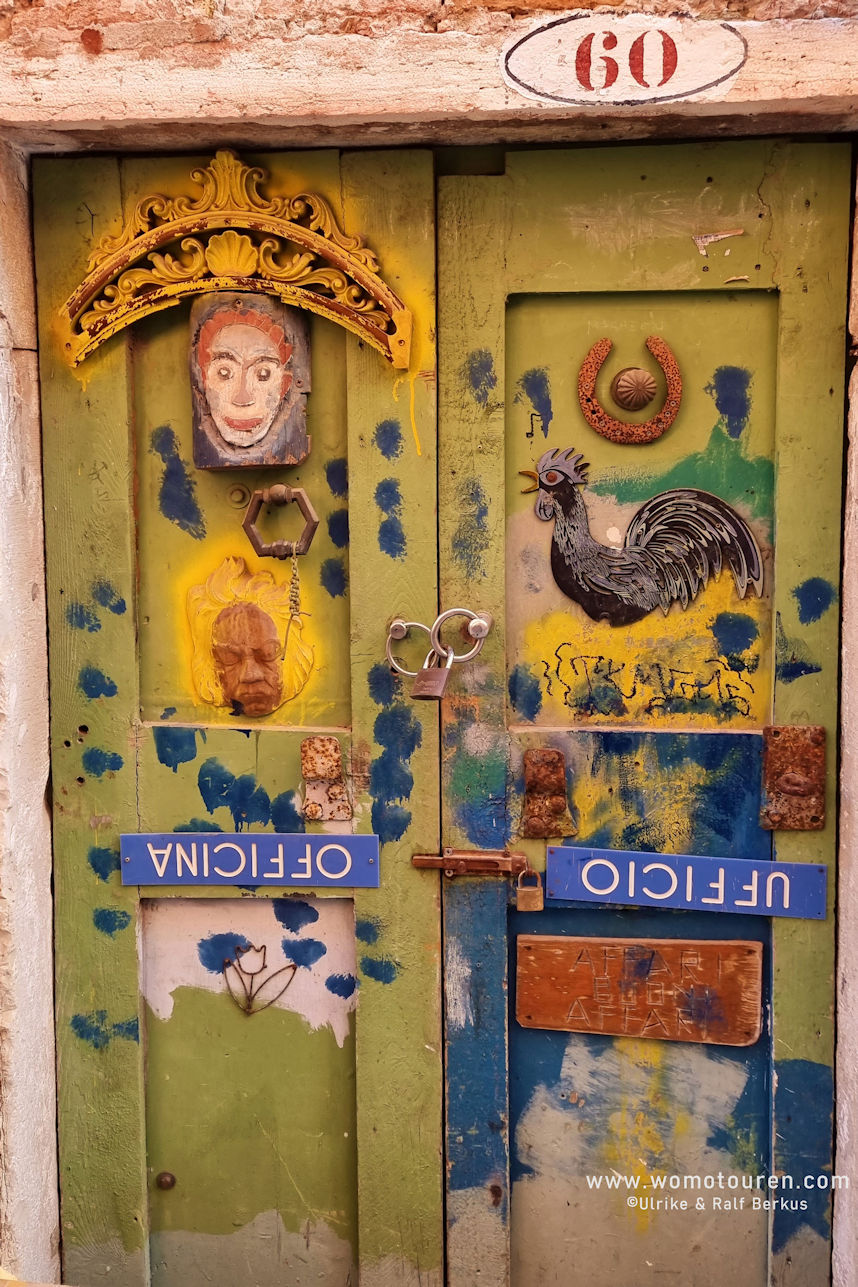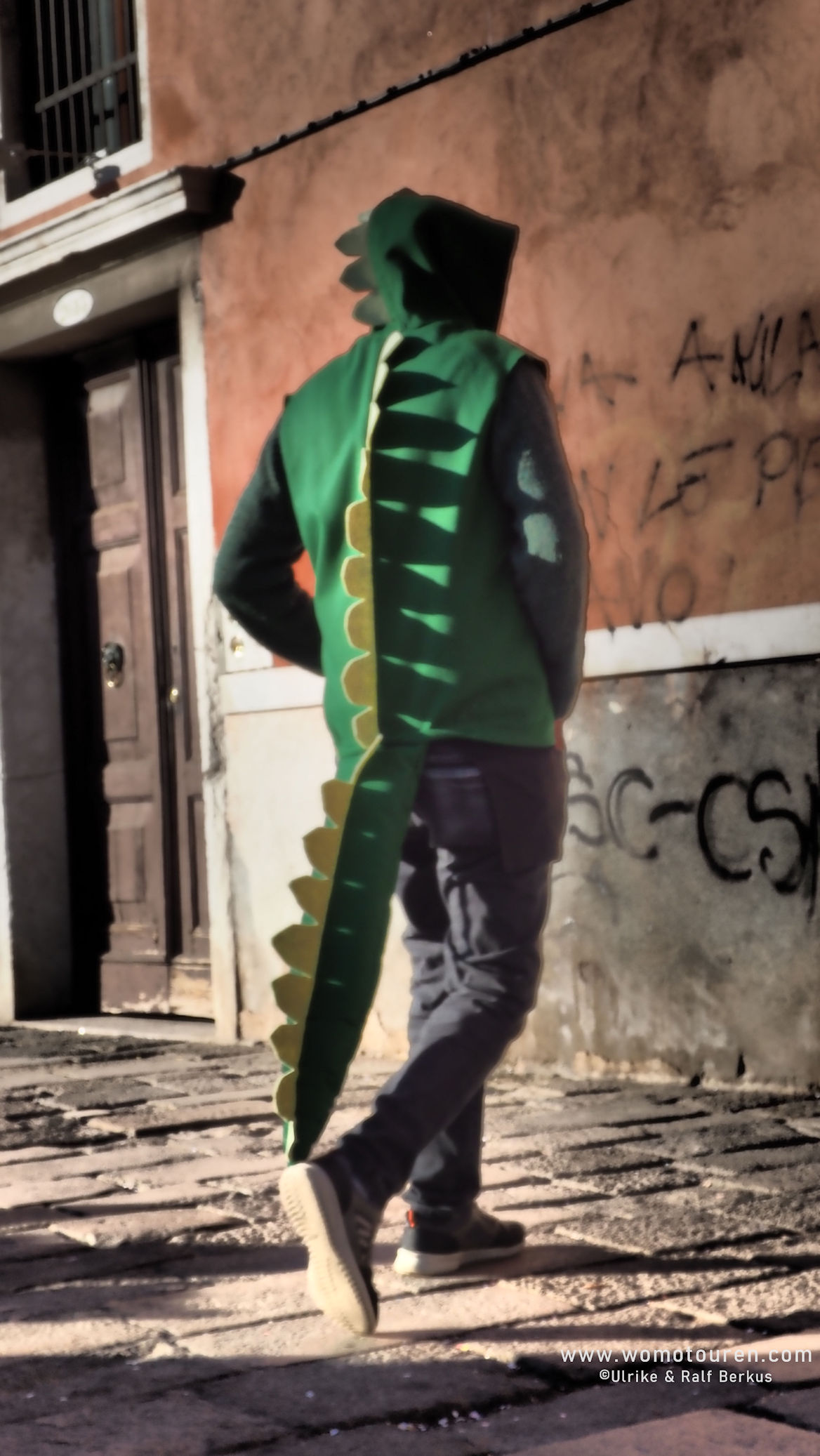 Nun nochmal zurück zu unserem zahmen Drachen. Die Bedienung steckt im Drachenkostüm und ist wirklich nett betrunken. Die Zunge etwas schwer und jeder, der ein Tourist sein könnte, bekommt ihn zu hören,den Satz: „Cov-Pass, kein Caffè, kein Cappuccino!“ Als sich dann zwei dieser Spezies, während „Grisu“ in seiner „Höhle“ weilt, an einen der Tische am Kanal setzen, um kurze Zeit bei ihm zwei Caffè zu bestellen, beginnt Grisu fast Feuer zu speihen. Tut das Lachen gut….Ach ja: das Lokal heißt „A la Vecia Papussa“. Aber ob Ihr bei Eurem Besuch auch Drachen treffen werdet, wer weiß das schon?
