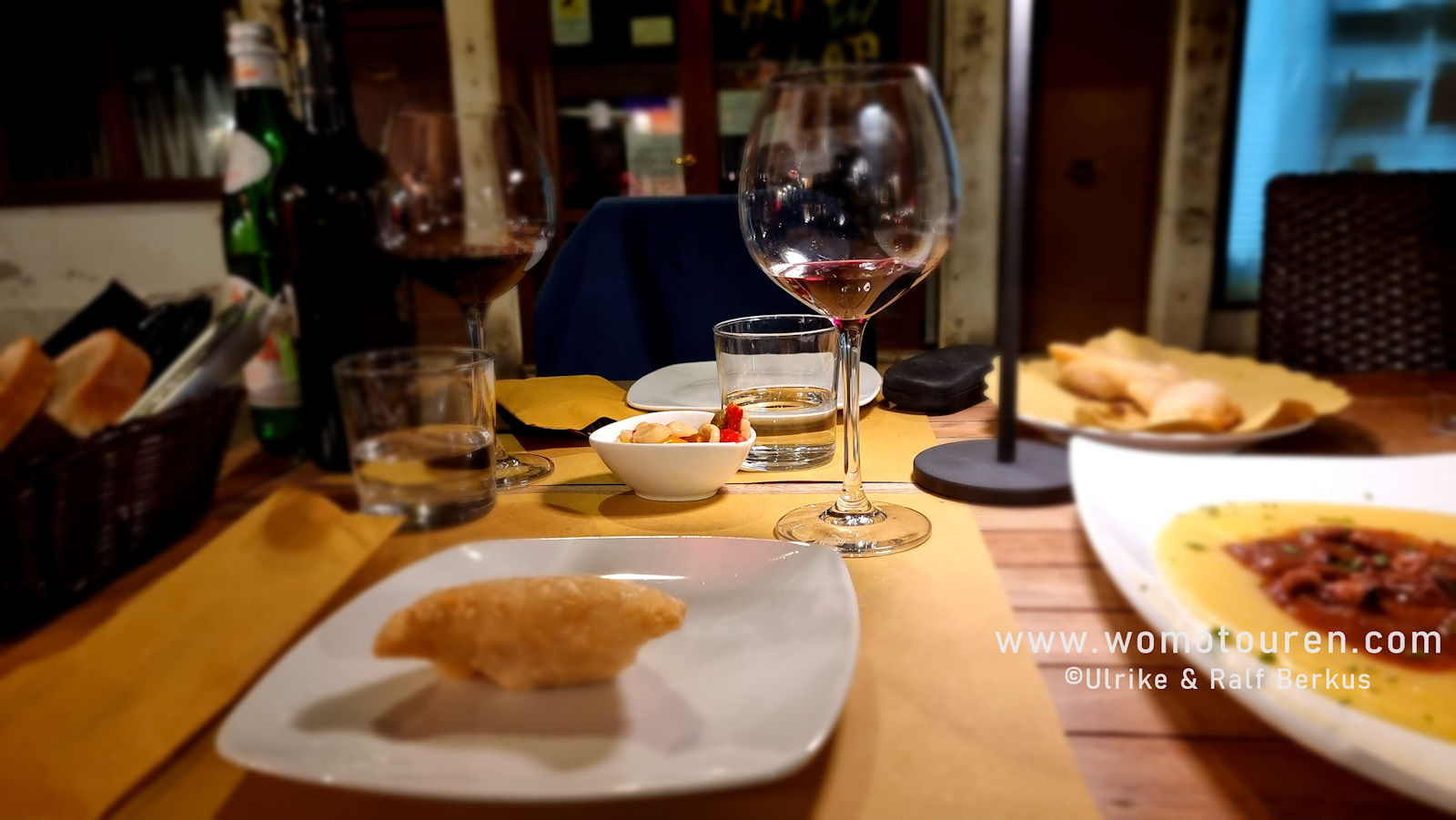 „Muro“ heißt es und schon von Weitem sieht es sehr nett aus. Hübsch gedeckte Tische auf einer beheizten Terrasse. Also genau das, was wir gesucht haben. Die Dame, die uns platziert hat zwar nicht den ganz großen Deal mit der Freundlichkeit, aber der Kellner ist die nächste Überraschung des Tages. Er ist lustig, freundlich und liebt es, Witze zu erzählen.