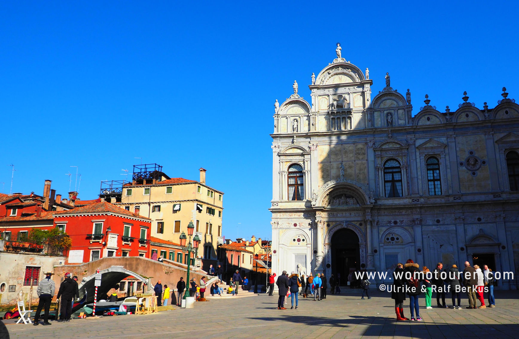 Wir nehmen das Vaporetto der Linie 5 und erreichen gegen 11 über den Ausstieg am Ospedale den Campo Giovanni e Paolo. Schon an der Haltstelle als auch auf dem Boot entwickeln sich nette Gespräche mit echten Veneziani. Einstieg sind natürlich immer unsere Fellzwerge…