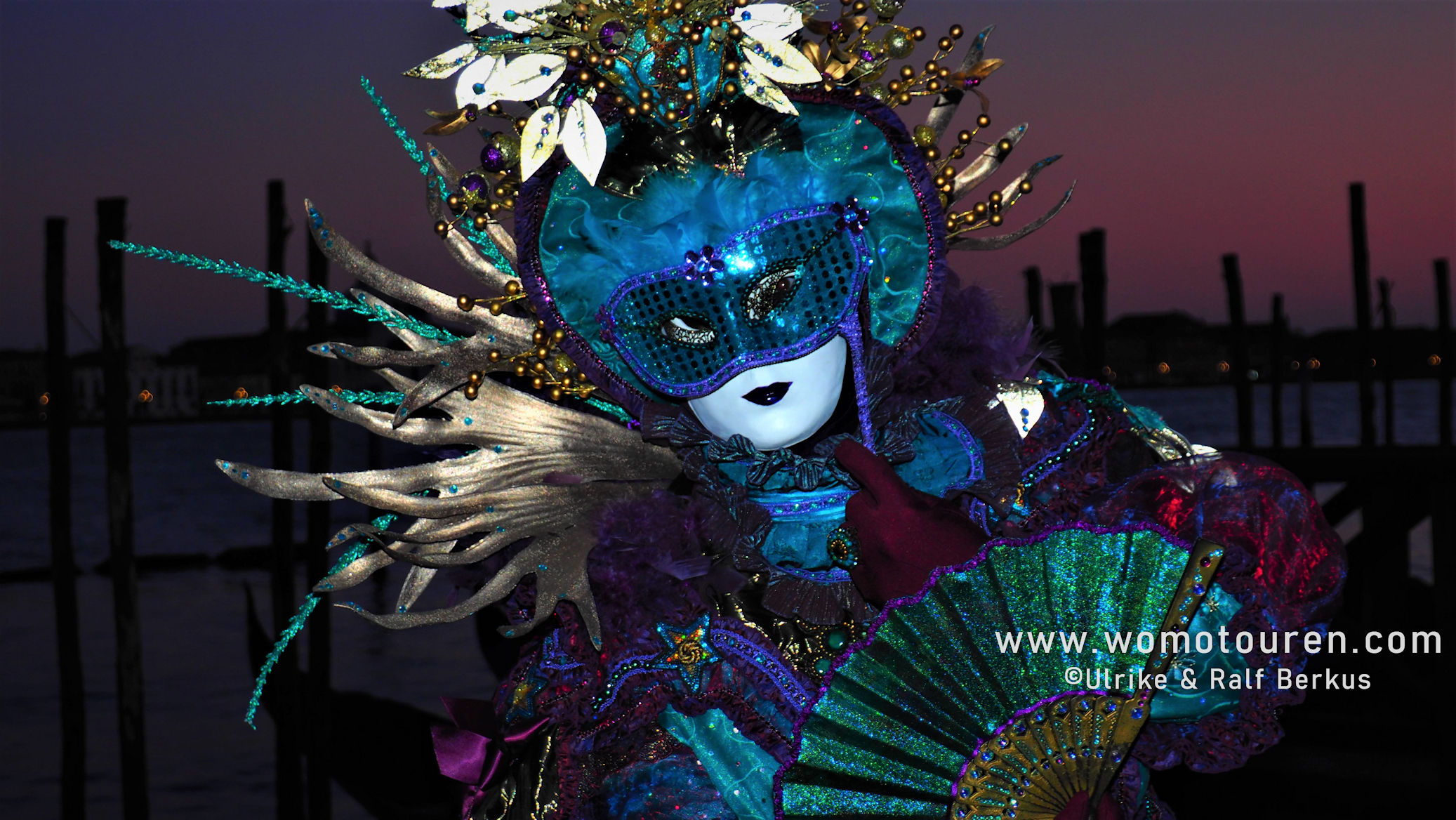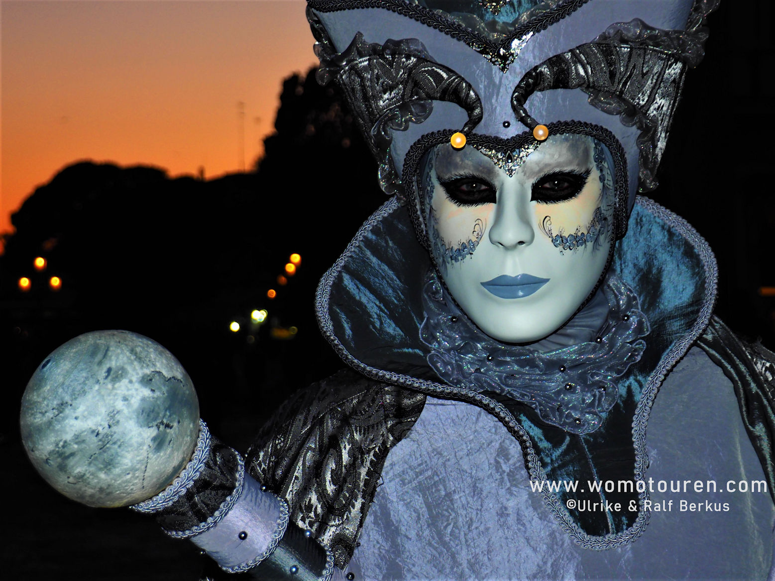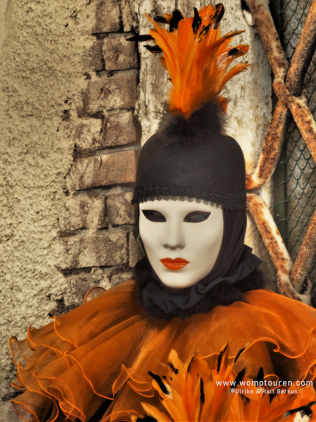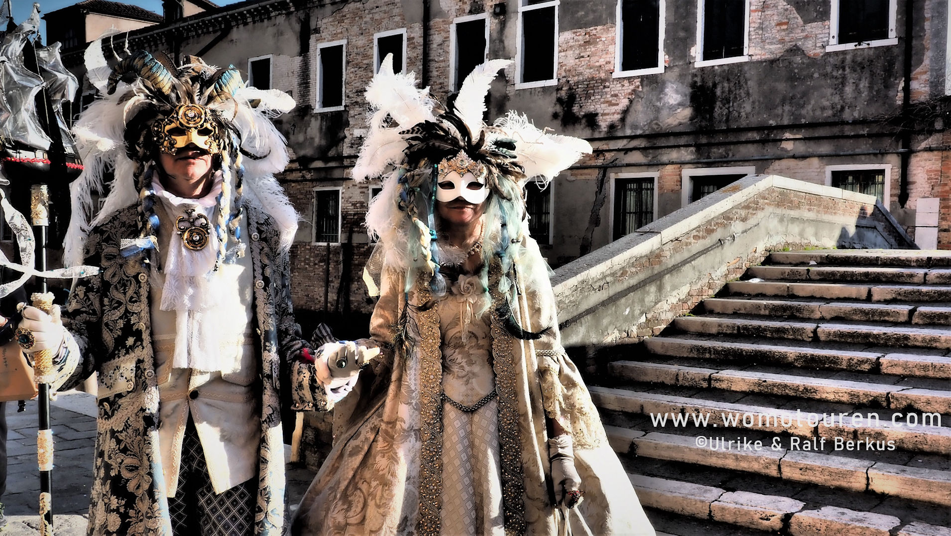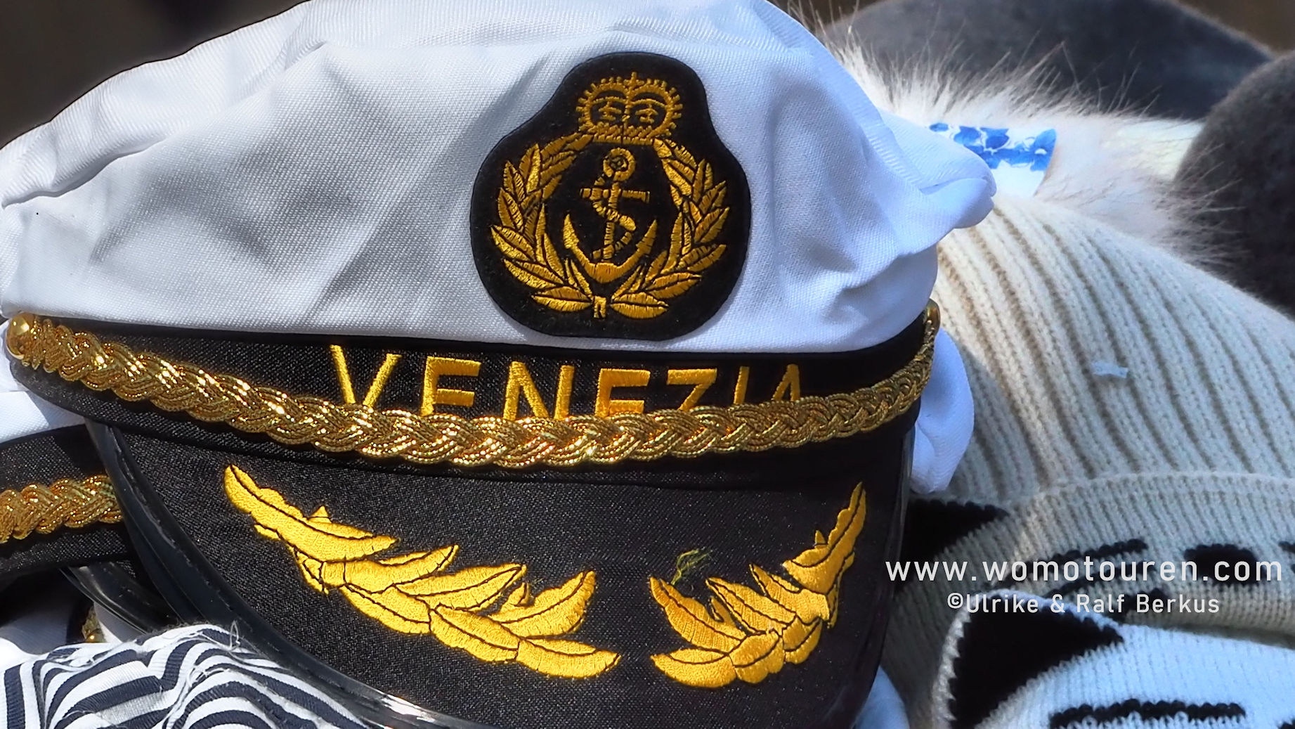 Wir verabschieden uns gegen 17 Uhr bei Paula und Raffaela und nehmen den Weg durch das Ghetto zur Haltestelle Guglie, aber nicht ohne unterwegs noch ein paar leckere Fritelle (Traditionsgebäck zur Faschingszeit) mit Zabaione zu erwerben. Dieses Mal fahren wir mit dem Vaporetto über die Piazza di Roma und Guidecca nach Zaccharia am Riva di Schiavoni. Genau zum Sonnenuntergang erreichen wir San Marco. Es ist nicht mehr sehr viel los, aber die ein oder andere schöne Maske ist noch da…und leider auch sehr unverschämte Fotografen…
