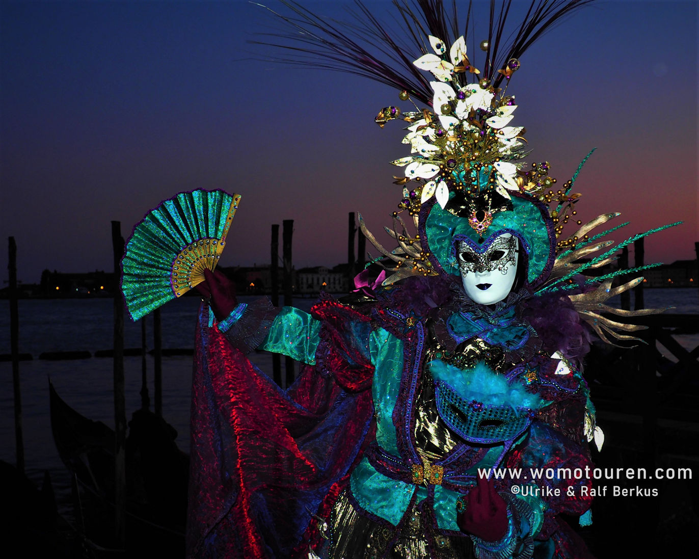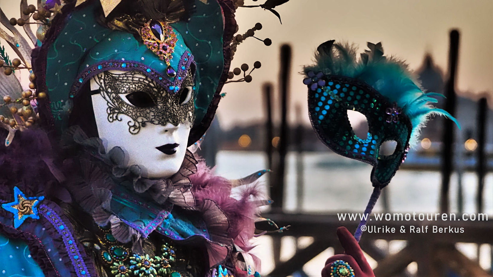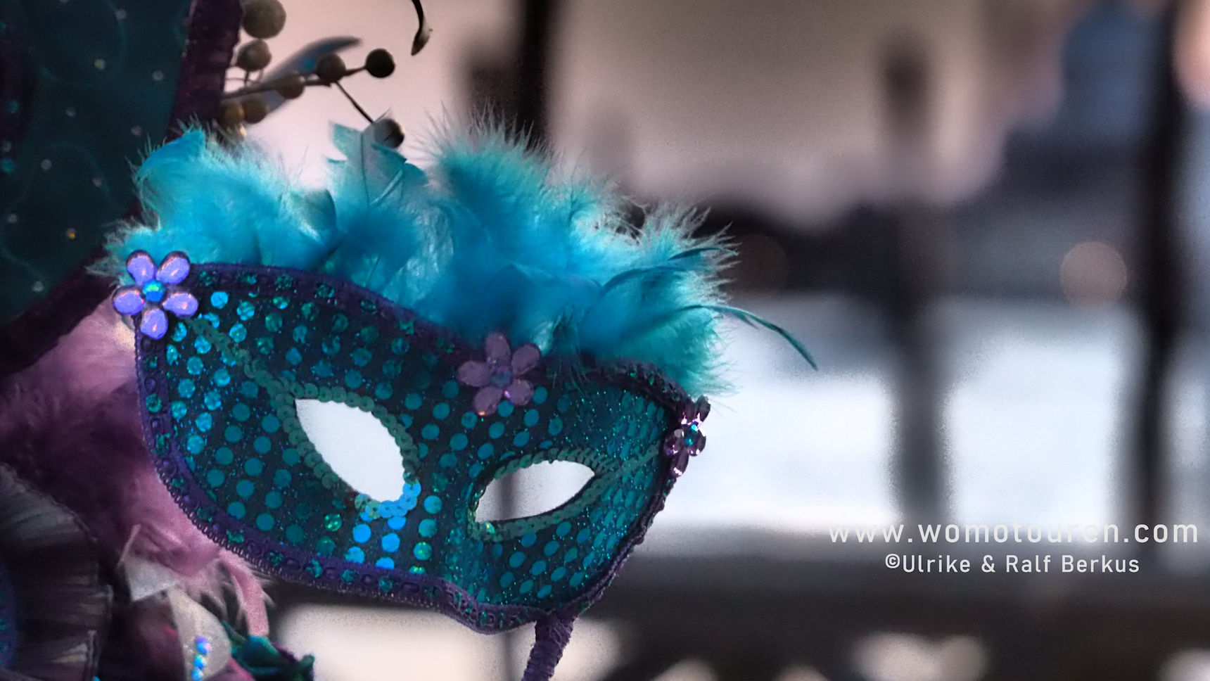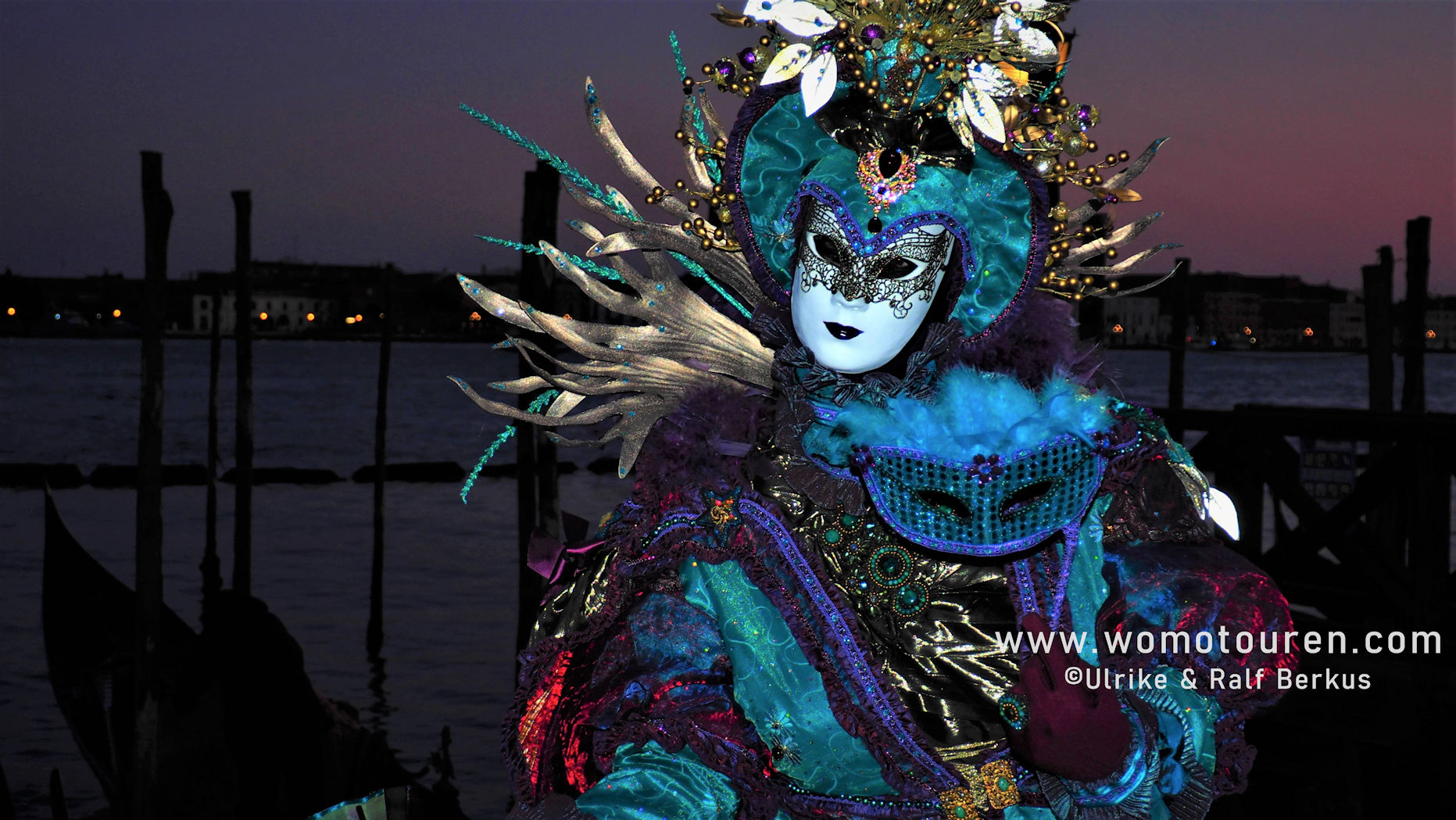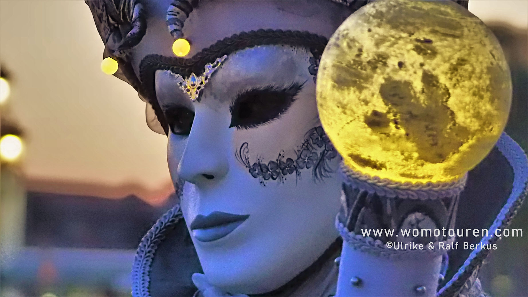 Wir verabschieden uns gegen 17 Uhr bei Paula und Raffaela und nehmen den Weg durch das Ghetto zur Haltestelle Guglie, aber nicht ohne unterwegs noch ein paar leckere Fritelle (Traditionsgebäck zur Faschingszeit) mit Zabaione zu erwerben. Dieses Mal fahren wir mit dem Vaporetto über die Piazza di Roma und Guidecca nach Zaccharia am Riva di Schiavoni. Genau zum Sonnenuntergang erreichen wir San Marco. Es ist nicht mehr sehr viel los, aber die ein oder andere schöne Maske ist noch da…und leider auch sehr unverschämte Fotografen…