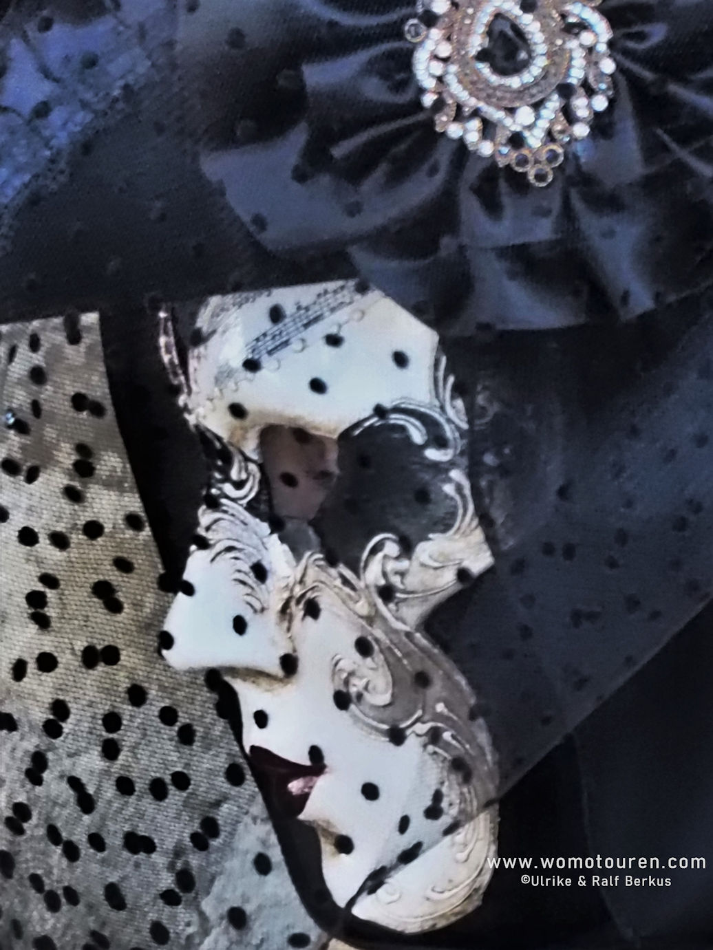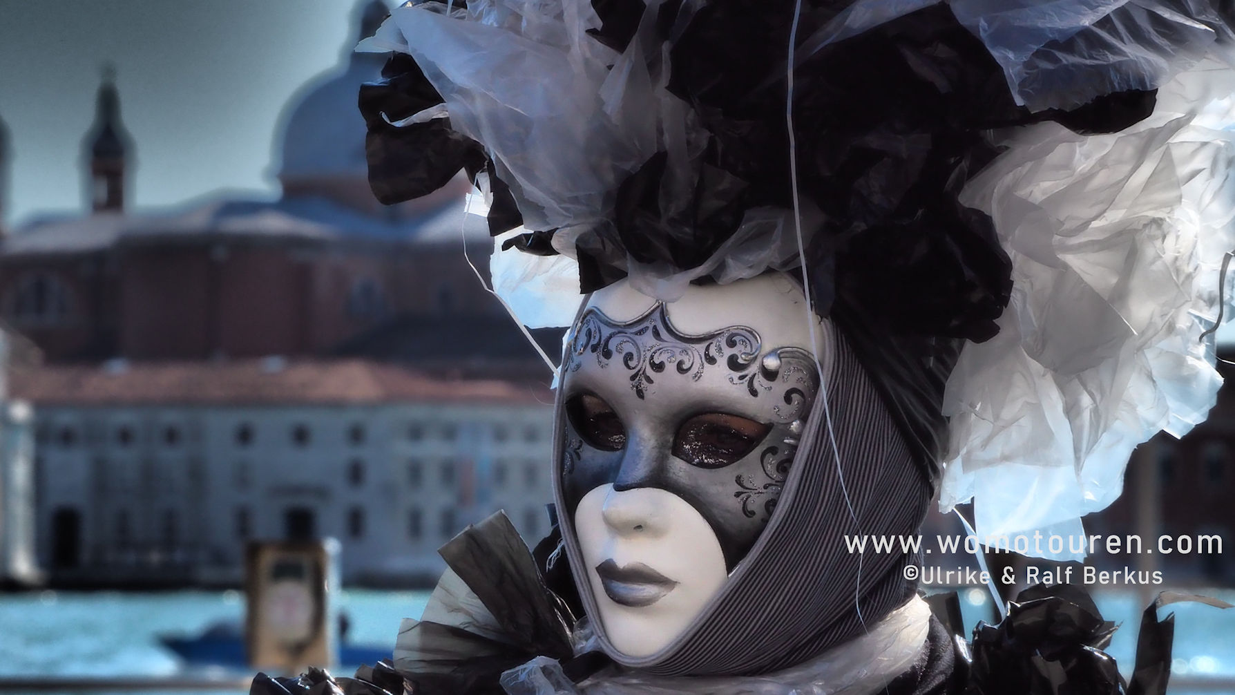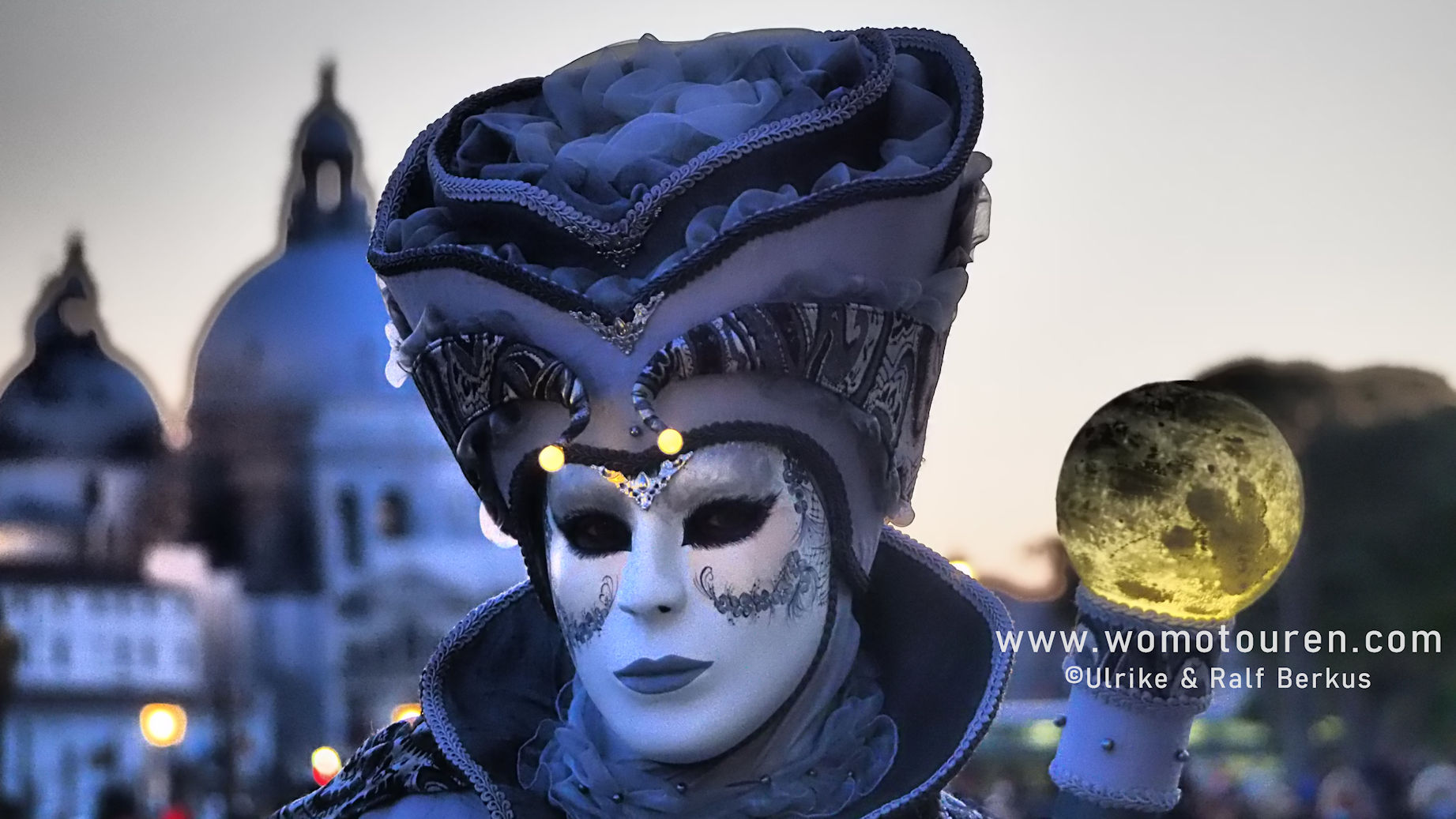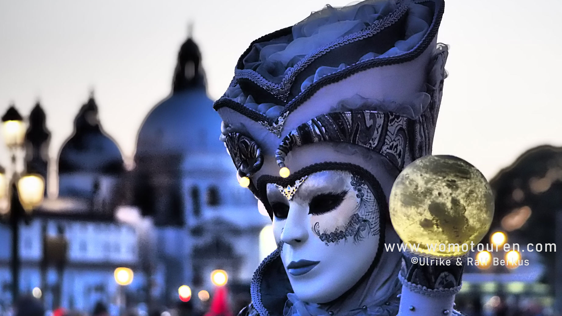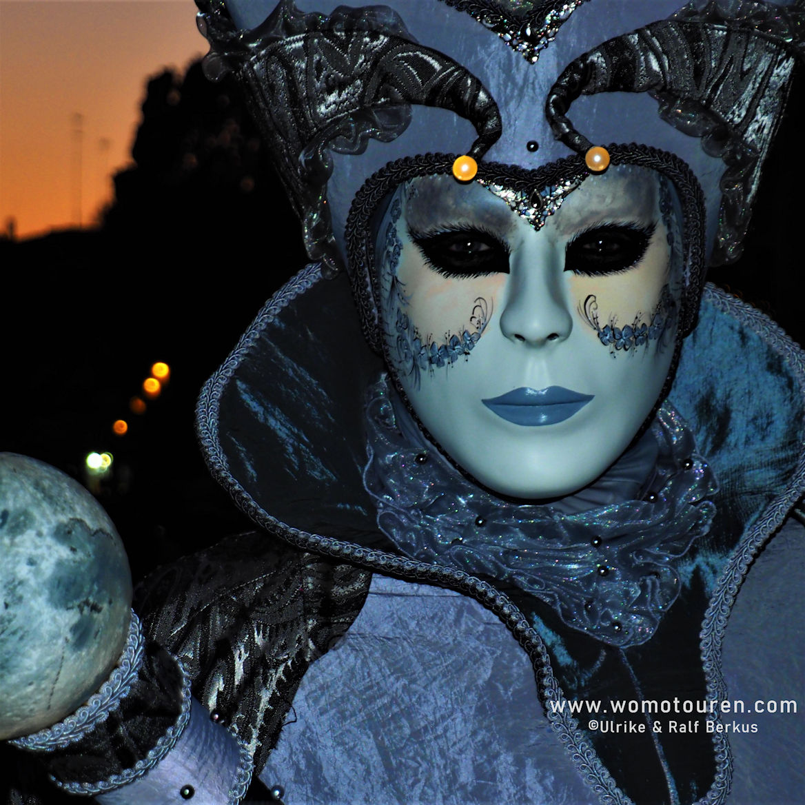Wir verabschieden uns gegen 17 Uhr bei Paula und Raffaela und nehmen den Weg durch das Ghetto zur Haltestelle Guglie, aber nicht ohne unterwegs noch ein paar leckere Fritelle (Traditionsgebäck zur Faschingszeit) mit Zabaione zu erwerben. Dieses Mal fahren wir mit dem Vaporetto über die Piazza di Roma und Guidecca nach Zaccharia am Riva di Schiavoni. Genau zum Sonnenuntergang erreichen wir San Marco. Es ist nicht mehr sehr viel los, aber die ein oder andere schöne Maske ist noch da…und leider auch sehr unverschämte Fotografen…