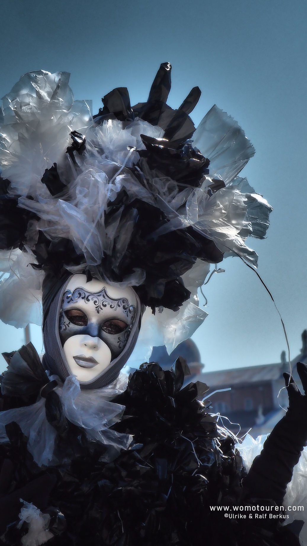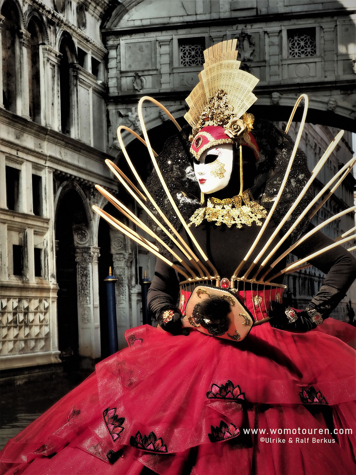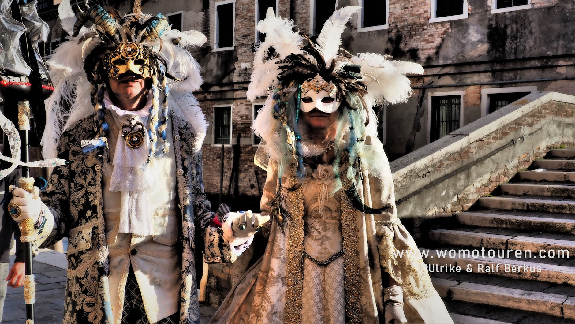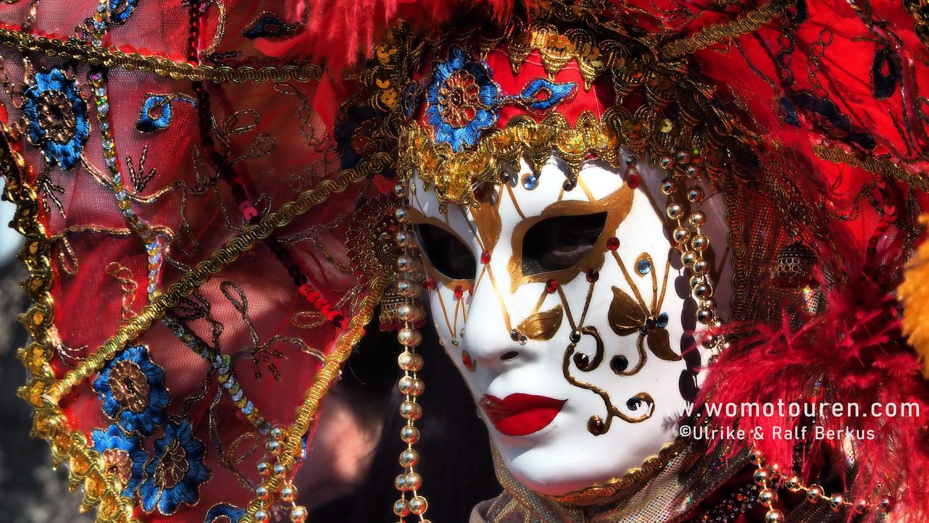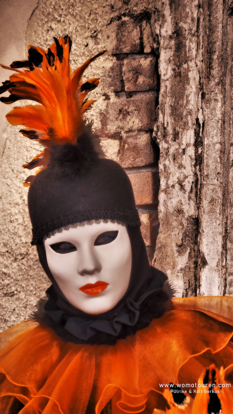 Wir verabschieden uns gegen 17 Uhr bei Paula und Raffaela und nehmen den Weg durch das Ghetto zur Haltestelle Guglie, aber nicht ohne unterwegs noch ein paar leckere Fritelle (Traditionsgebäck zur Faschingszeit) mit Zabaione zu erwerben. Dieses Mal fahren wir mit dem Vaporetto über die Piazza di Roma und Guidecca nach Zaccharia am Riva di Schiavoni. Genau zum Sonnenuntergang erreichen wir San Marco. Es ist nicht mehr sehr viel los, aber die ein oder andere schöne Maske ist noch da…und leider auch sehr unverschämte Fotografen…
