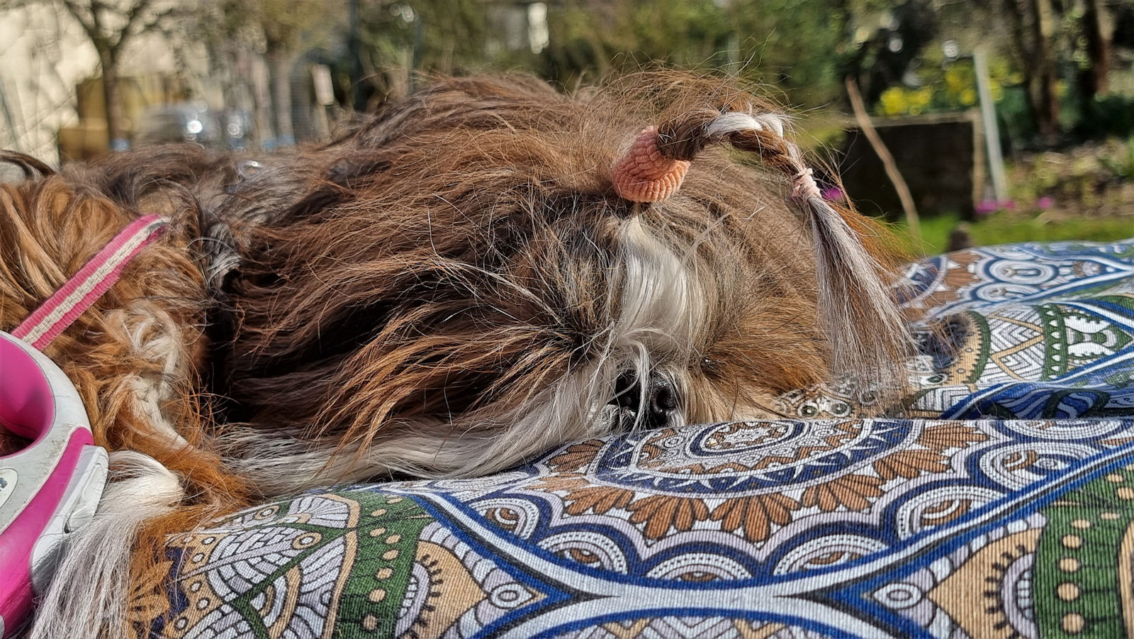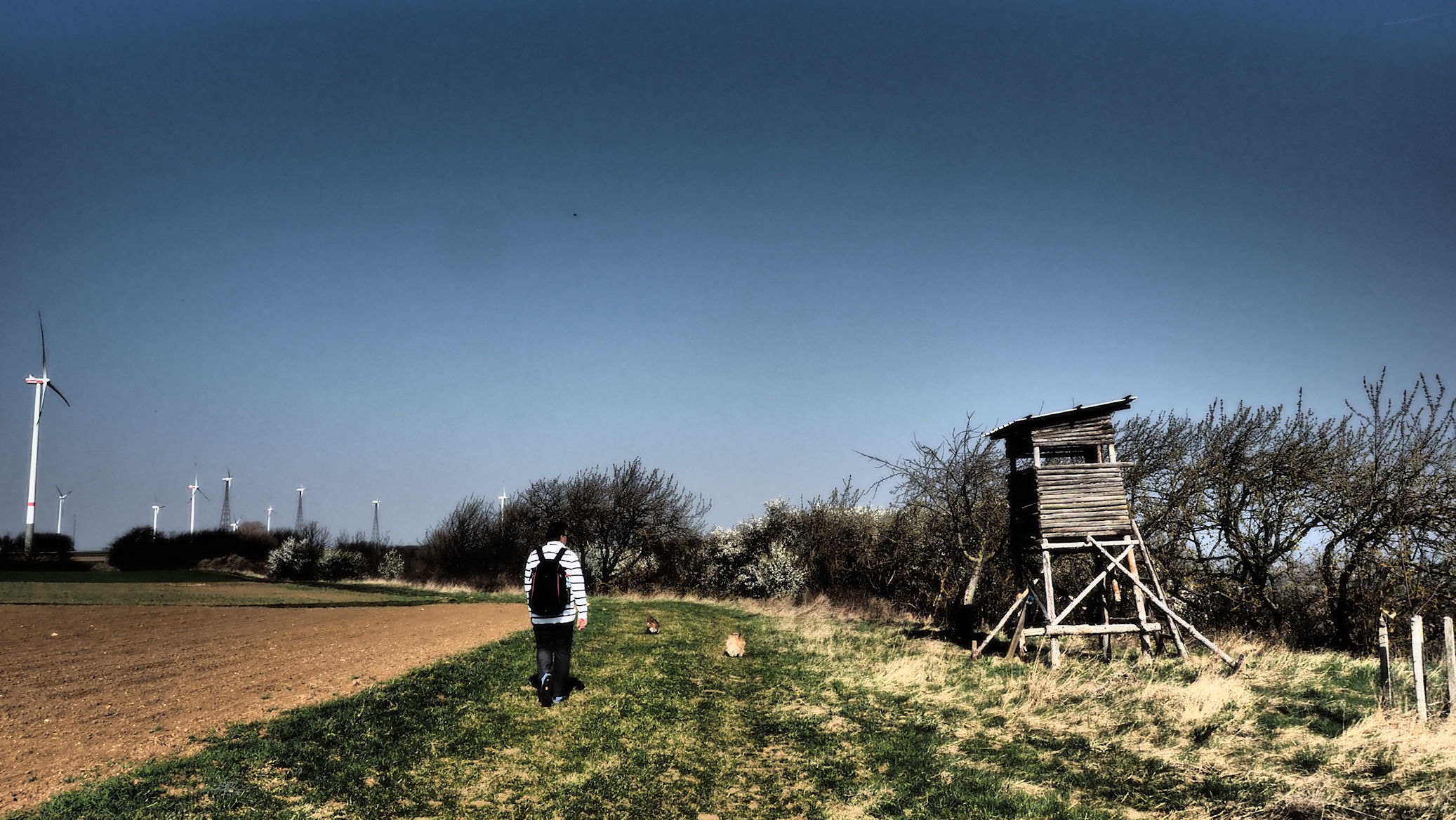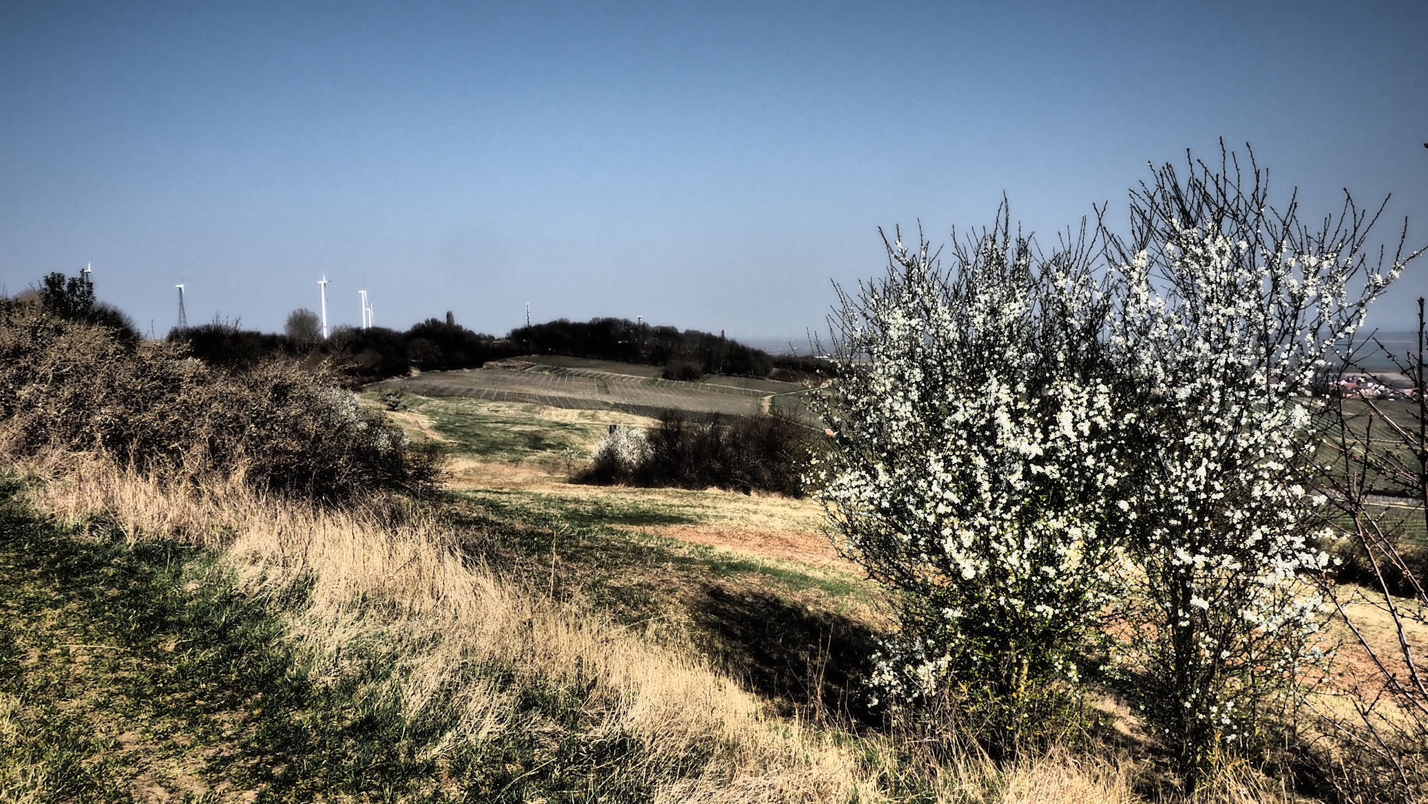 Die Landschaft wirkt ein wenig unwirklich: links alles voller Windräder und ein wenig Ostseefeeling ohne Meer, rechts alles voller blühender Sträucher und wundervolle Ausblick auf die sanften Weinhügel Rheinhessens. Wie auch immer. Es ist etwas Abstand zwischen dem Hier und Jetzt und dem, was in den nächsten Tagen und Wochen so passieren wird. Und es lenkt ab, macht den Kopf frei und tut, wie bereits beschrieben, nicht nur den beiden Fellzwergen sondern auch uns beiden gut.
