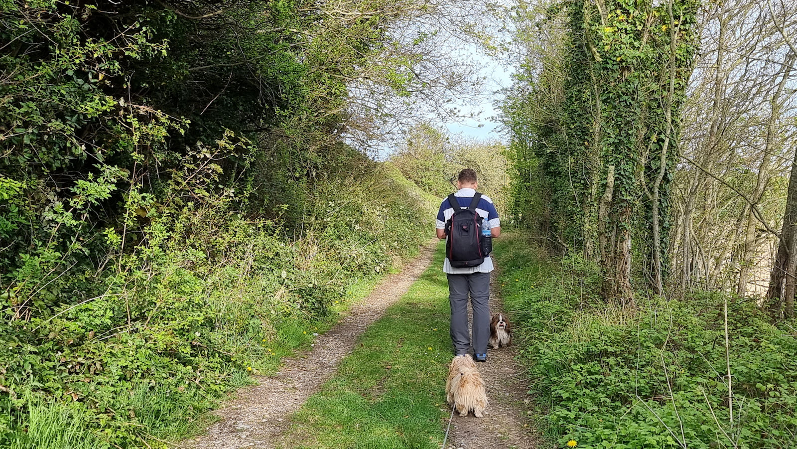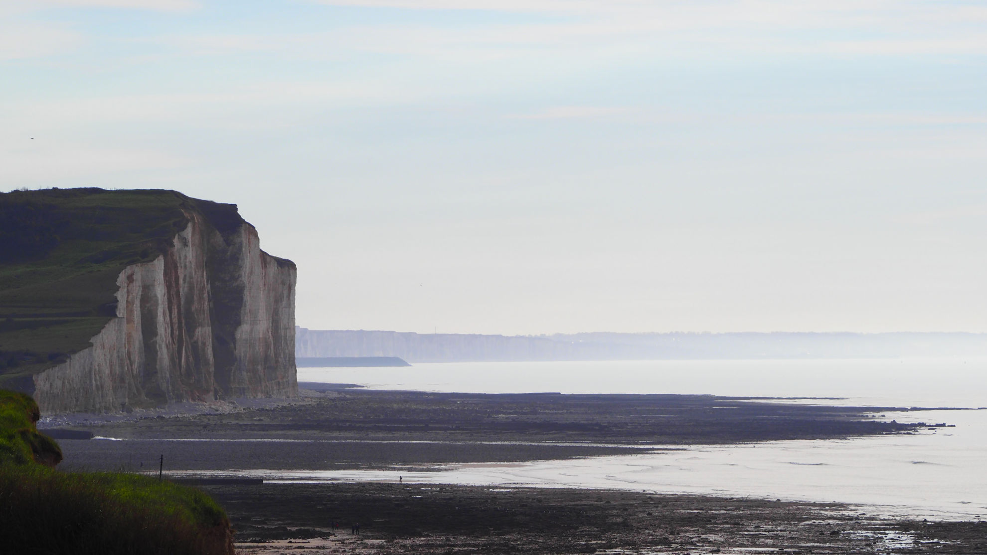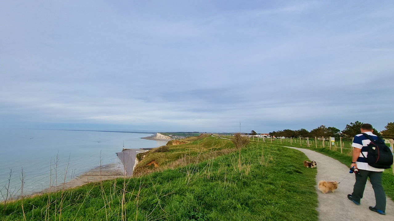 Mit herrlichem Ausblick übers Meer führt der Weg auf den Kreideklippen entlang bis in den „noch“ verschlafenen Nachbarort. Für alle, die den Weg gerne nachgehen möchten: vor Mesnil ist ein Stacheldraht auf dem Boden, aber der Weg führt dahinter weiter. (Nach einiger Zeit ist er aber nicht mehr gesichert und man sollte nicht den gleichen Fehler machen wie wir! Einfach ein Stück Straße in Kauf nehmen!) Der erste Teil des Wegs läuft sich noch relativ normal, aber dann ist er übersäht mit Brombeertrieben, die gefährliche Stolperfallen sein können. Entlang zwischen Stacheldraht und Steilwand waren wir froh, als wir, natürlich mit den Fellzwergen unterm Arm, das etwa 800 m lange Teilstück ohne einen Sturz geschafft hatten. Bei unserer kleinen Pause oberhalb des Strandes planen wir unseren Rückweg um. Durch den verschlafenen Ort erreichen wir schöne Feldwege. Klar mit weniger Aussicht, aber sicherer für uns und vor allem die Pfoten von Allie und Amadeo.