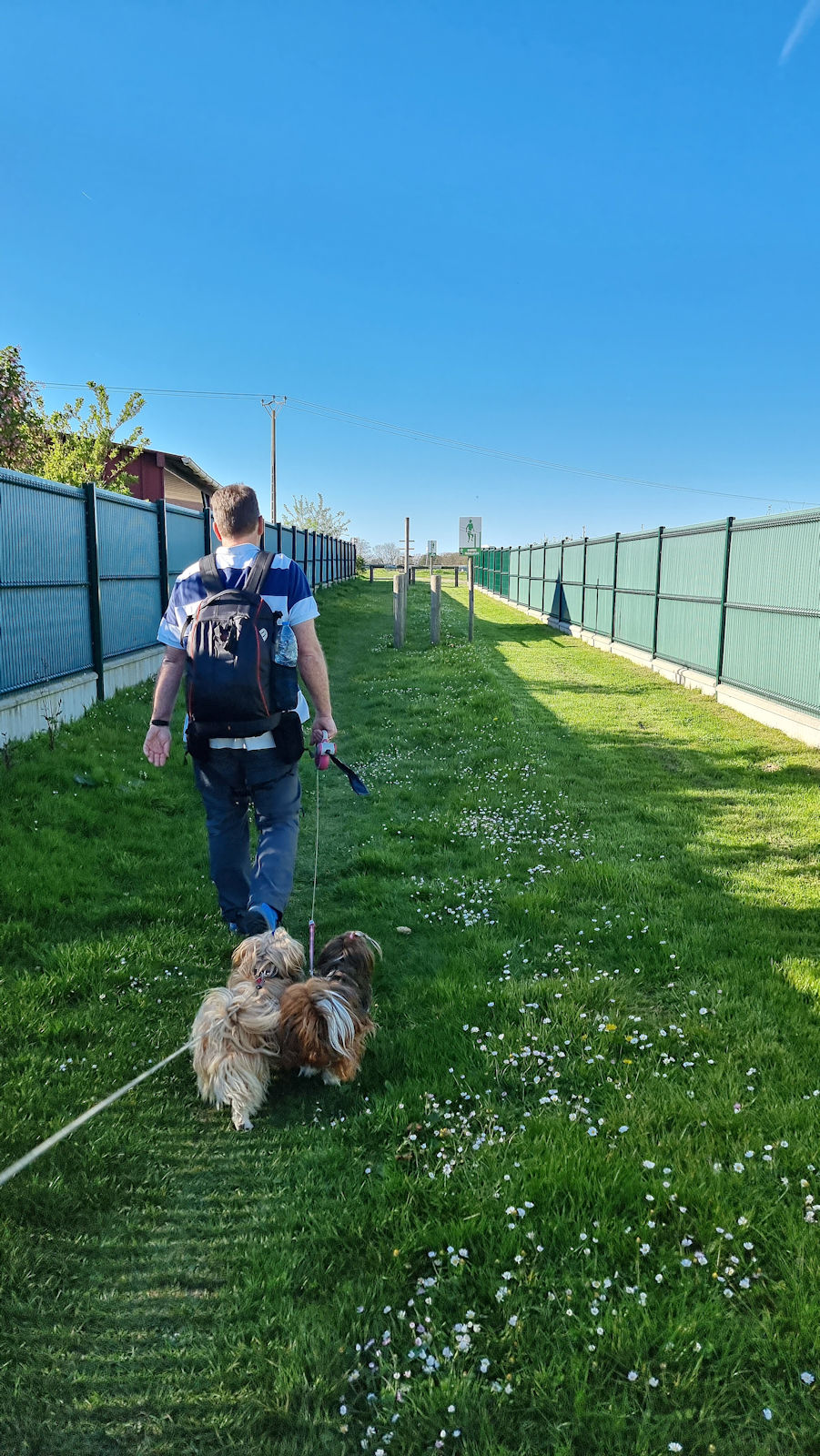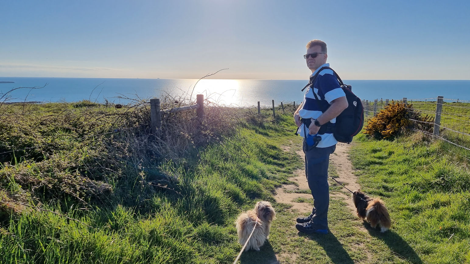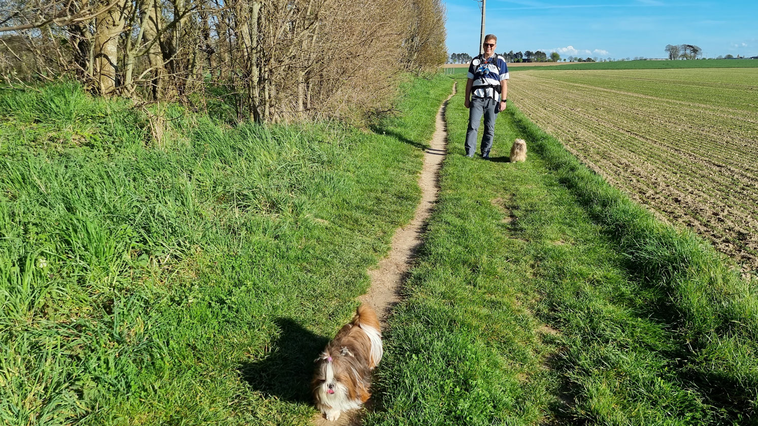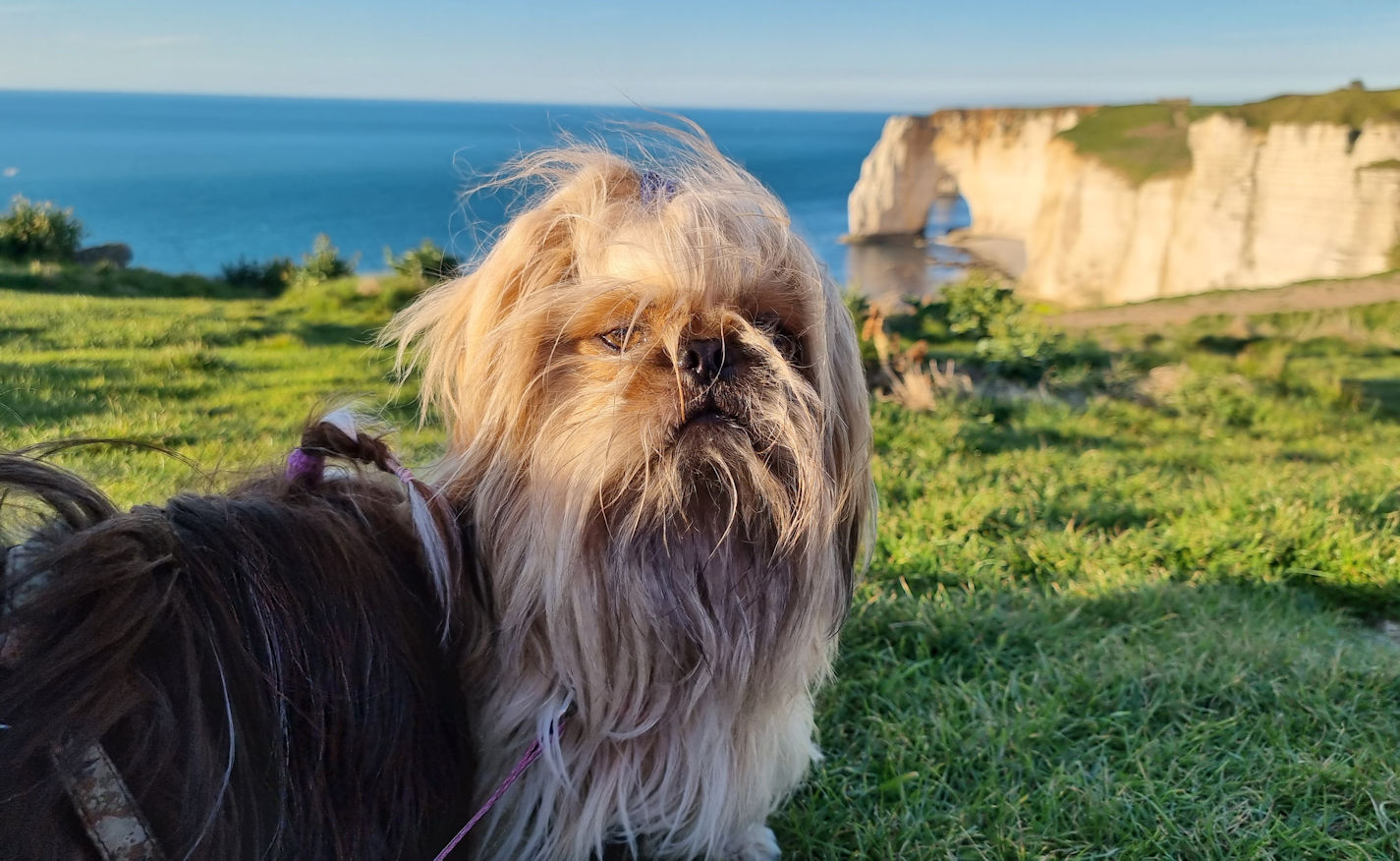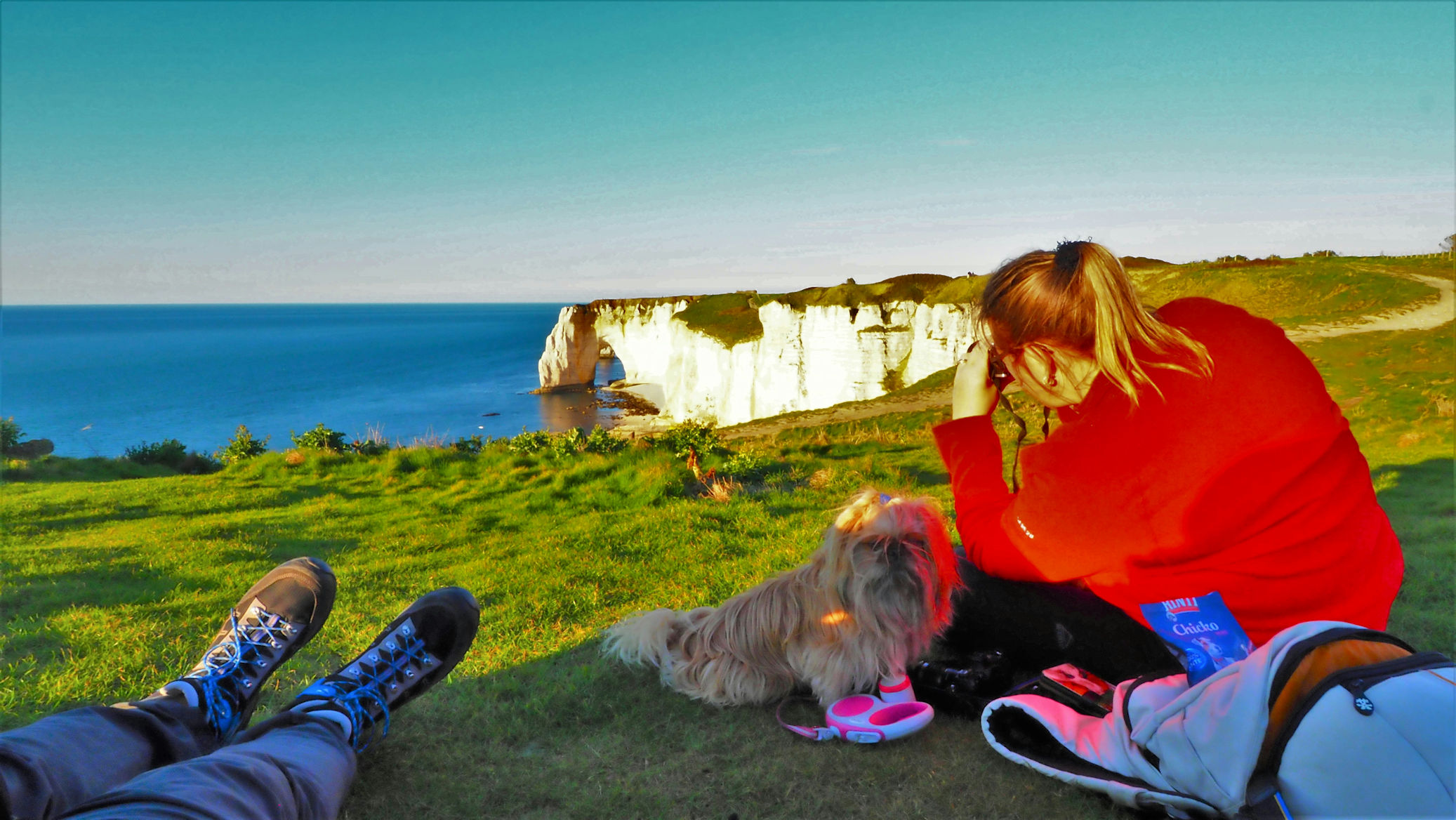 Der Stellplatz ist schön und ruhig, der Himmel heute stahlblau und am Nachmittag ist die Sonne schon fast aufdringlich. Schön zum Ausruhen und Abendspaziergang planen…Unsere Wanderapp empfiehlt uns eine Tour zu den Falaises, den hier typischen Kreidefelsen. Gerne würden wir diese natürlich im Sonnenuntergang sehen, aber es ist ca. 1 Stunde zu Fuss dahin. Und im Dunkeln wollen wir unsere Fellzwerge nicht durch unbekanntes Terrain schicken.