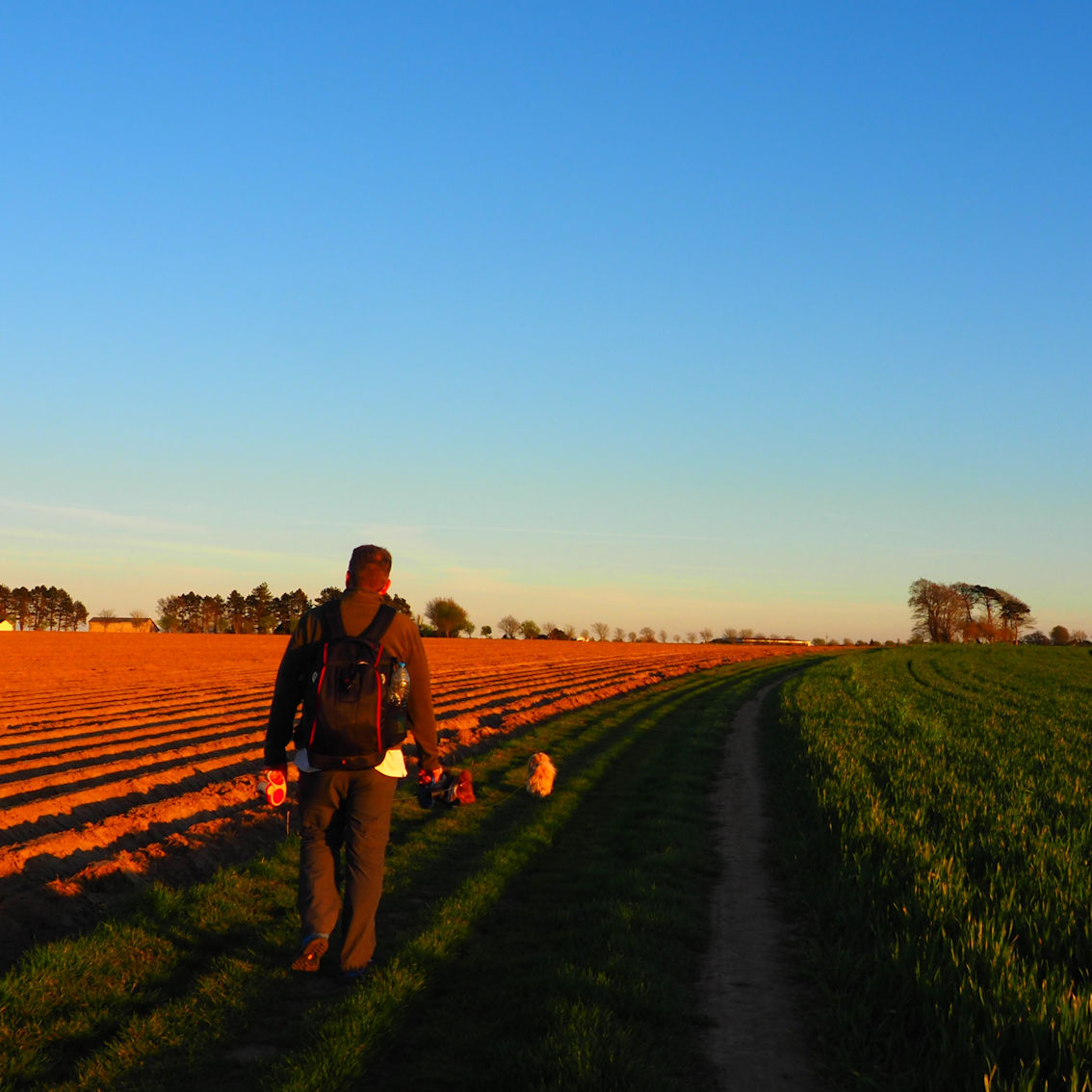 So kommt es, dass wir schon gegen 18 Uhr zu unserer Tour aufbrechen. Über schöne und gut laufbare Wiesenwege geht es bei etwa 20 Grad in Richtung Meer, dass man gut am Horizont erkennen kann.