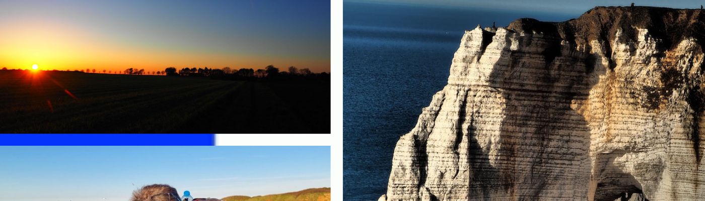 Der Stellplatz ist schön und ruhig, der Himmel heute stahlblau und am Nachmittag ist die Sonne schon fast aufdringlich. Schön zum Ausruhen und Abendspaziergang planen…Unsere Wanderapp empfiehlt uns eine Tour zu den Falaises, den hier typischen Kreidefelsen. Gerne würden wir diese natürlich im Sonnenuntergang sehen, aber es ist ca. 1 Stunde zu Fuss dahin. Und im Dunkeln wollen wir unsere Fellzwerge nicht durch unbekanntes Terrain schicken.