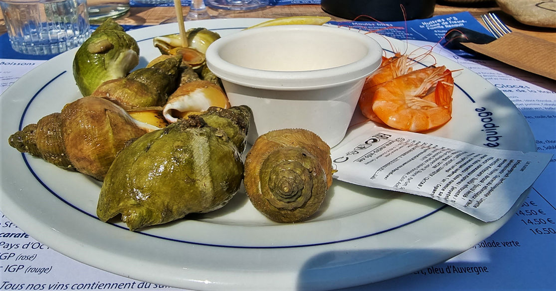 Unser Menü besteht aus leckerem Meeresgetier mit Spezialmayonnaise des Hauses. Ralf wählt Fish and Chips und Ulli erfreut sich an Moules aux Frites. Dazu ein Weißwein und noch viel wichtiger:
