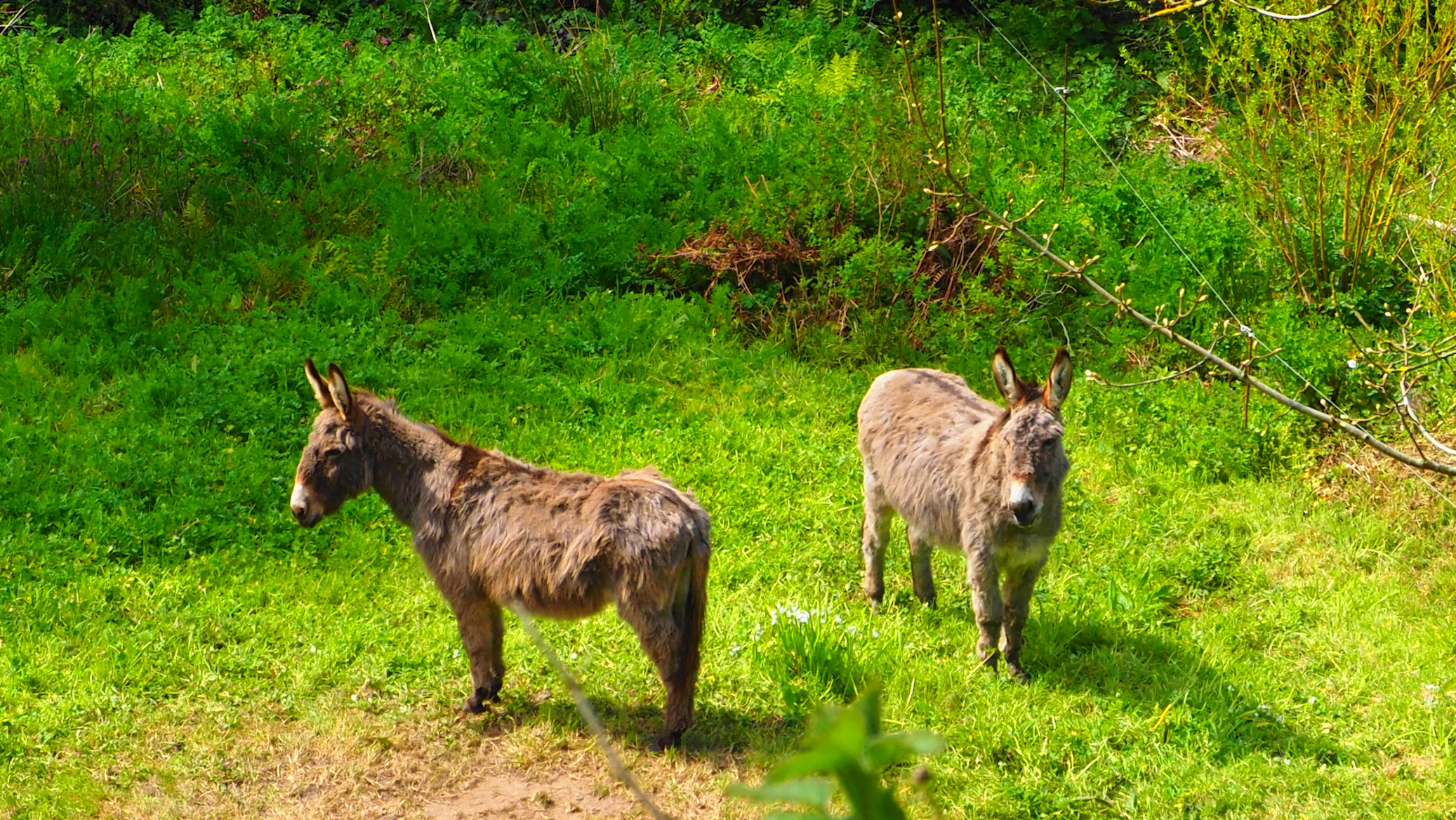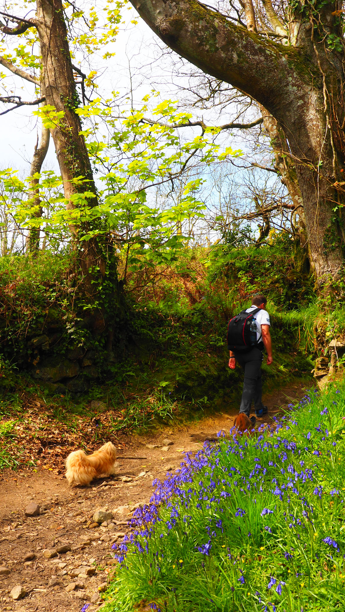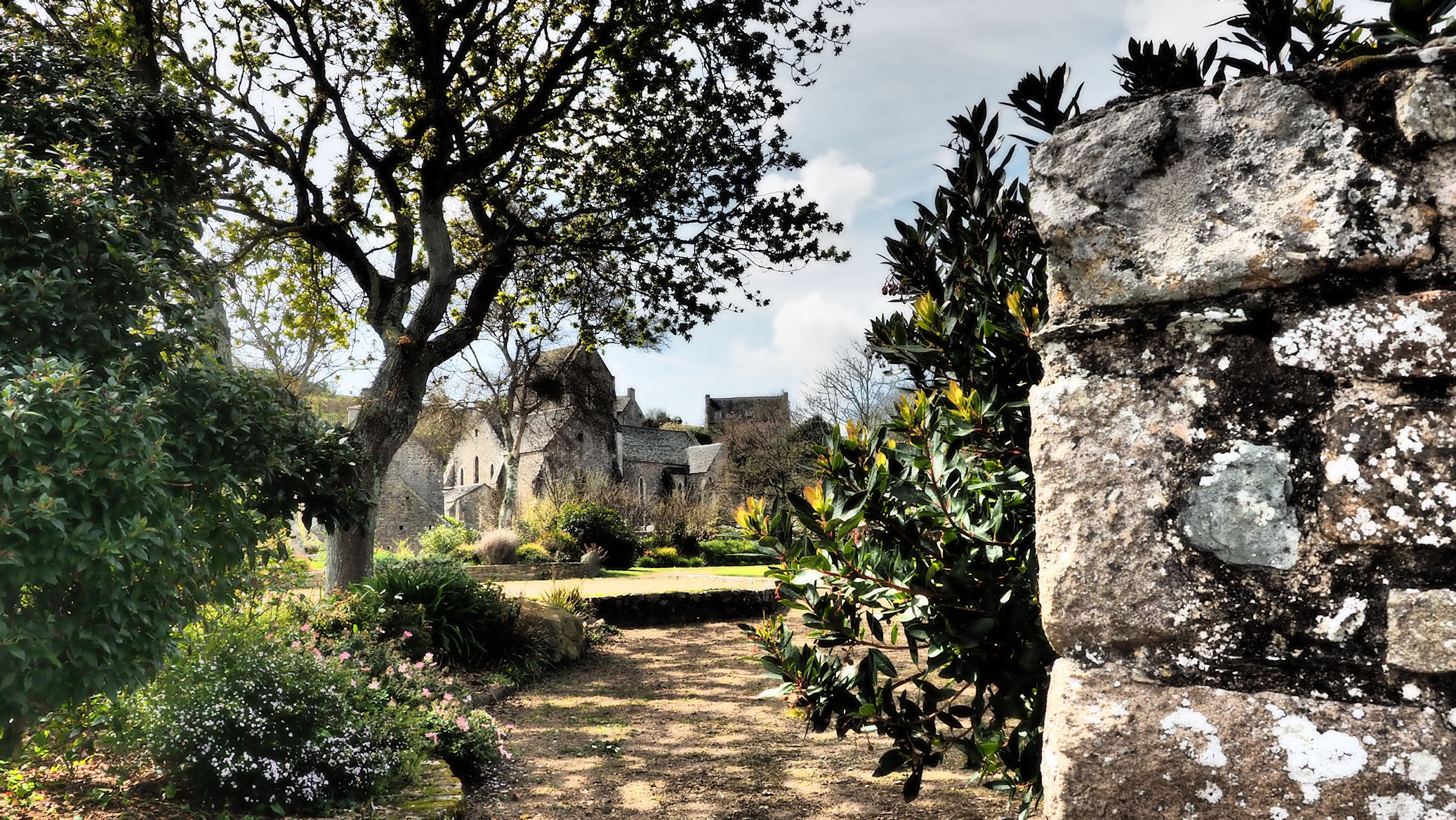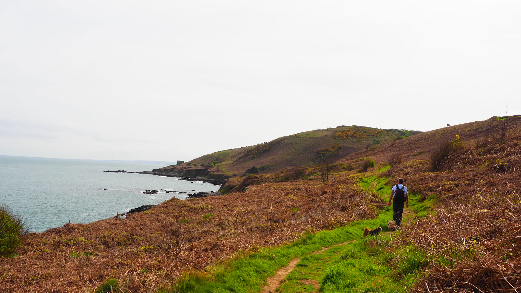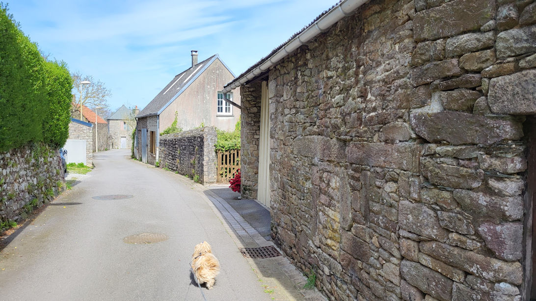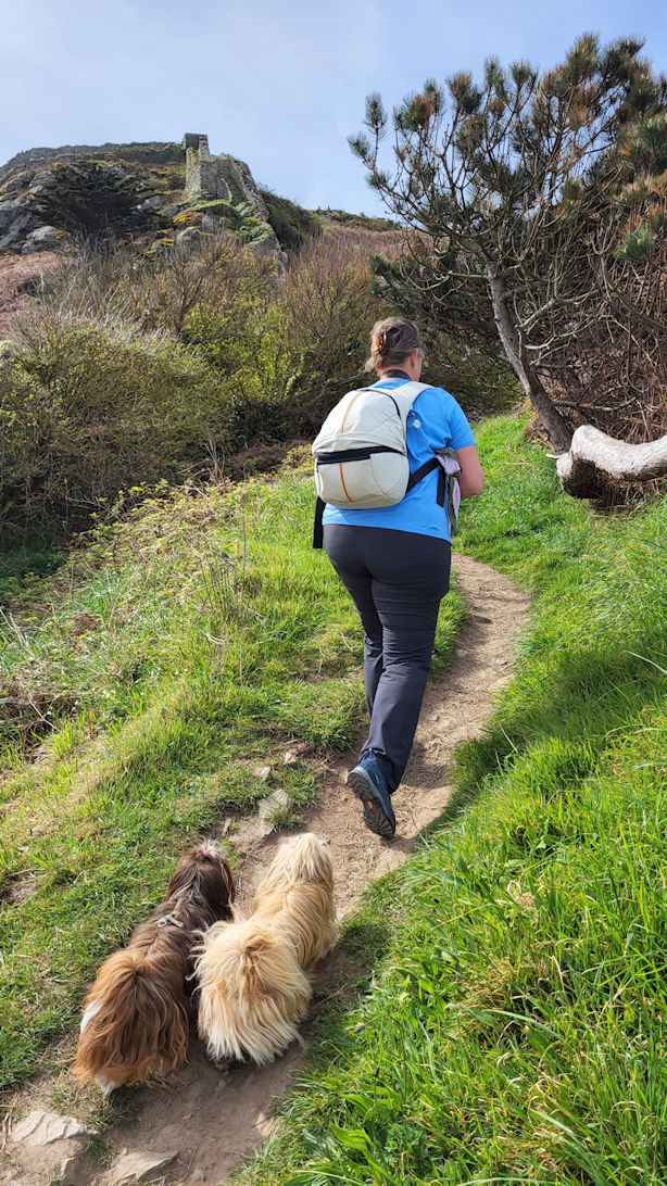 Nach guten 4 Kilometer verlassen wir den Küstenweg. Auf engen Pfaden durch dicht bewachsene und blühende Wälder mit immer wieder tollen Ausblicken auf’s Meer, gelangen wir ans Manoir de Tourpp. Mittagspause! Das mitgebrachte Käsebrot schmeckt herrlich und auch die Fellnasen haben sich nach nun etwa 7 km ihre Mittagessen verdient. Nach gut einer halben Stunde Pause geht es dann den Rest des Weges abseits der Küste wieder zu unserem kleinen Camping.
