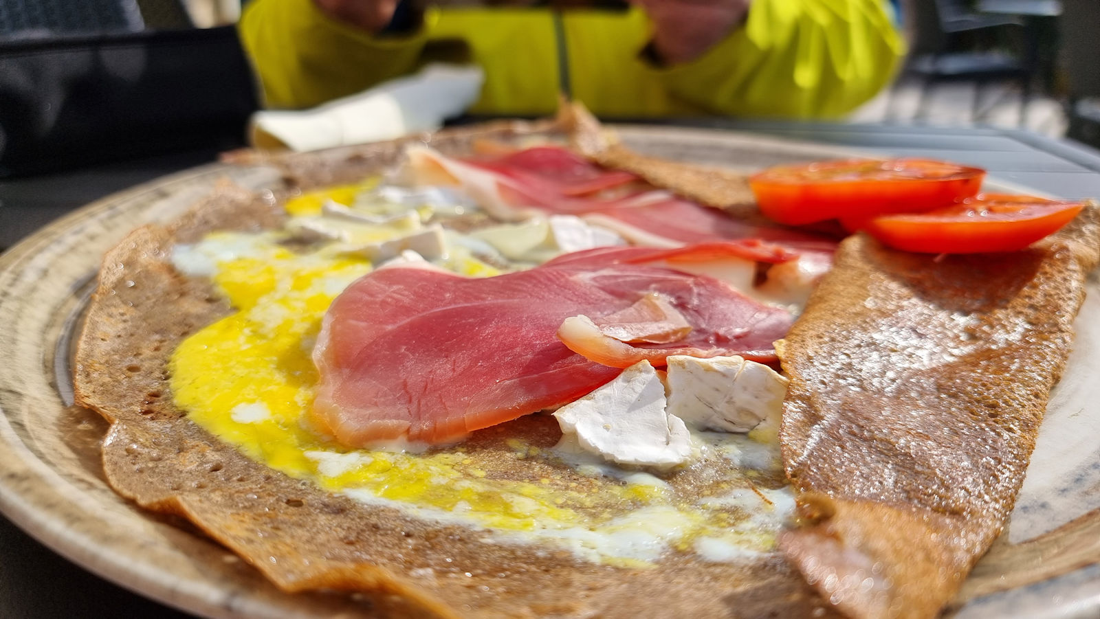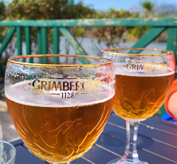 Wir bekommen einen tollen Tisch und das große Grimbergen als auch der Galette nach Art der Normandie munden jetzt besonders gut. Ein perfekt gelegener Ort für eine Pause auf dieser Tour. Die restlichen knapp 2 Kilometer gehen dann umso leichter und gegen halb 6 sind wir wieder zurück am Wohnmobilstellplatz.