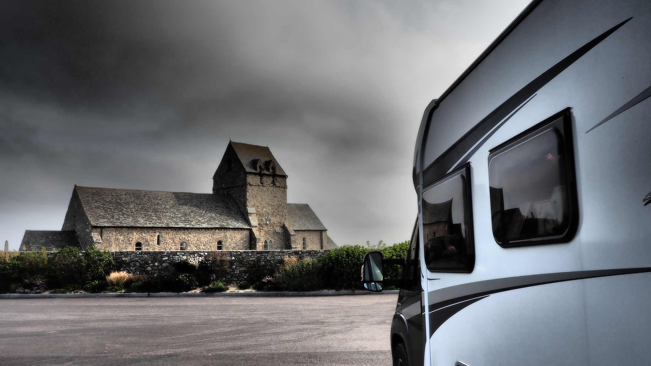 Dass das Cap de Jobourg heute unser Ziel sein wird, wissen wir noch nicht, als wir gegen halb neun den Stellplatz in Auderville verlassen. Unser nächster Stopp heißt: der beim letzten Besuch hier auf dem Cap Hague entdeckte Baguetteautomat. Dieser befindet sich in Jobourg an der Kirche.