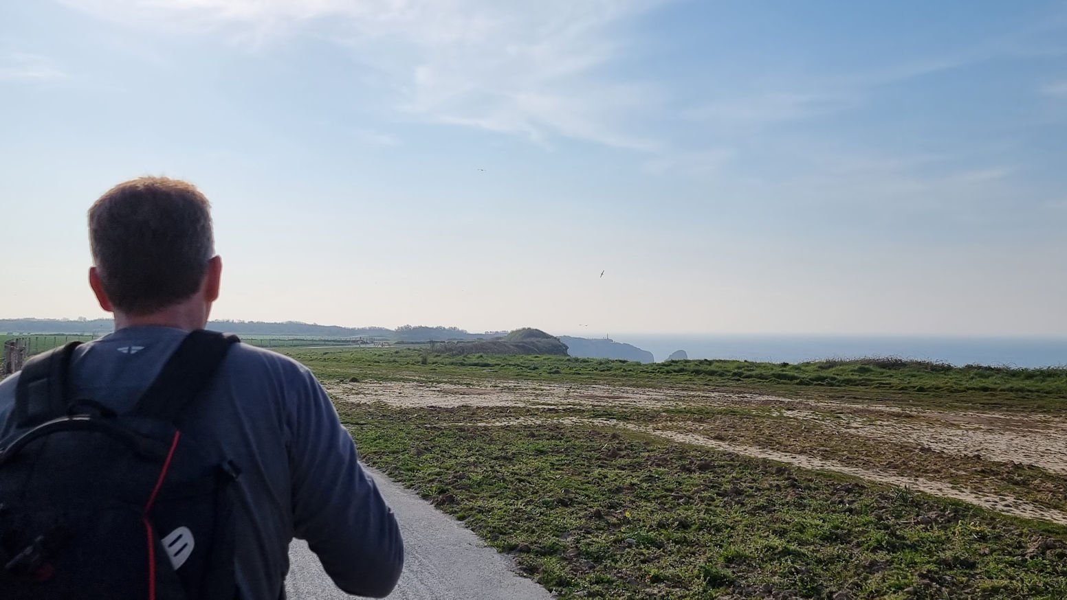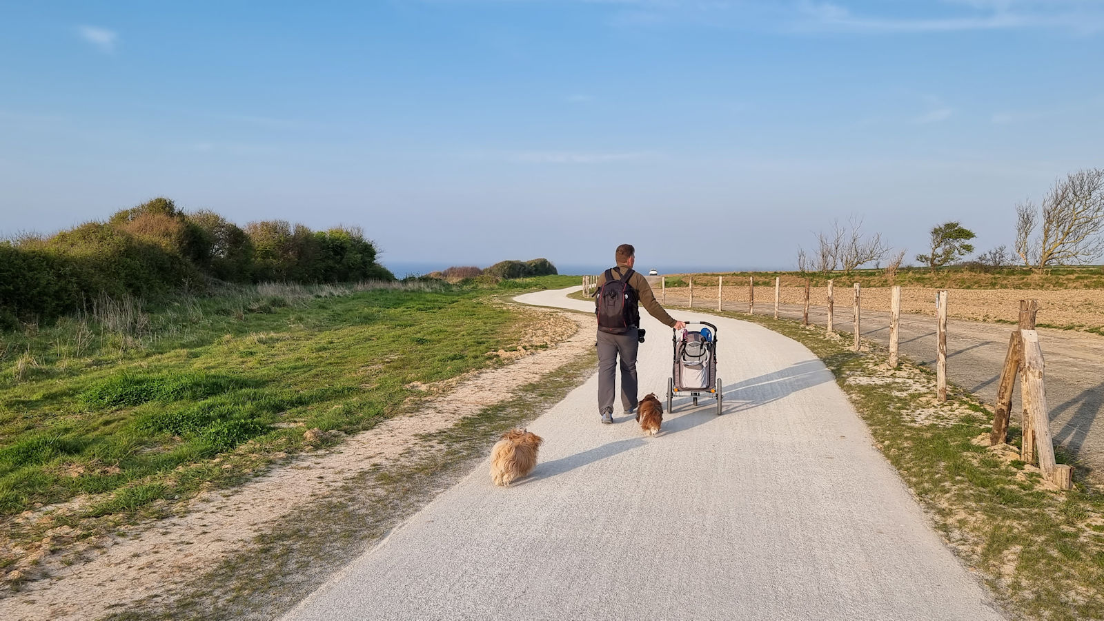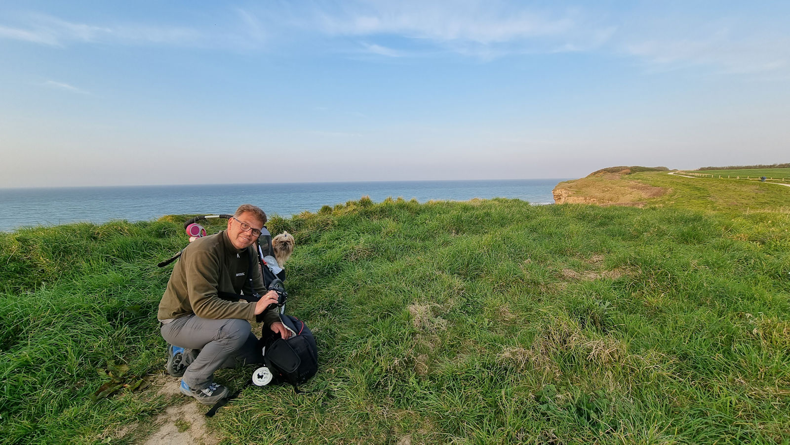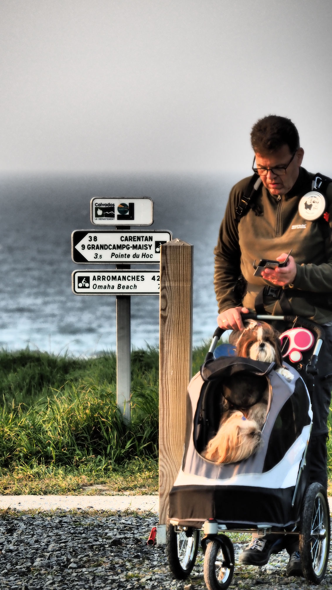 Gegen 18 Uhr beschließen wir kurzerhand, doch noch in Richtung Pointe du Hoc aufzubrechen. Der Weg gleicht einer Wanderautobahn, wegen der Pfotenruhe haben wir den Hundetransporter dabei und so schaffen wir es in einer knappen Stunde am Pointe du Hoc zu sein.