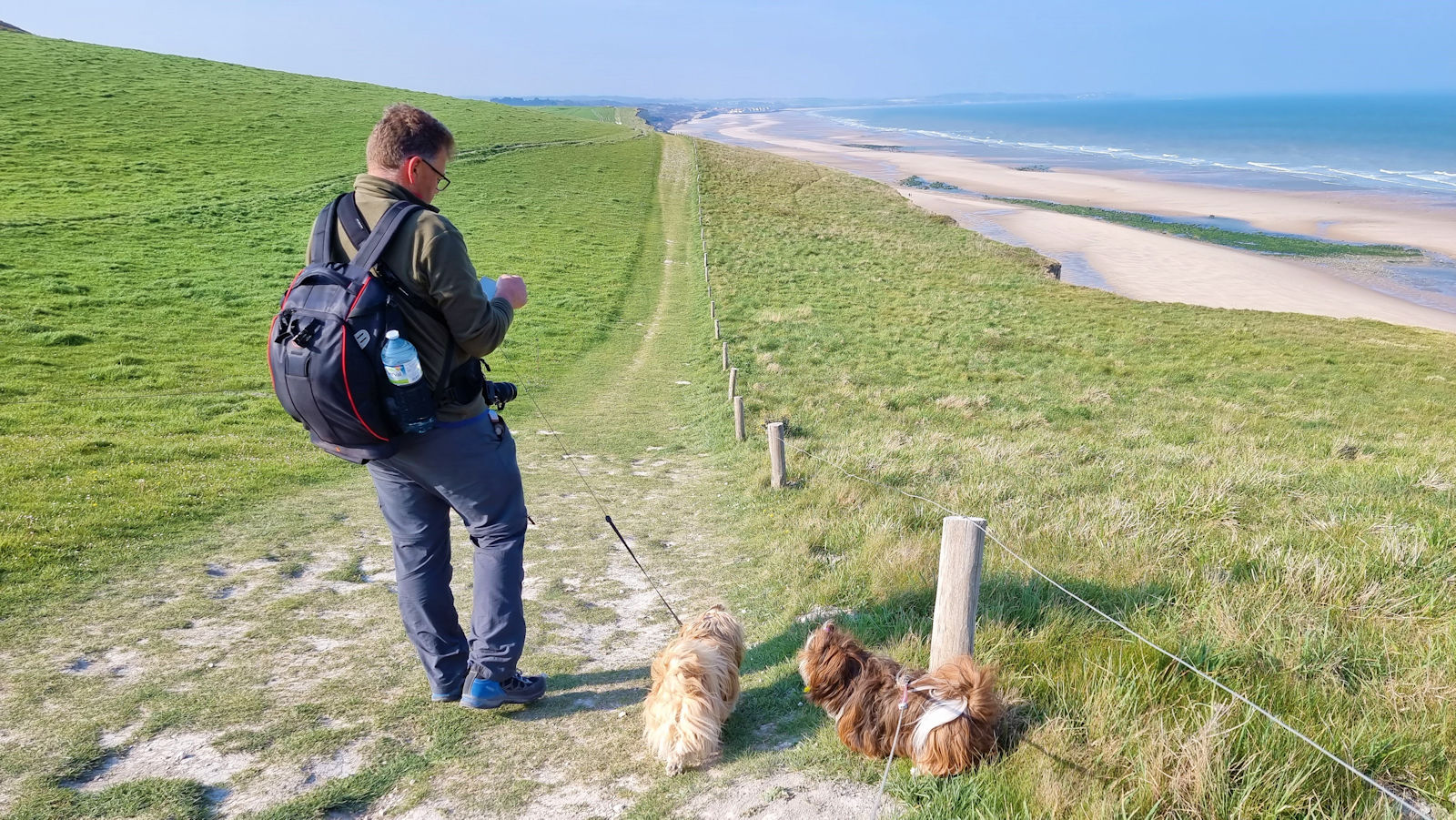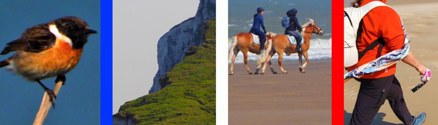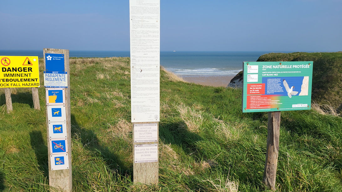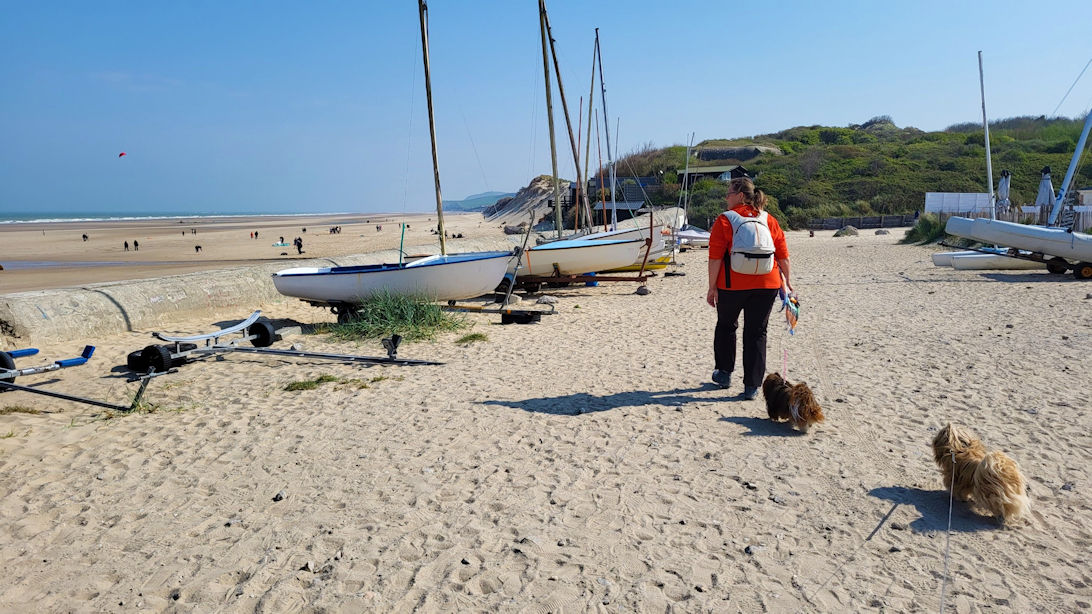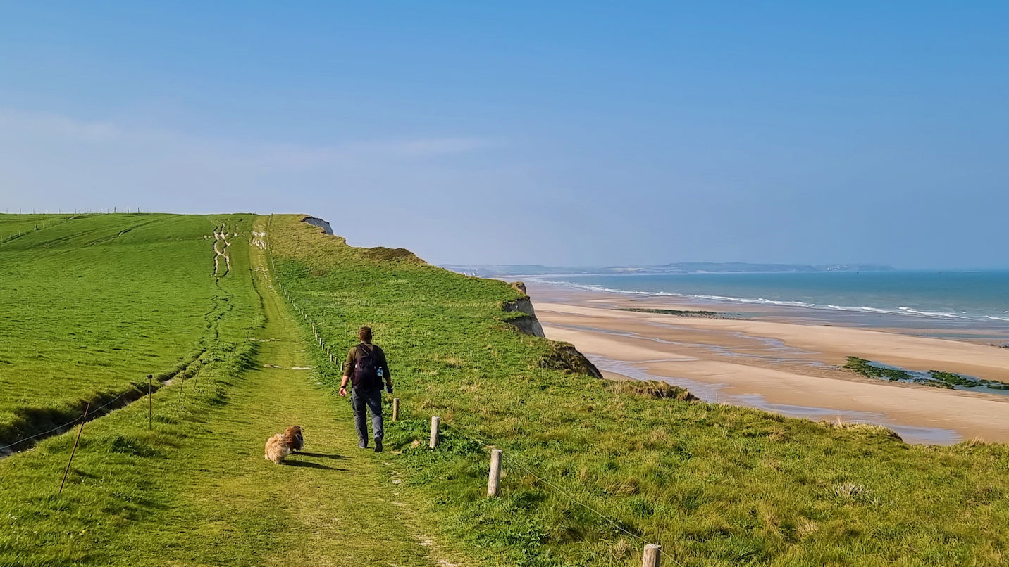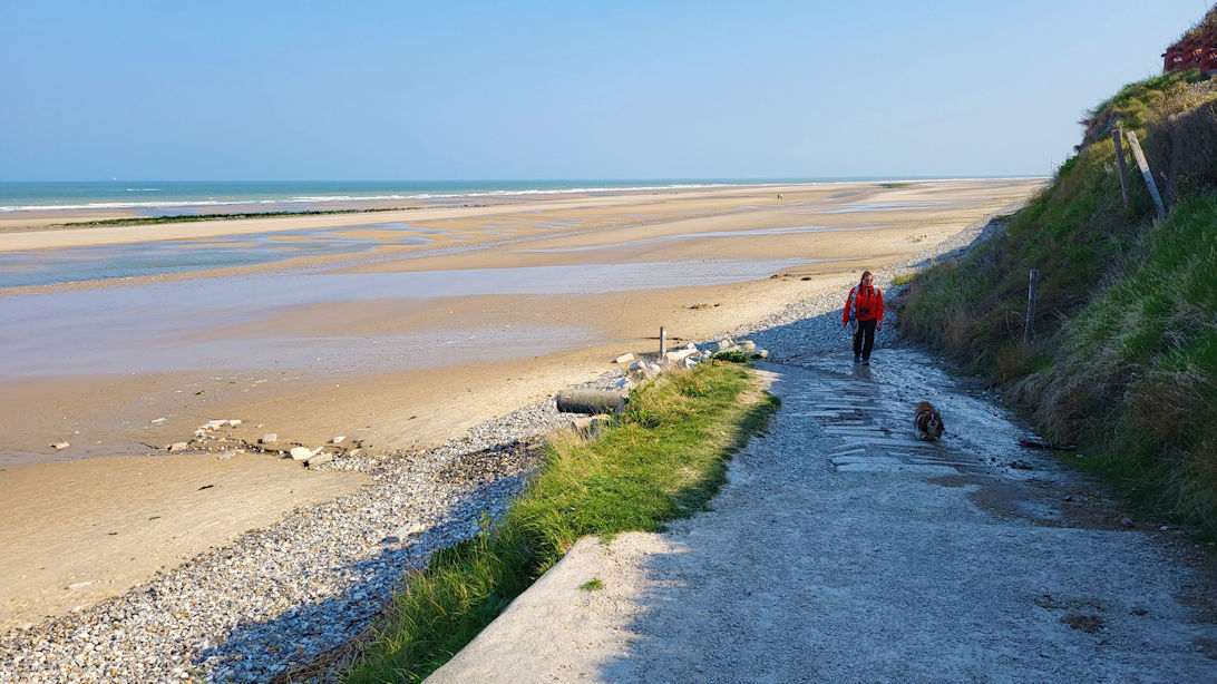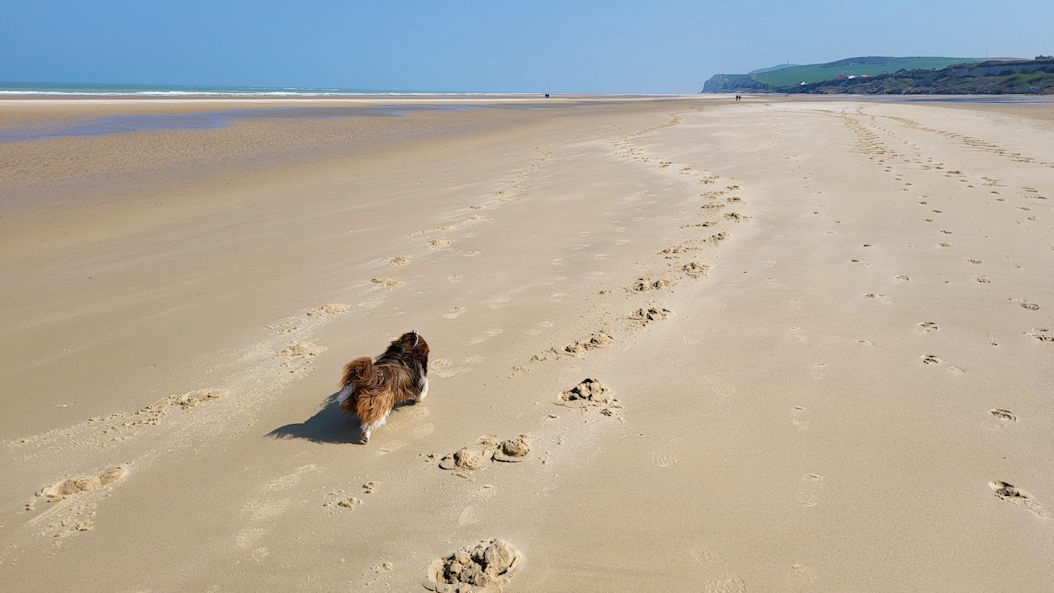 Der Himmel hat noch einige Wölckchen, aber ein wundervolles Blau schimmert schon durch. Gegen halb 10 sind wir startklar und laufen zum wenige 100 Meter entfernten Strandzugang (wichtige Info für Hundebesitzer: ab 15. Mai herrscht hier Hundeverbot am Strand!) Da gerade Ebbe ist und noch viel Wasser auf dem Strand steht, nehmen wir den Weg auf den Klippen in Richtung Wissant. Ein schöner Abschnitt mit tollen Ausblicken auf den endlosen Strand, die Dünen und die beiden Caps Blanc Nez und Gris Nez.