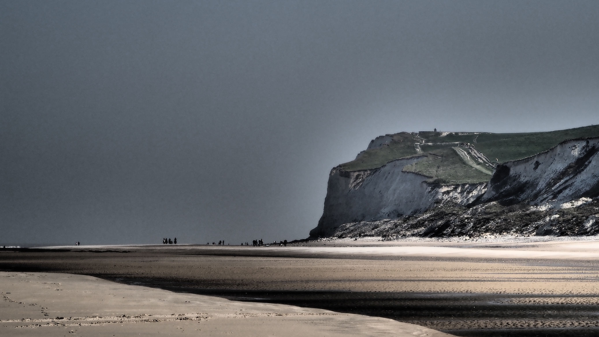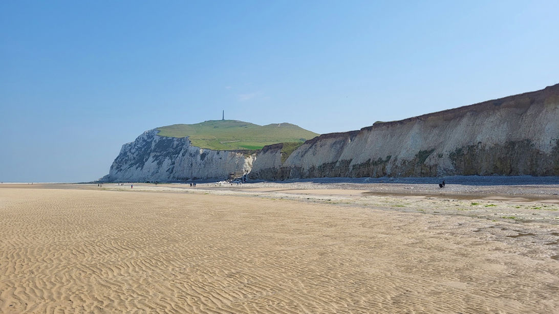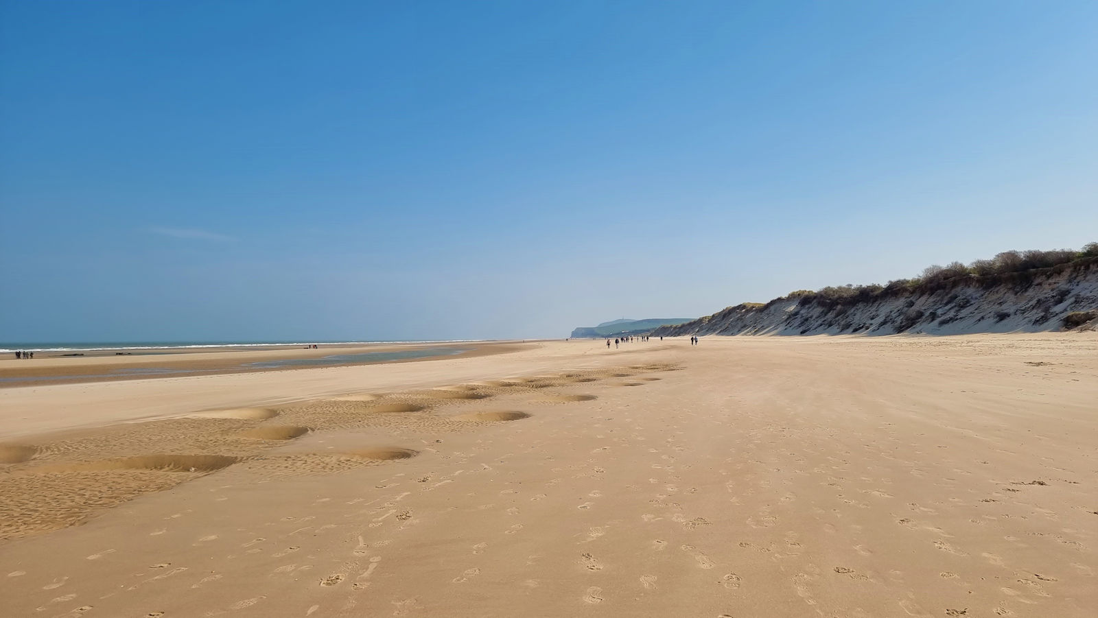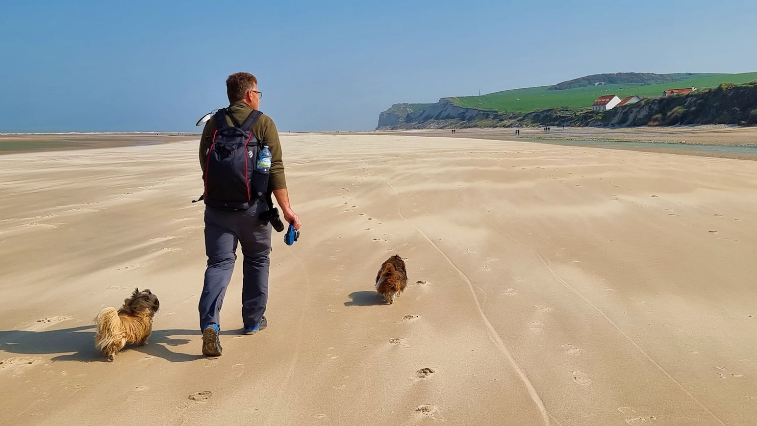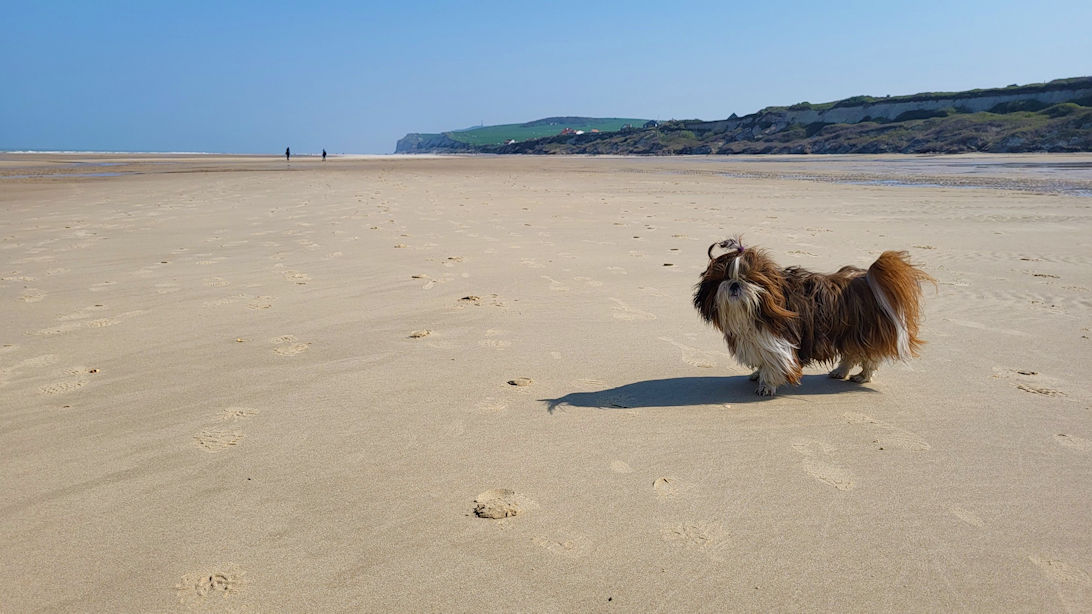 Der Himmel hat noch einige Wölckchen, aber ein wundervolles Blau schimmert schon durch. Gegen halb 10 sind wir startklar und laufen zum wenige 100 Meter entfernten Strandzugang (wichtige Info für Hundebesitzer: ab 15. Mai herrscht hier Hundeverbot am Strand!) Da gerade Ebbe ist und noch viel Wasser auf dem Strand steht, nehmen wir den Weg auf den Klippen in Richtung Wissant. Ein schöner Abschnitt mit tollen Ausblicken auf den endlosen Strand, die Dünen und die beiden Caps Blanc Nez und Gris Nez.