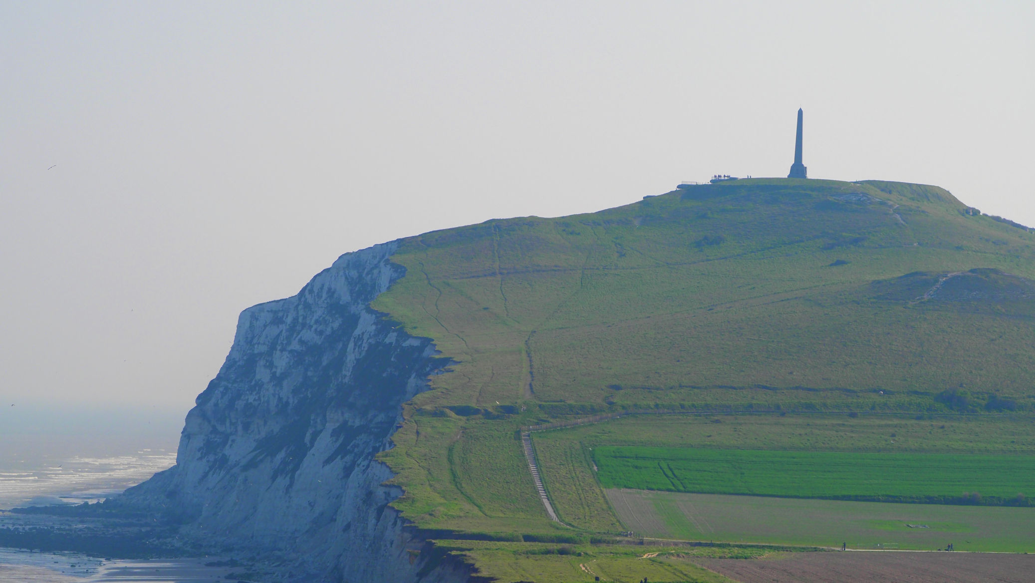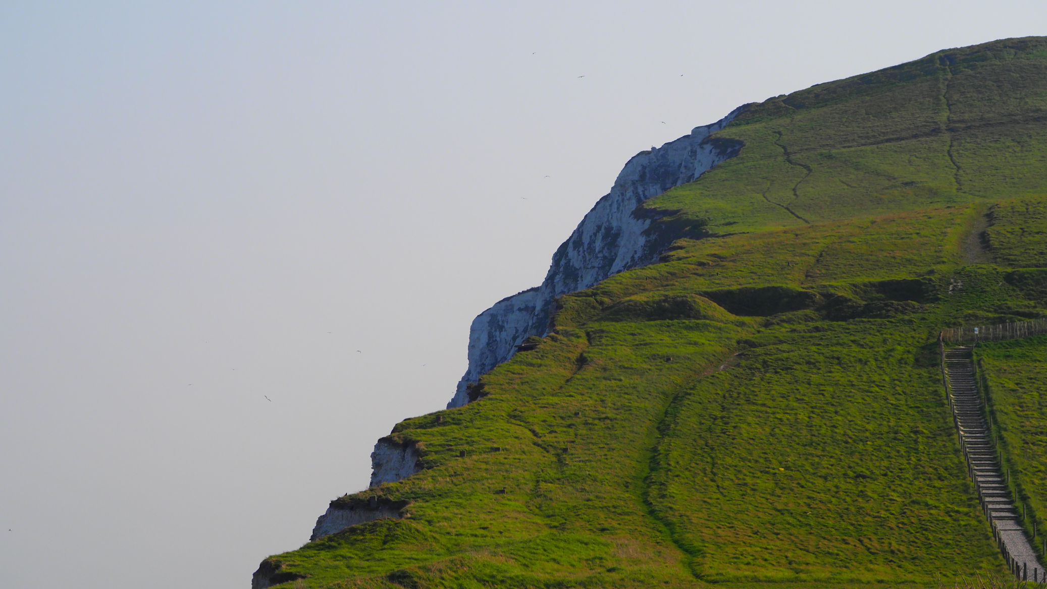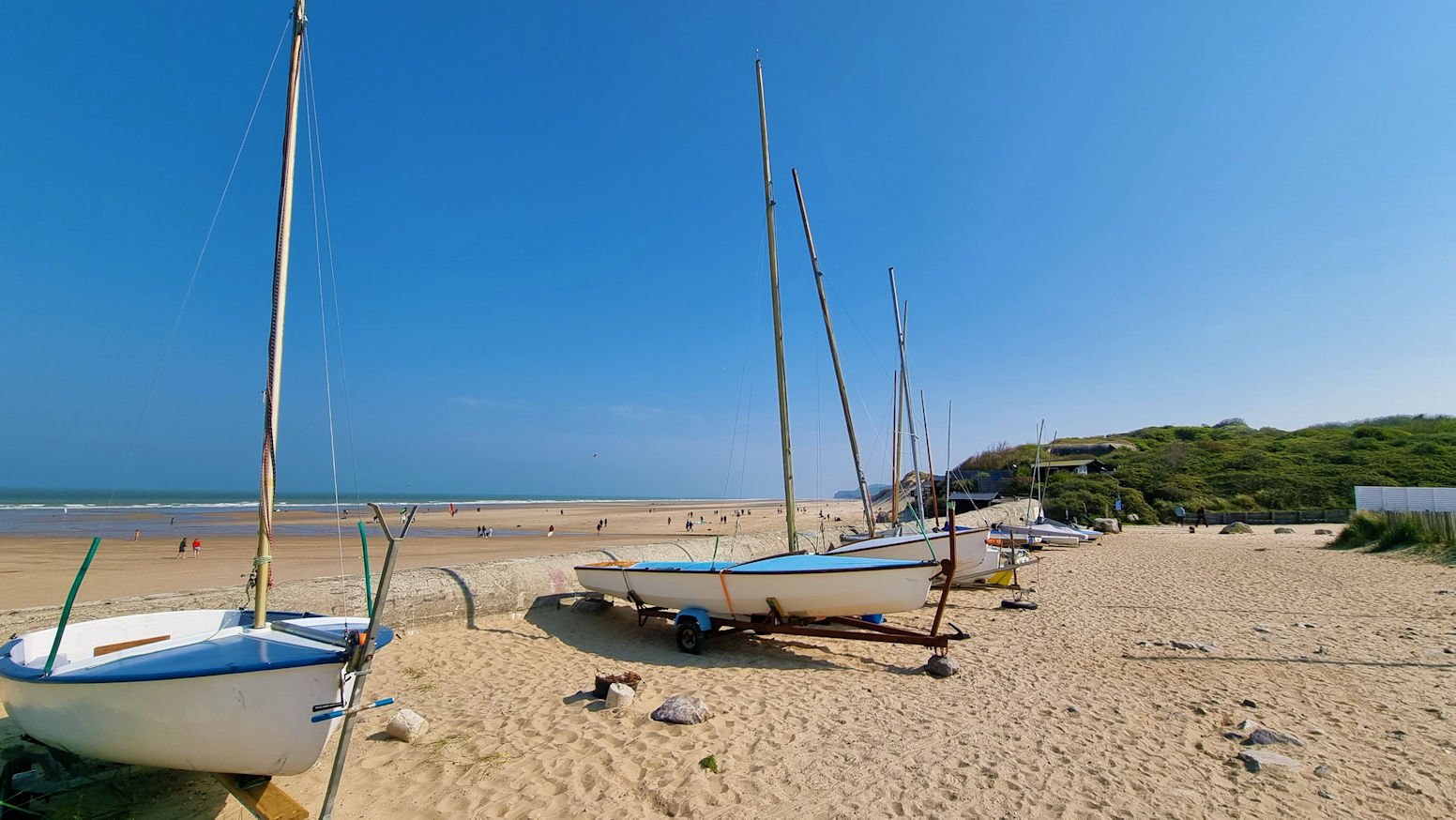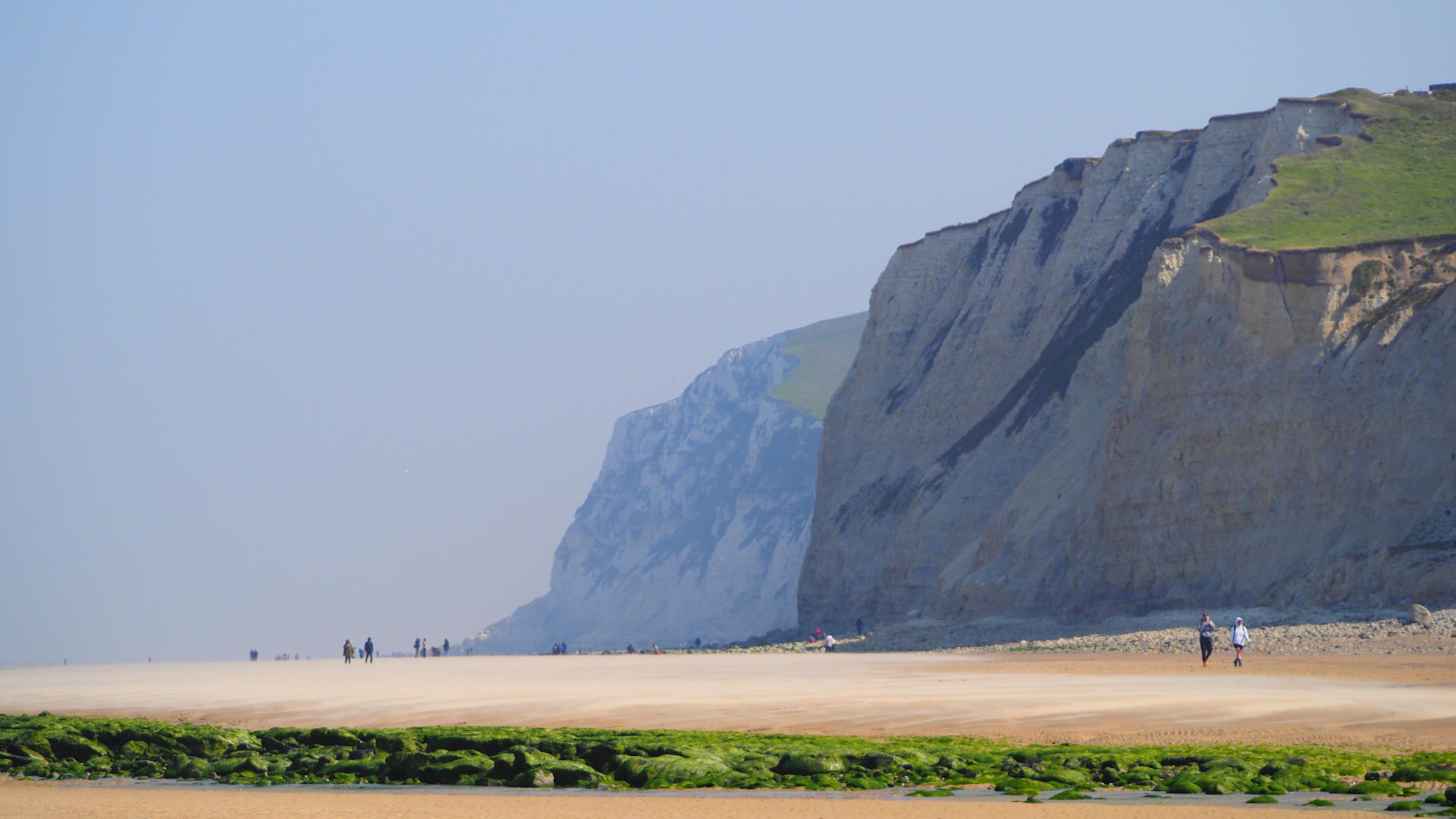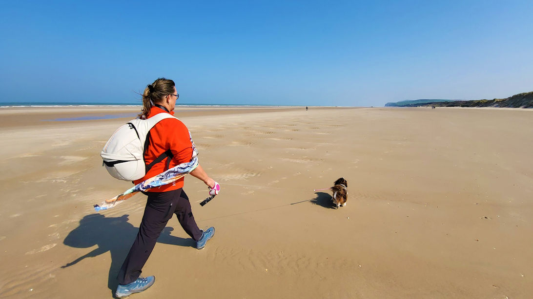 Der Himmel hat noch einige Wölckchen, aber ein wundervolles Blau schimmert schon durch. Gegen halb 10 sind wir startklar und laufen zum wenige 100 Meter entfernten Strandzugang (wichtige Info für Hundebesitzer: ab 15. Mai herrscht hier Hundeverbot am Strand!) Da gerade Ebbe ist und noch viel Wasser auf dem Strand steht, nehmen wir den Weg auf den Klippen in Richtung Wissant. Ein schöner Abschnitt mit tollen Ausblicken auf den endlosen Strand, die Dünen und die beiden Caps Blanc Nez und Gris Nez.