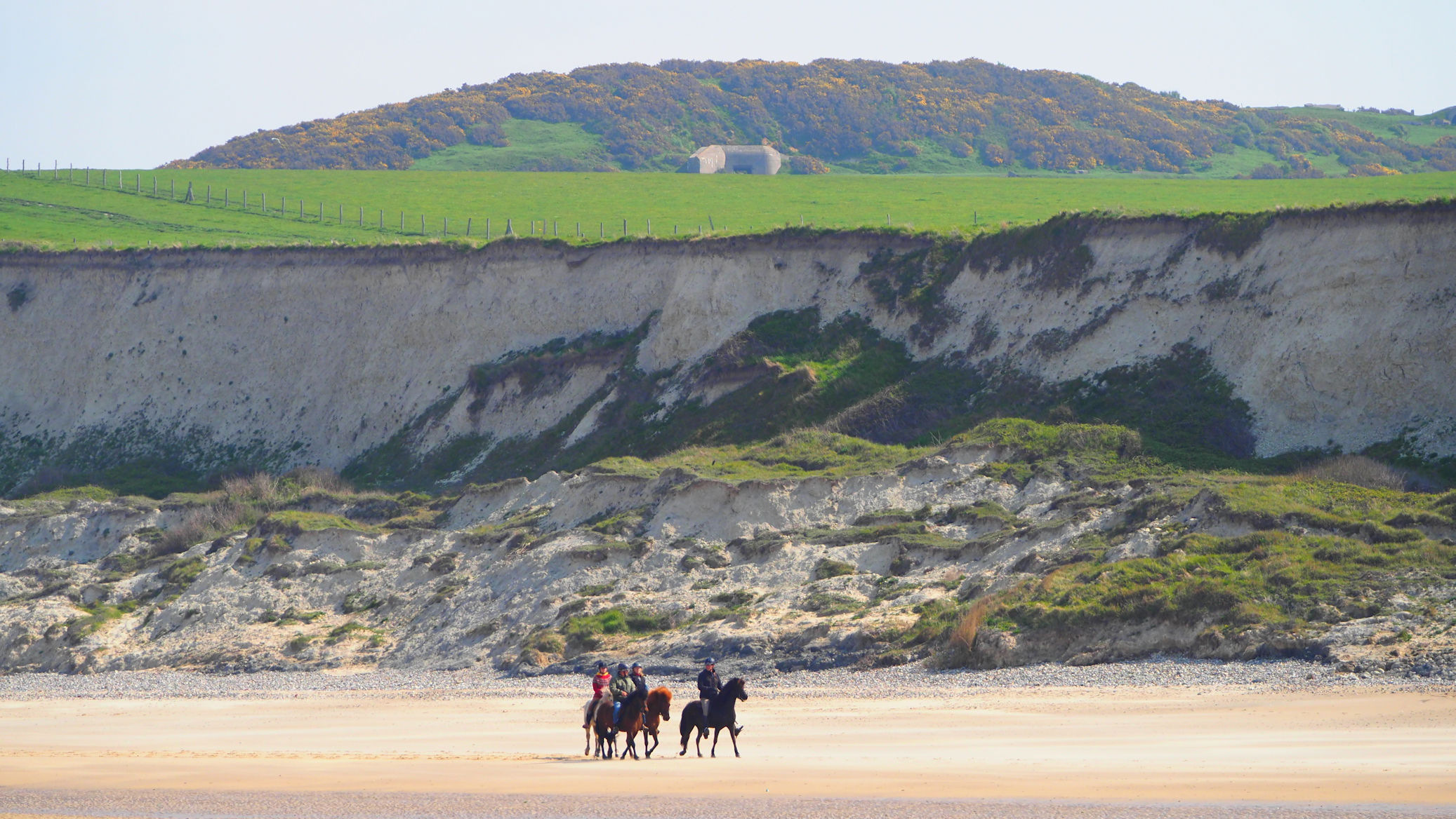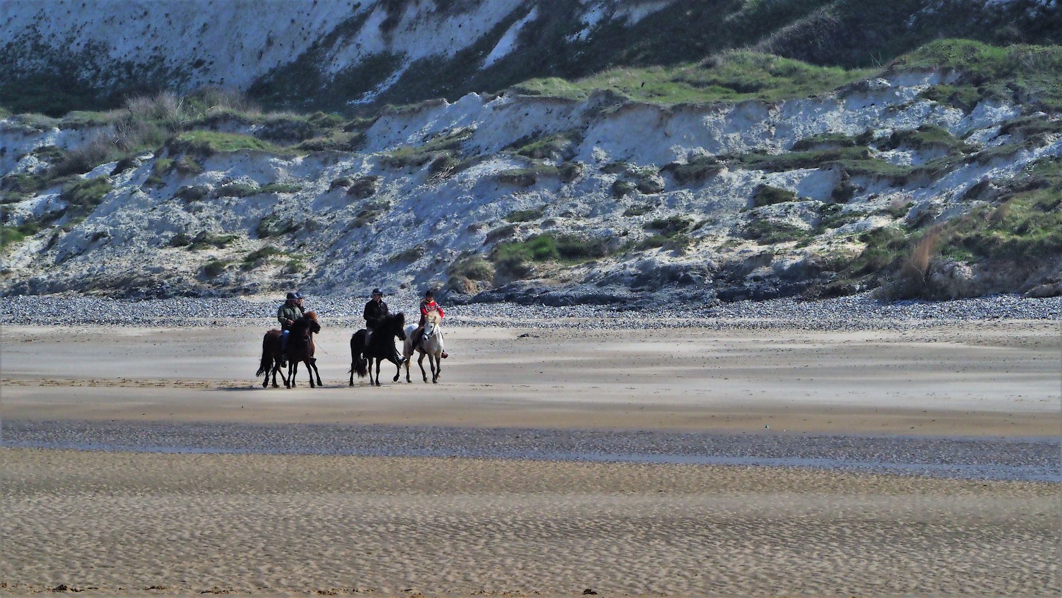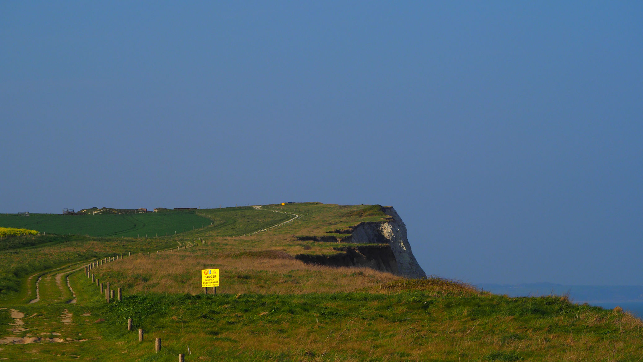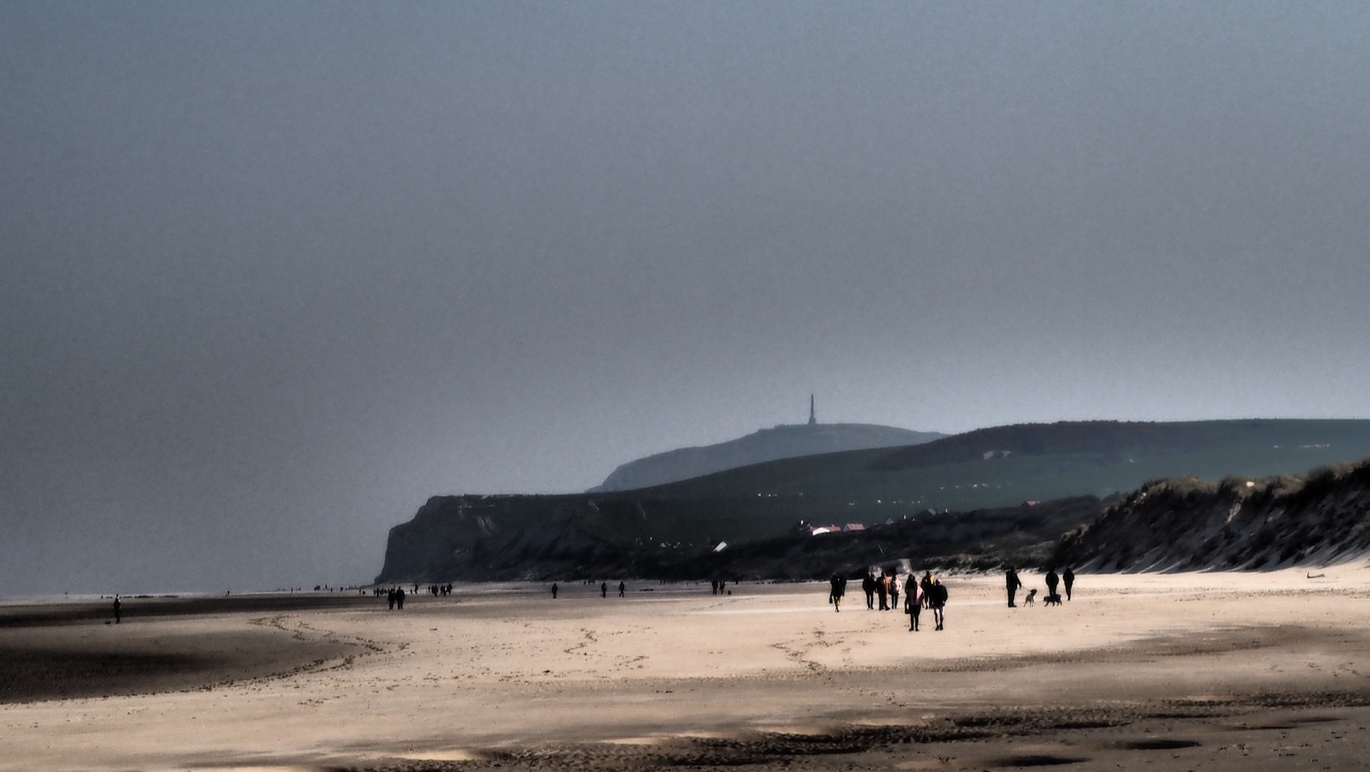 Der Himmel hat noch einige Wölckchen, aber ein wundervolles Blau schimmert schon durch. Gegen halb 10 sind wir startklar und laufen zum wenige 100 Meter entfernten Strandzugang (wichtige Info für Hundebesitzer: ab 15. Mai herrscht hier Hundeverbot am Strand!) Da gerade Ebbe ist und noch viel Wasser auf dem Strand steht, nehmen wir den Weg auf den Klippen in Richtung Wissant. Ein schöner Abschnitt mit tollen Ausblicken auf den endlosen Strand, die Dünen und die beiden Caps Blanc Nez und Gris Nez.