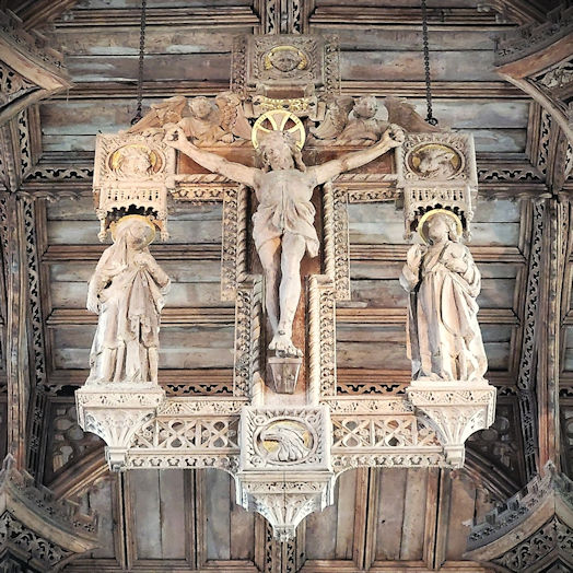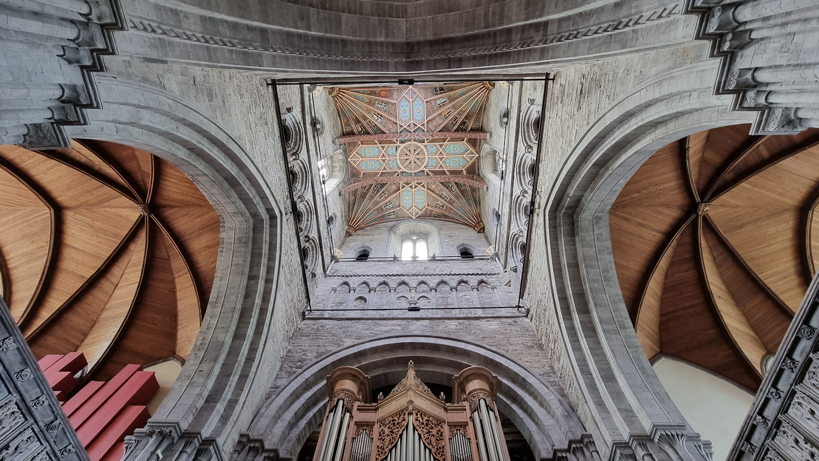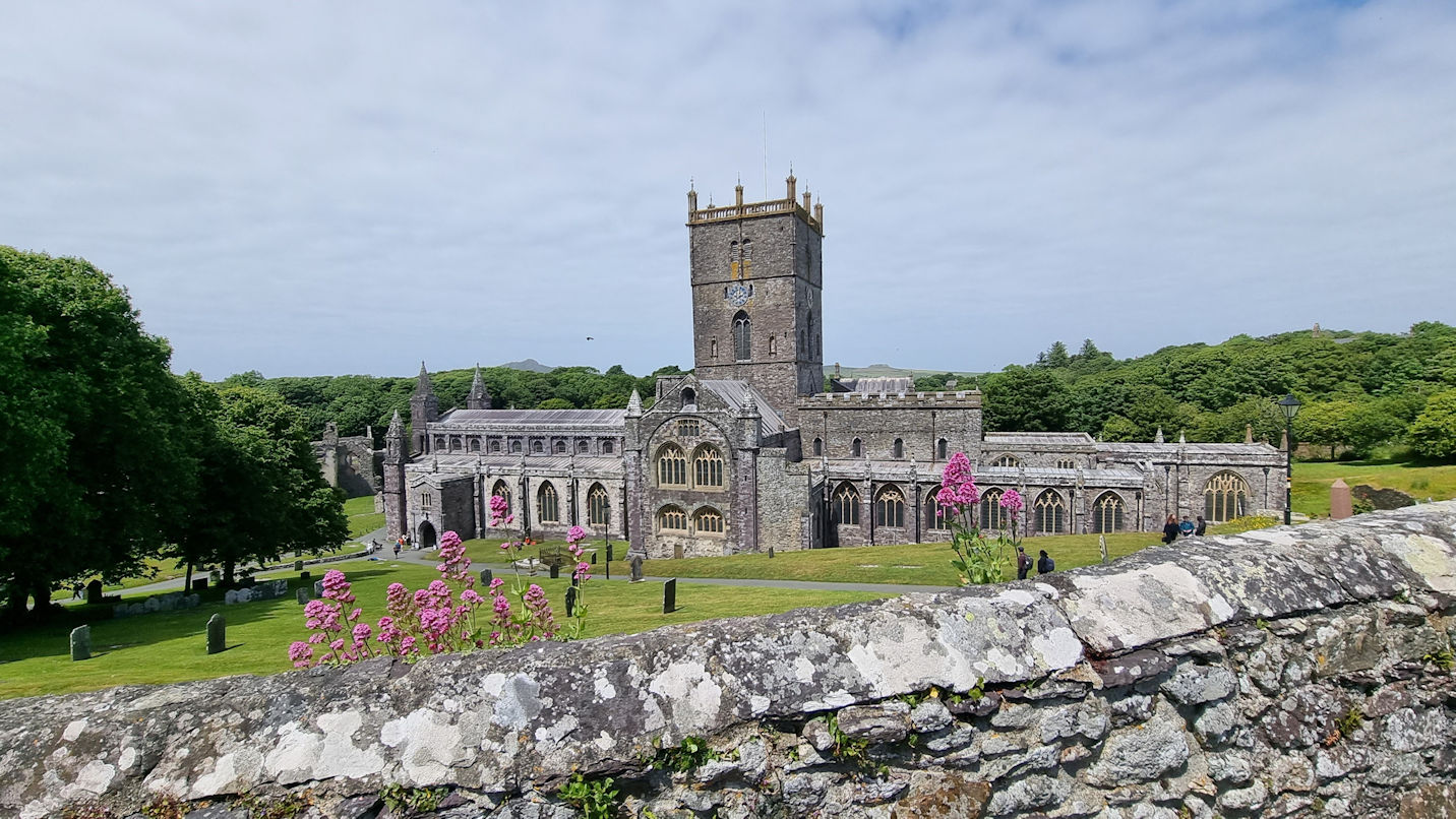 Auf unserem Rückweg an der Kathedrale entlang ist Einiges mehr los als gestern. Die Kathedrale hat geöffnet und wir entscheiden uns für einen Besuch. Und dieser lohnt sich. Die Holzarbeiten im Inneren der Kirche sind beeindruckend. Massive Eichendecken, teilweise kunstvoll mit Wappen verziert, ebenso das unter dem massiven Turm liegende Refektorium, sowie der Schrein des heiligen David. Ein mal etwas anderes, wirklich wunderschönes Gotteshaus.