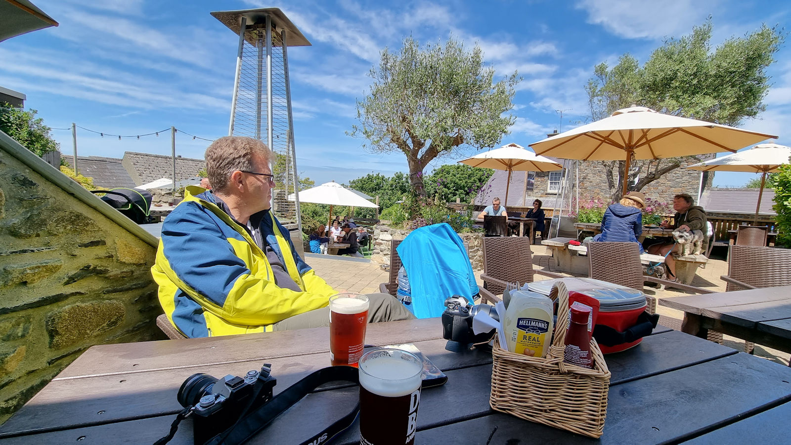 Wir finden Platz im Biergarten von „The Bishops“. Windgeschützt zu sitzen ist recht schwierig ebenso wie einen Platz ohne direkte Hundenachbarschaft zu finden. So entscheiden wir uns für einen Tisch im Schatten. Und da kommen sie wieder zum Vorschein: Temperaturen um die 13 Grad. Aber in dicker Jacke geht es einigermaßen. Als die Sonne dann einen Teil unseres Tisches erobert, zieht Ralf in die Sonne um. Die Fellnasen packen wir auf die Holzbank neben Ulli und decken sie zu, denn auf dem Steinboden ist es sogar den beiden zu kalt.