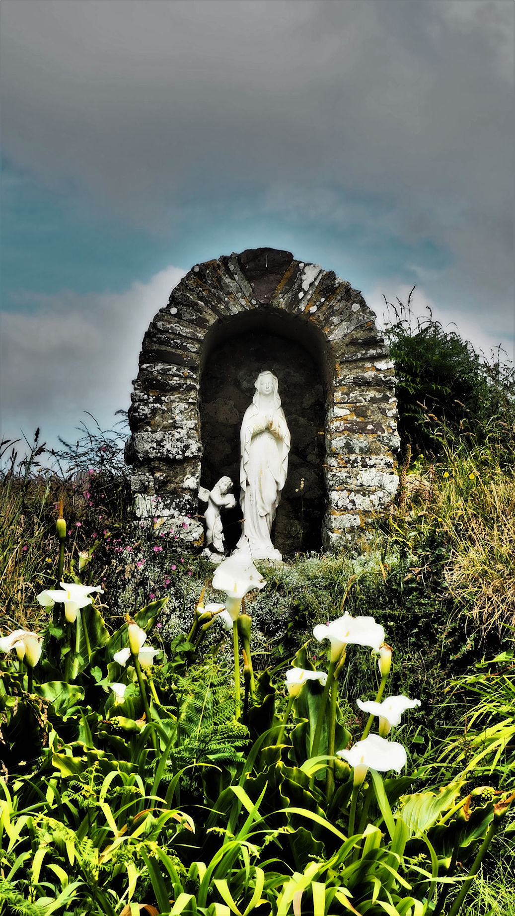 Nach einem gemütlichen Spaziergang erreichen wir die Ruine der alten Kapelle, dem angeblichen Geburtsort des Schutzpatron der kleinen Stadt St. Davids. Direkt daneben liegt eine Quelle, der man heilende Kräfte nachsagt. Die Vegetation um die Quelle erinnert an Tasmanien-Bilder aus dem Reisekatalog.