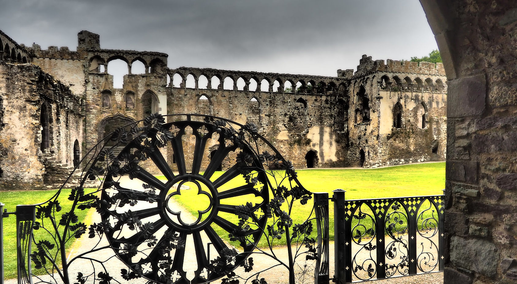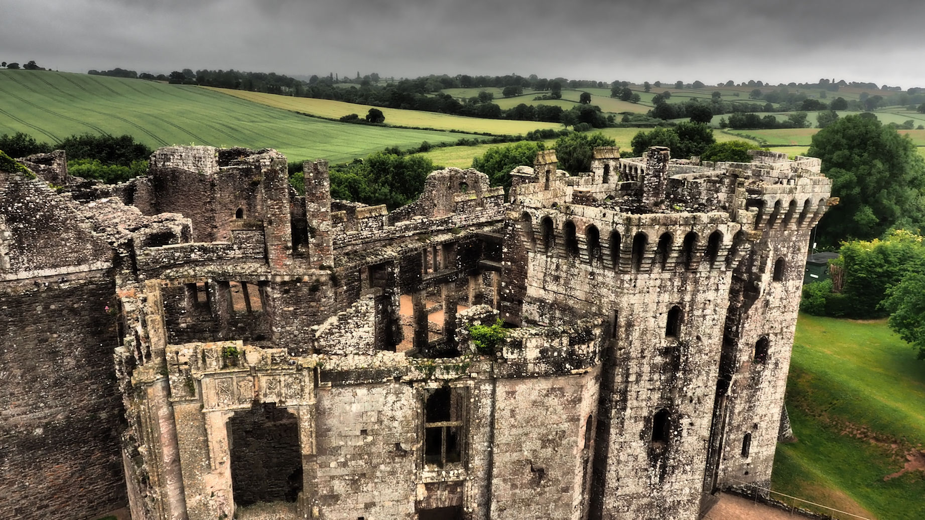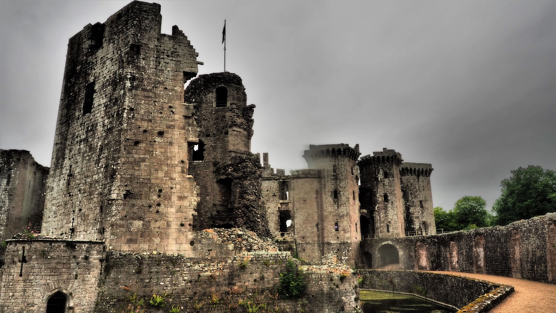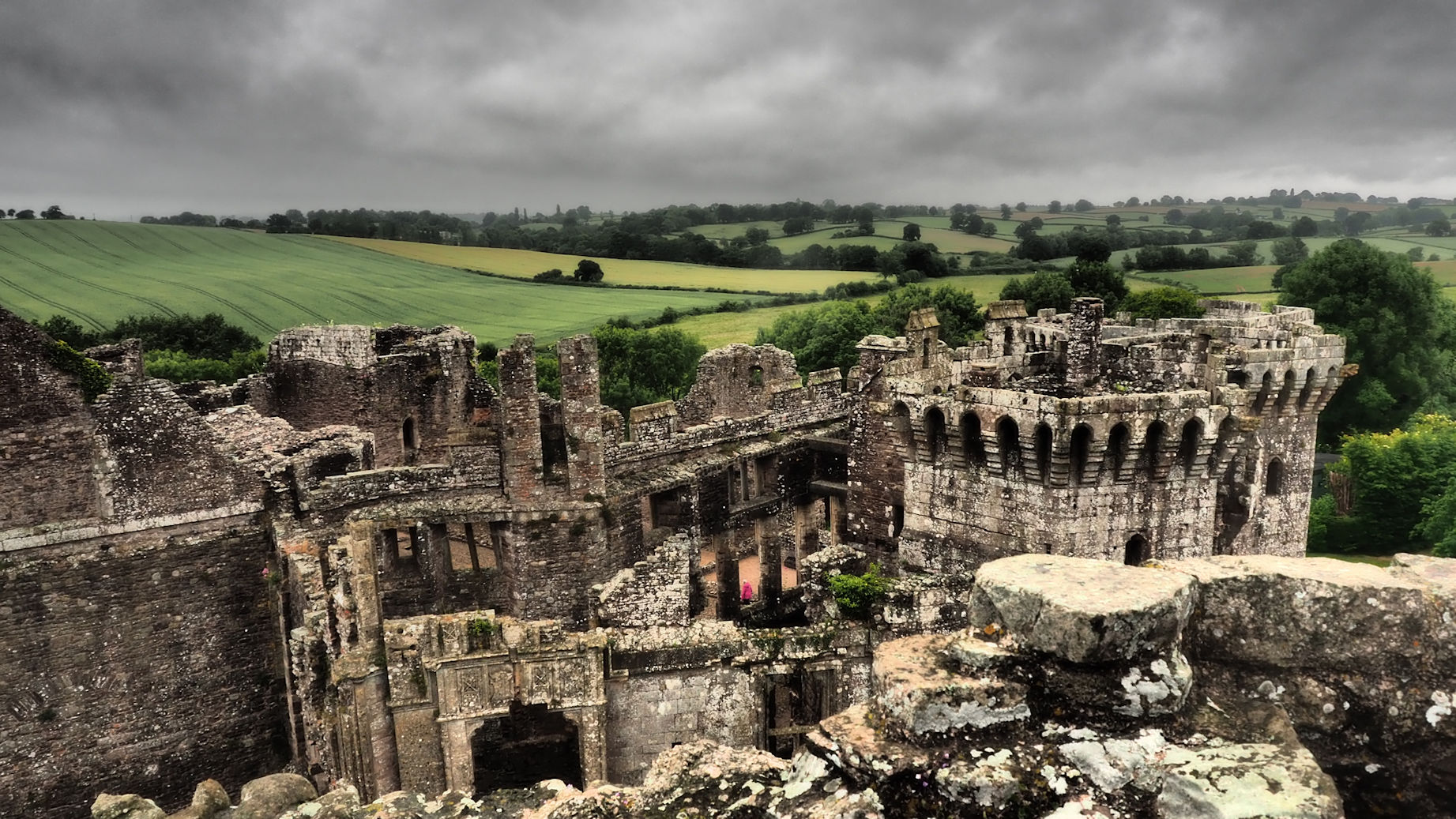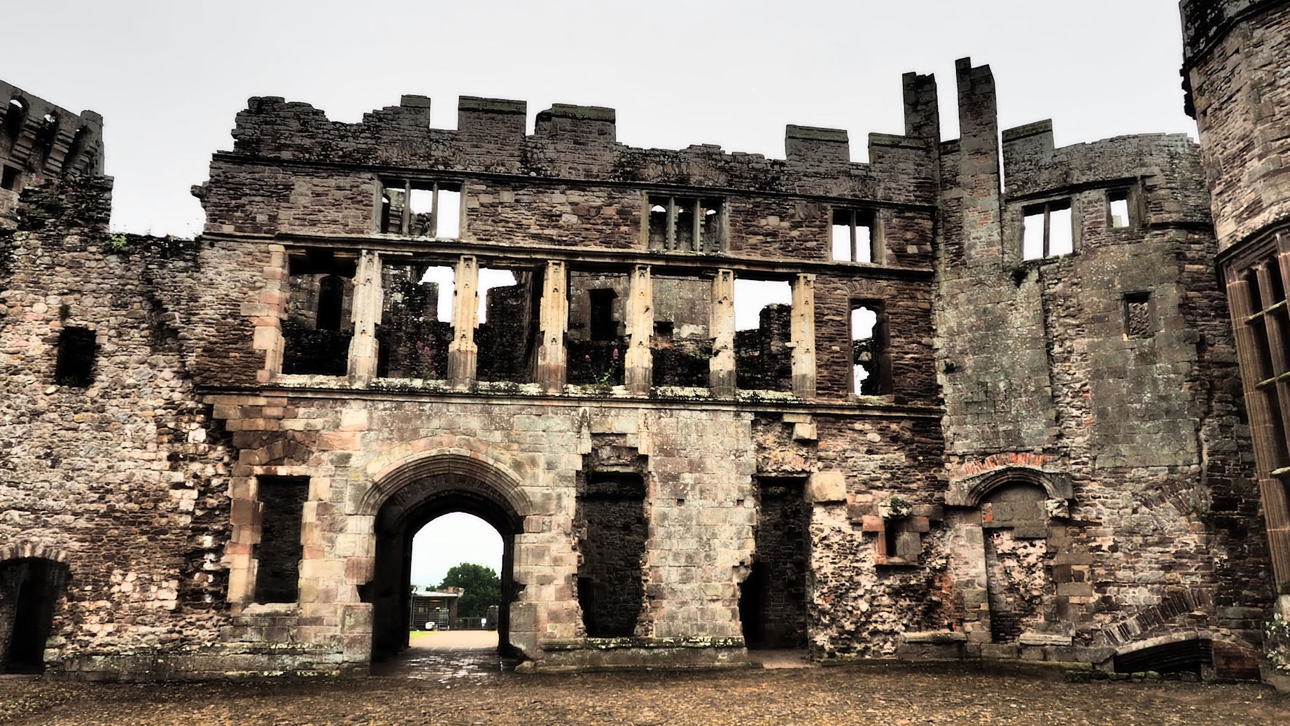 Nach unserem dortigen Tankstopp machen wir ungewollt eine kurze Bekanntschaft mit der schönen, aber auch sehr engen Altstadt von Monmouth, bevor wir wieder auf die Schnellstraße in Richtung unseres nächsten Ziels gelangen. Es geht nach Raglan Castle. Da die Burg aber erst um 9:30 Uhr ihre Pforten für Besucher öffnet, stoppen wir für ein ausgedehntes Frühstück an der nächsten Raststätte. Auch der Regen wird heftiger.