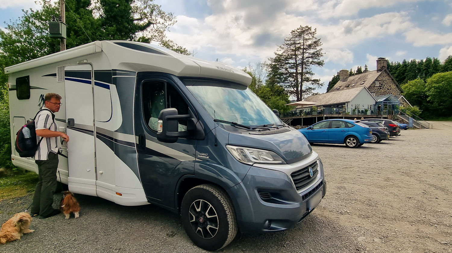 Nach ein paar Servicearbeiten am Womo verlassen wir den Campingplatz in Richtung Aberystwyth. Nicht wundern beim Lesen. Es gibt noch viel mehr unaussprechliche Ortsnamen hier in Wales. Kurze Zeit später fahren wir in den für Wales berühmten Snodownia Nationalpark ein. Landschaftlich wunderschön erinnert er mancherorts etwas an die Alpen. Wir passieren den Clocktower in Machynlleth, einen Schwemmlauf eines Flußes und landen zur Mittagszeit im Cross Foxes, einem tollen Restaurant. Bei schwülen 26 Grad im Schatten, genießen wir unsere Mittagspause. Es gibt Beefburger für Ralf und Tandoori Chicken Burger für Ulli, vorher eine leckere Bruschettakreation. Alle Speisen sind frisch und es schmeckt sehr gut. Der italienische Moment hat aber nur indirekt mit dem Essen zu tun. Es ist Ralf’s Antwort auf die Frage „Für wen ist der Beefburger?“ Diese lautet: „Per me“