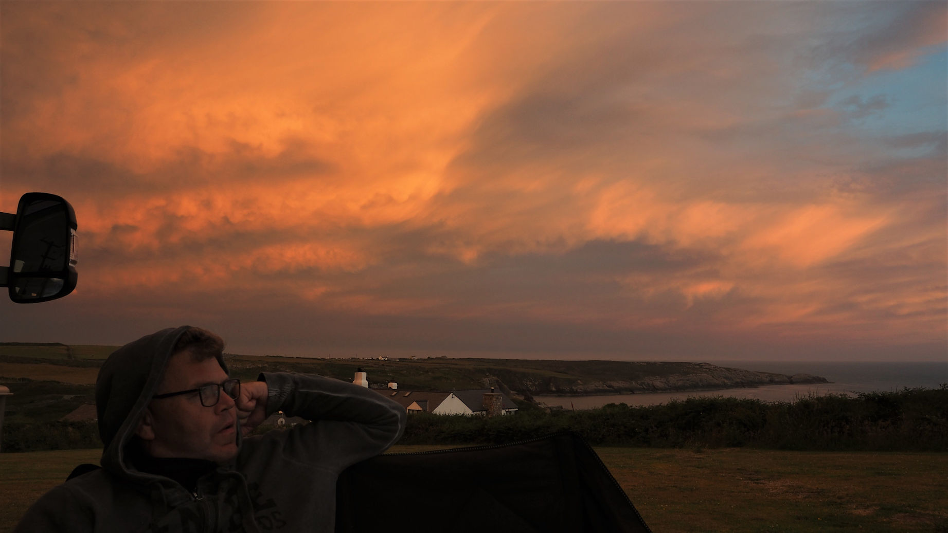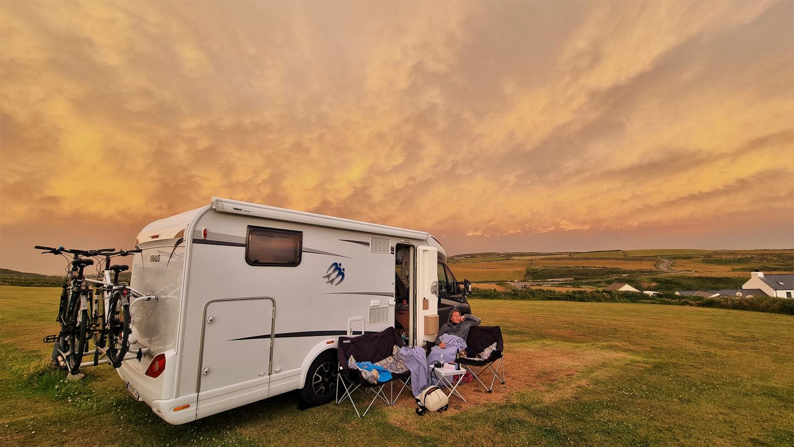 Einen kleinen Abendimbiss genießen wir bei Bilderbuchsonnenuntergang und kühlem Wind vorm Wohnmobil…auf diesem kleinen, für uns vier perfektem Platz mit riesiger Fellnasenspielwiese vor der Tür. Ob wir länger bleiben?