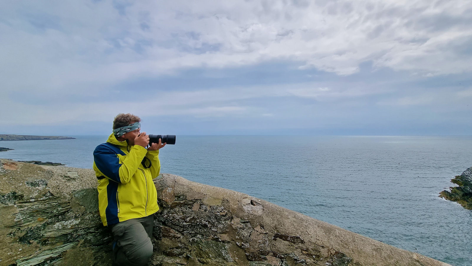 Aber wir bleiben. Schließlich wollen wir Razorbills (Tordalken), Guillemots (Trottellummen) und Puffins (Papageientaucher) sehen. Allie und Amadeo sind glücklich, windgeschützt und trocken unterm Cape zu sitzen. Und so warten wir auf die nächste Regenpause. Ein Foto, wie wir die Szenerie gerade durch unsere verregnete Brille sehen, wollen wir Euch nicht vorenthalten.