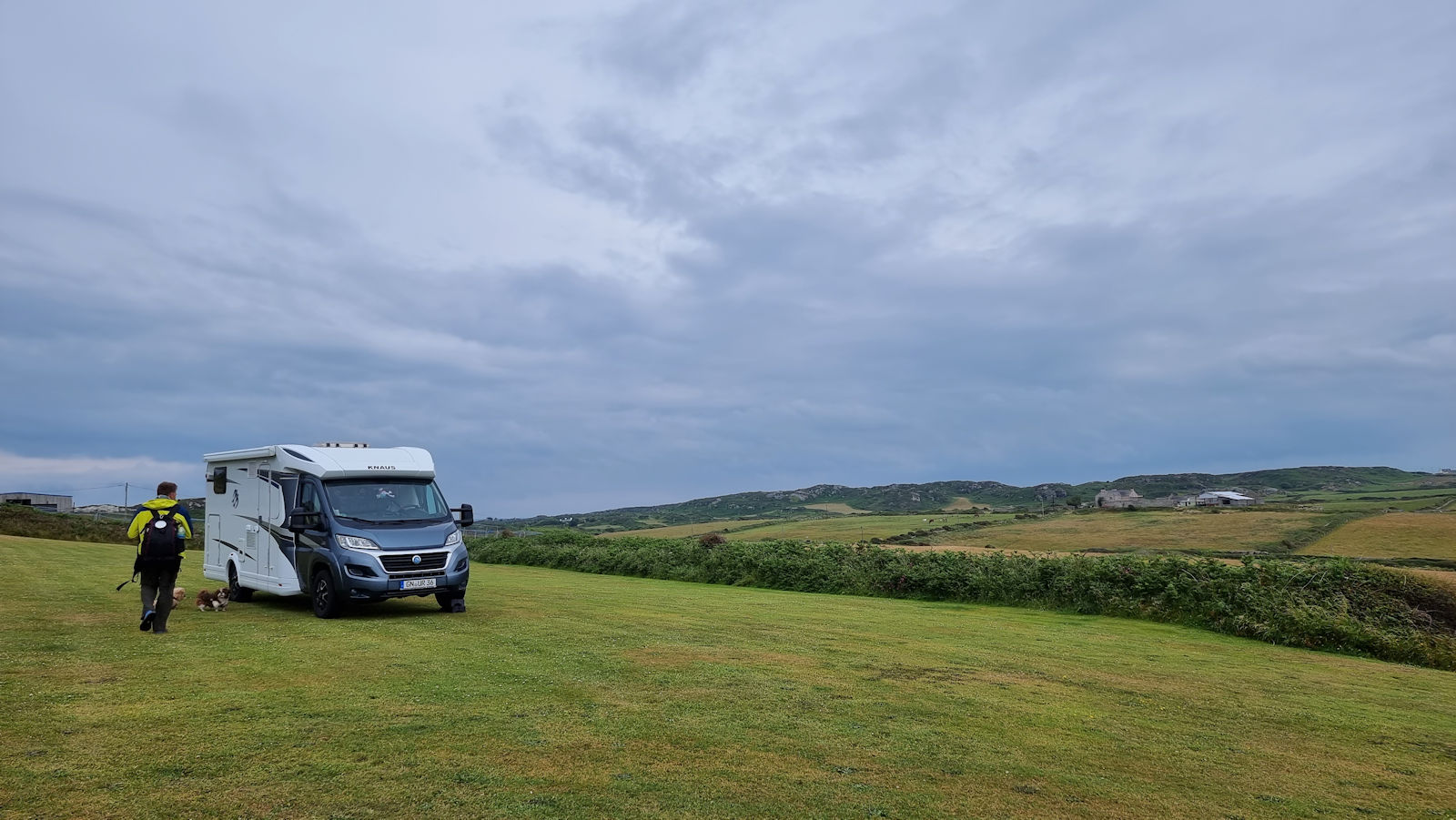 Dieser sagt, dass wir nachmittags mit trockenem Wetter rechnen können. Gegen 11 Uhr stattet Ulli dem Eigentümer des Camping Ty Mwr Mynydd einen kurzen Besuch ab. Bei einem netten Plausch erbettelt sie sich noch eine Flasche Milch, denn unsere ist uns ausgegangen. Und da wir gerne noch eine weitere Nacht hier bleiben möchten, rettet uns der nette Eigentümer so unser morgiges Frühstück.