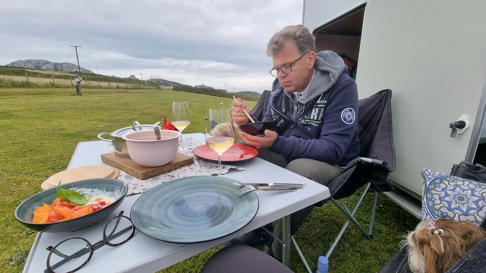 Es ist kaum Wind und es ist trocken und so dinieren wir alleine auf unserem Privatplatz vorm Womo. Herrlich!