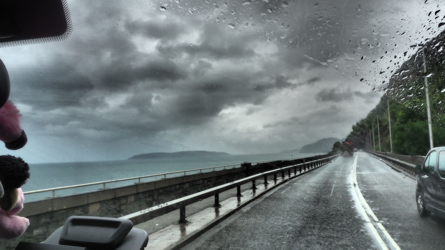Sturm und Starkregen – genau so war die hinter uns liegende, unruhige Nacht. Und heute morgen sieht es nicht besser aus. Nicht mal die Fellnasen wollen das Womo verlassen.