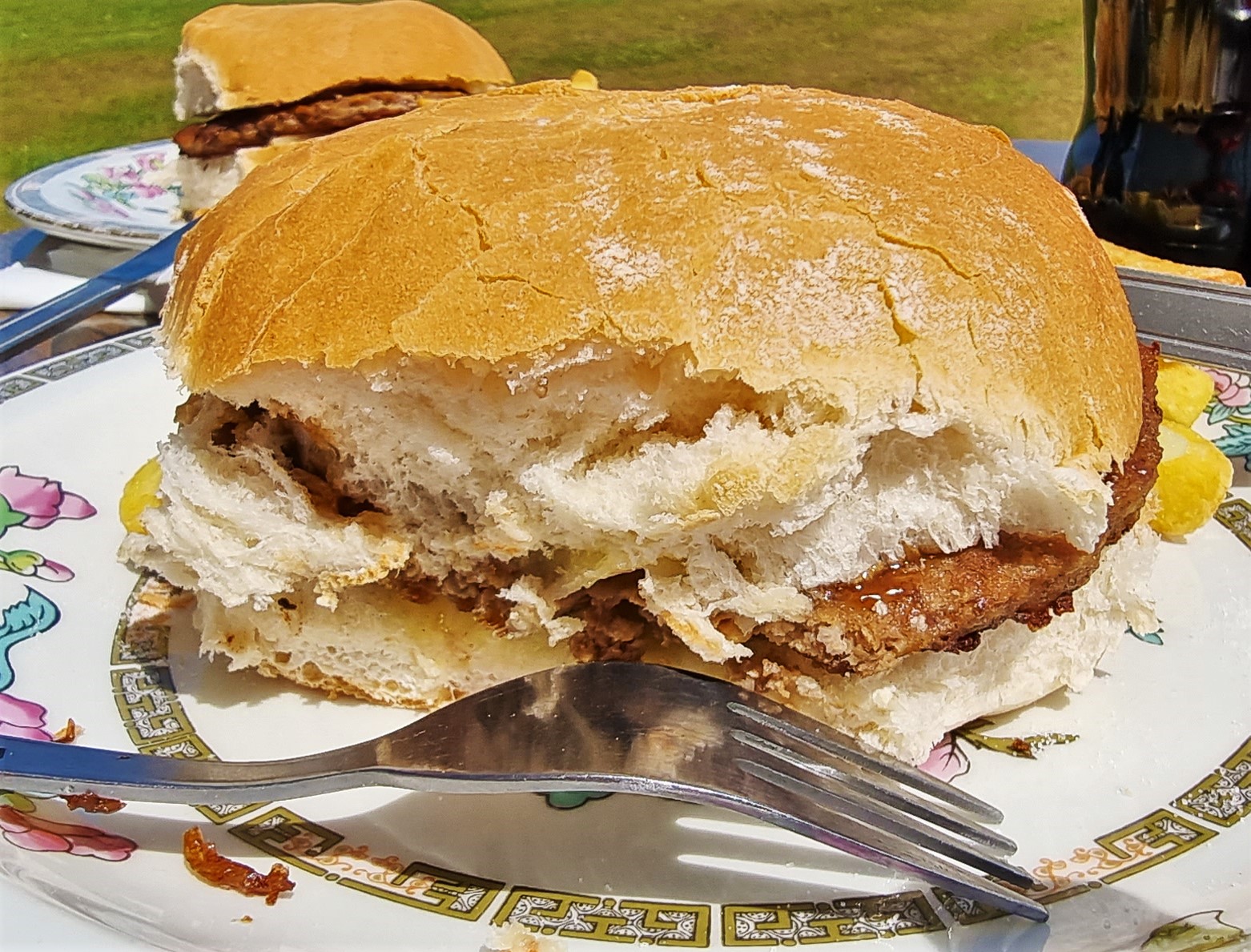 Hier ist es ruhig und es ist der perfekte Ort für eine Mittagspause. Ein Burger mit hausgemachten Pommes wird uns nach etwa einer halben Stunde an den Tisch gebracht mit der Info „You will find different sauces inside“ Als Ralf also nach drinnen geht und das Thema Saucen checkt, gibt es da entweder Rote Sauce oder Braune Sauce. Er entscheidet sich für die braune Sauce, die recht lecker zum Burger schmeckt. Was genau da drinnen ist, ist wahrscheinlich das große Geheimnis der Thornwick Bay.