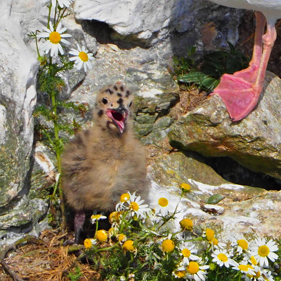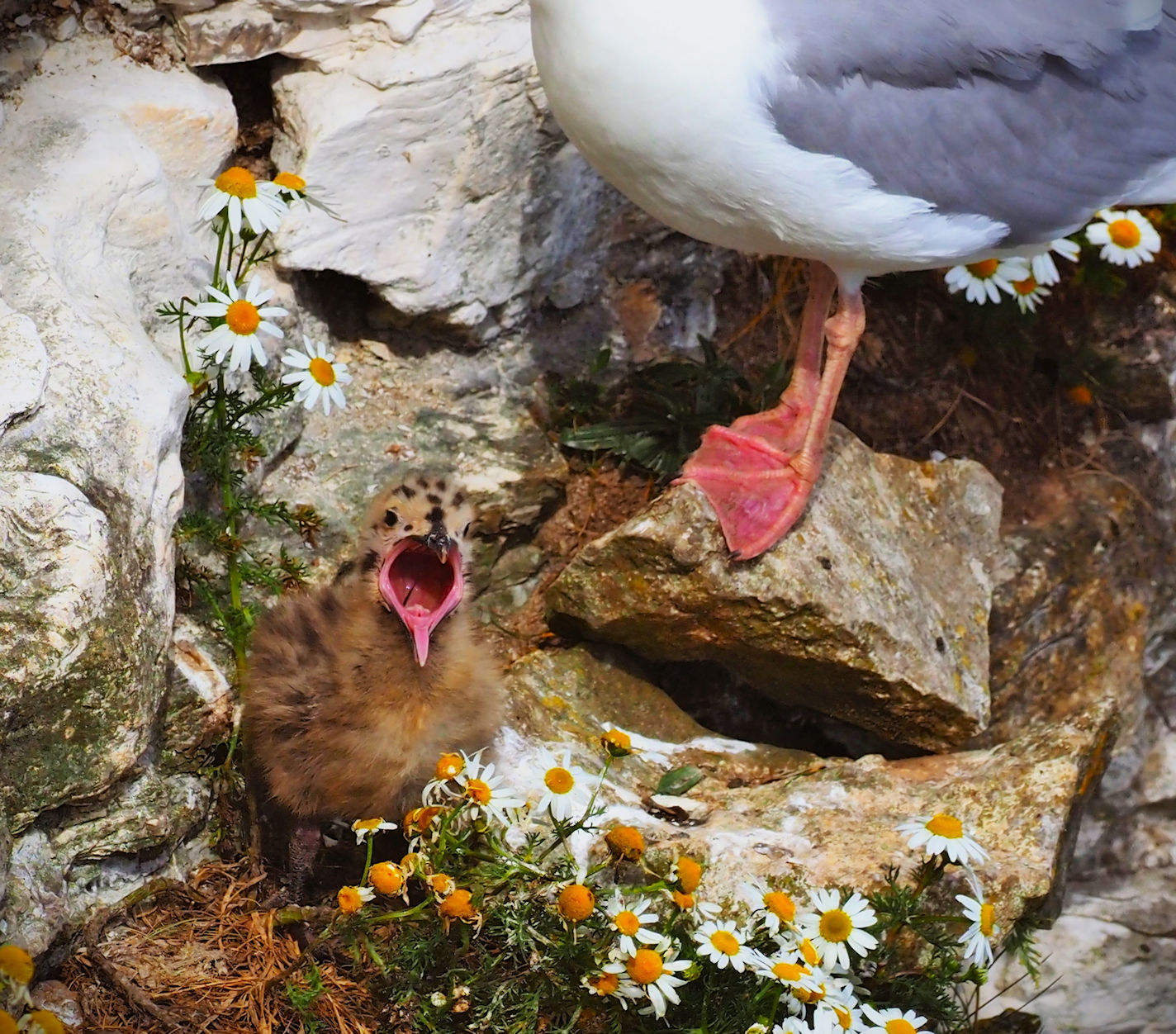 Da unsere beiden Fellnasen schon recht müde sind und es an windgeschützten Stellen des Weges bereits sehr schwül ist, wählen wir in den Cliffs gleich den ersten Aussichtpunkt, um eine längere Pause einzulegen. Aber wir sind nicht wirklich nah an den Vögeln dran und es sind auch bei weitem nicht so viele wie in Bempton Cliffs. Etwas entschädigen die Babies einer anderen Möwenart.