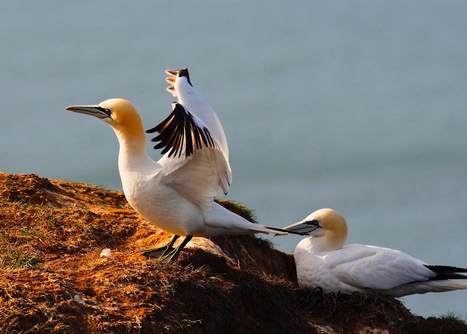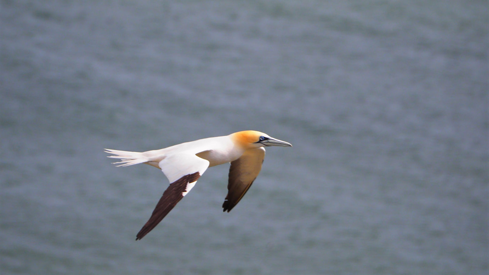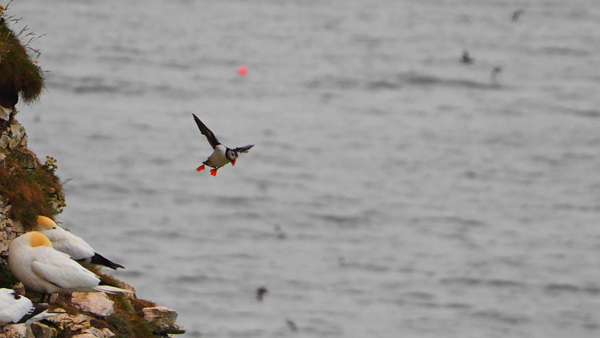 Auch Basstölpel im Flug lassen sich von diesem Aussichtspunkt sehr gut beobachten. Und das Beste: wir sind nahezu alleine. Ab und an passiert jemand den Pfad und lächelt ein kurzes „Hallo“ zu uns herüber. Der Grund für das Lächeln: Wir liegen nebeneinander auf dem Bauch auf der Klippe und fotografieren. Ein bestimmt sehr lustiger Anblick. Hinter uns wachen unsere Fellnasen am Rucksack befestigt über uns.