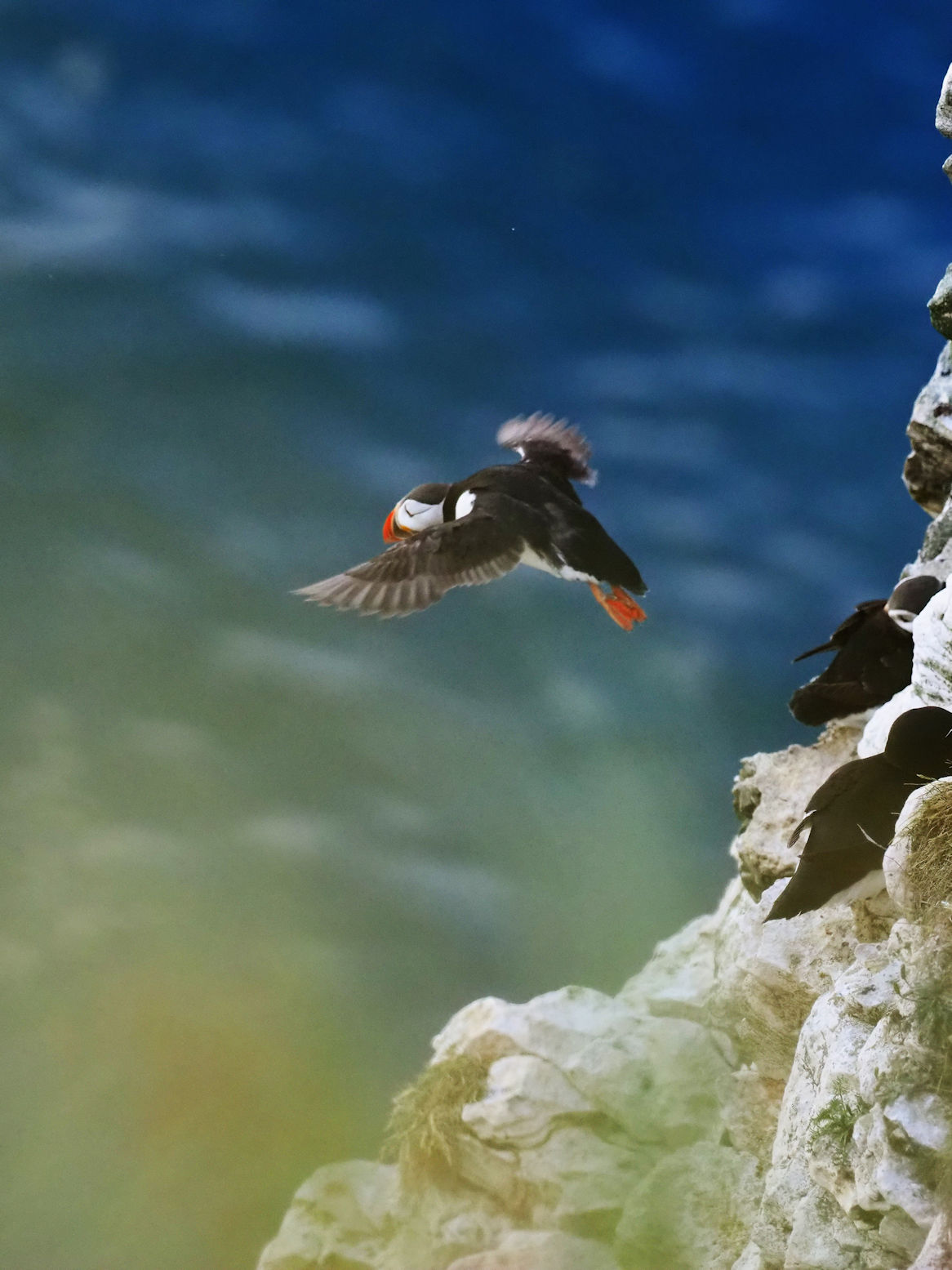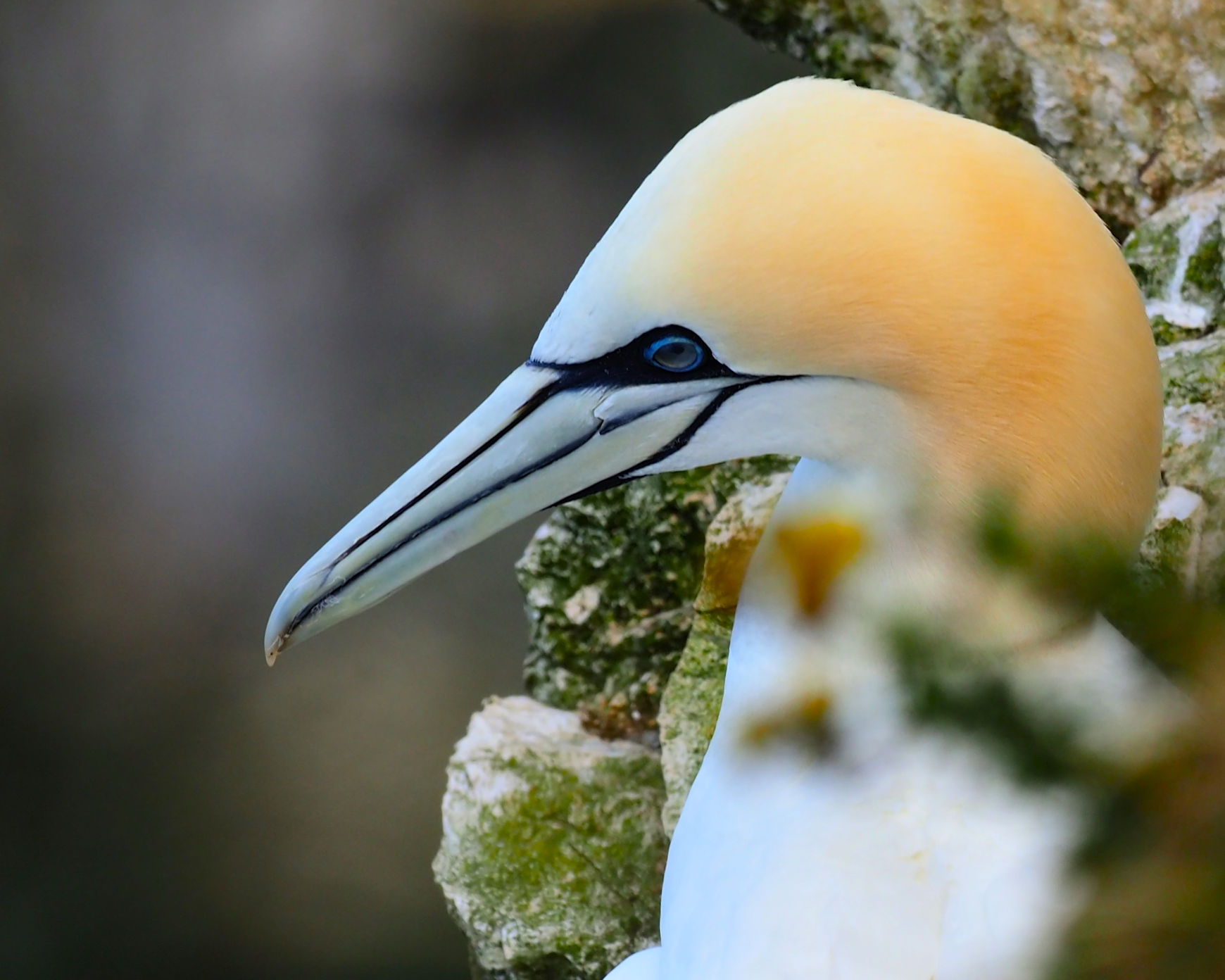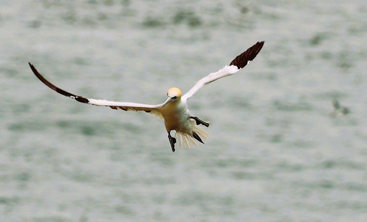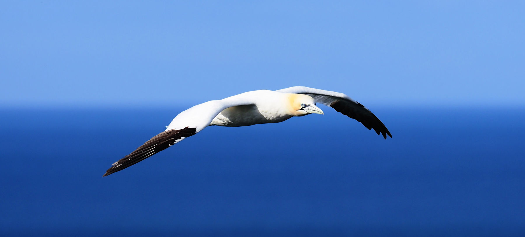 Auch Basstölpel im Flug lassen sich von diesem Aussichtspunkt sehr gut beobachten. Und das Beste: wir sind nahezu alleine. Ab und an passiert jemand den Pfad und lächelt ein kurzes „Hallo“ zu uns herüber. Der Grund für das Lächeln: Wir liegen nebeneinander auf dem Bauch auf der Klippe und fotografieren. Ein bestimmt sehr lustiger Anblick. Hinter uns wachen unsere Fellnasen am Rucksack befestigt über uns.