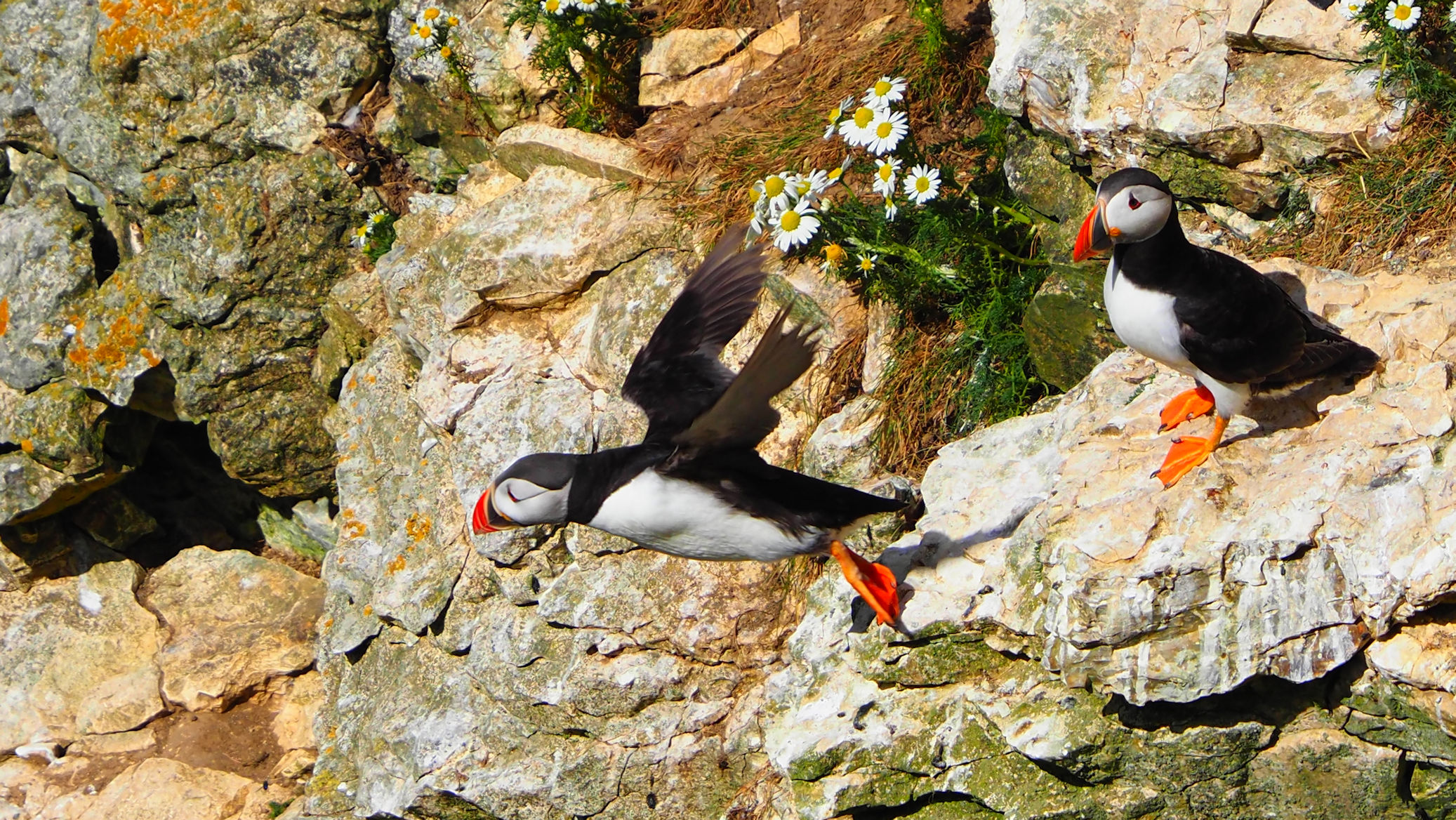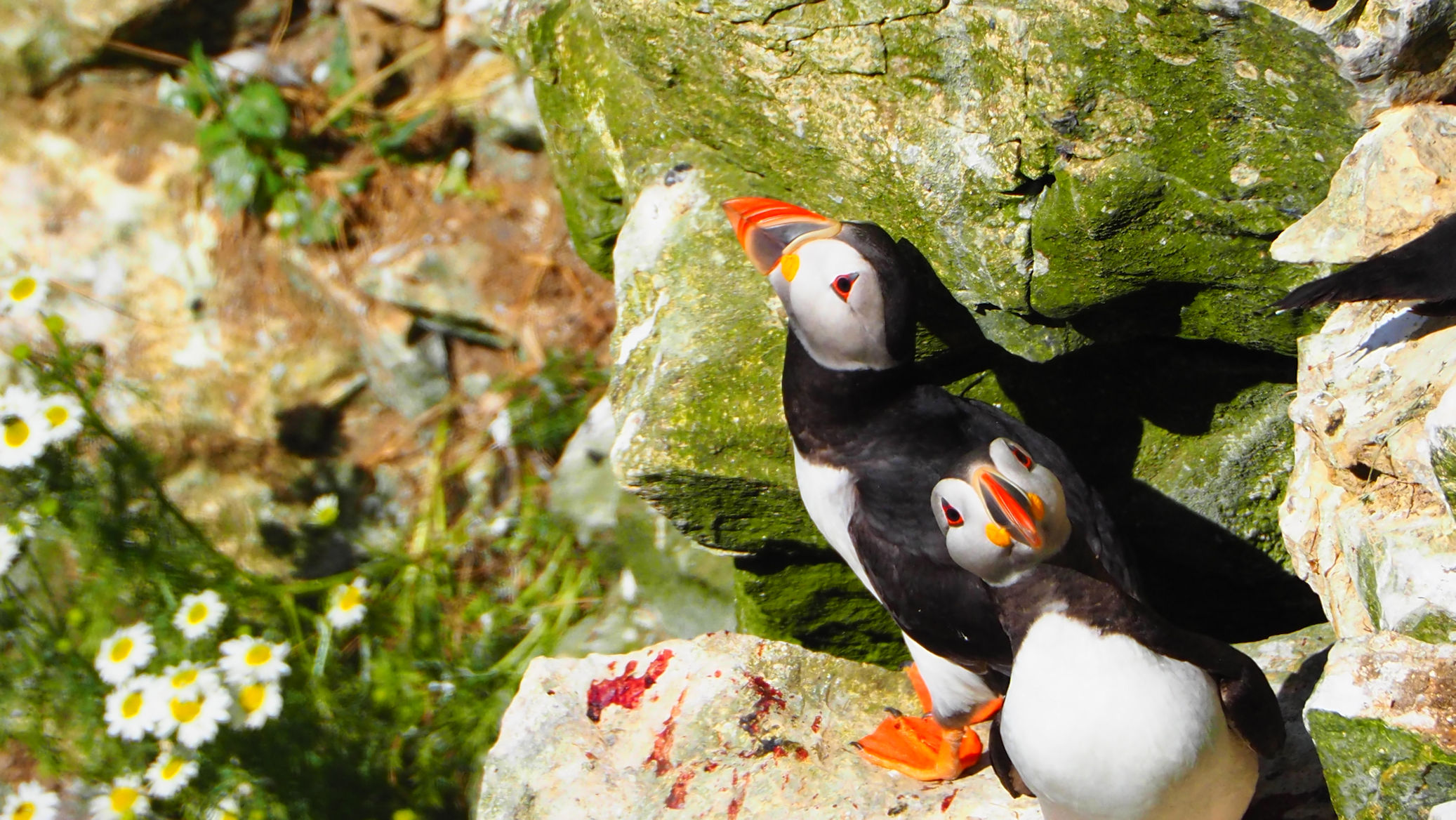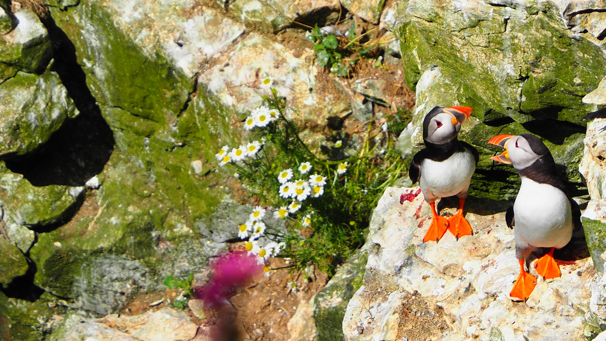 Da alle Aussichtsplätze, die wir passieren derzeit im Schatten liegen, entscheiden wir uns, nochmals an die Stelle zu gehen, an der wir gestern einige Puffins um etwa die gleiche Uhrzeit im Sonnenschein beobachten konnten. Und der Weg lohnt sich. Hier findet heute eine regelrechte Puffinparade statt. Überall sitzen die kleinen Clowns der Meere und lassen sich wunderbar ablichten. Schade, dass ihr das Vogelstimmengewirr nicht hören könnt, wenn ihr Euch die Bilder anseht. Es ist wirklich ein Schauspiel. Schön an diesem Ort ist auch der Zaunkönig, der ganz ohne Scheu um uns herumhüpft und sich in den Gräsern sitzend ablichten lässt.