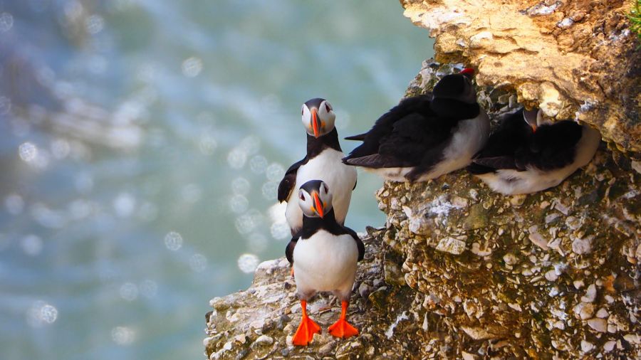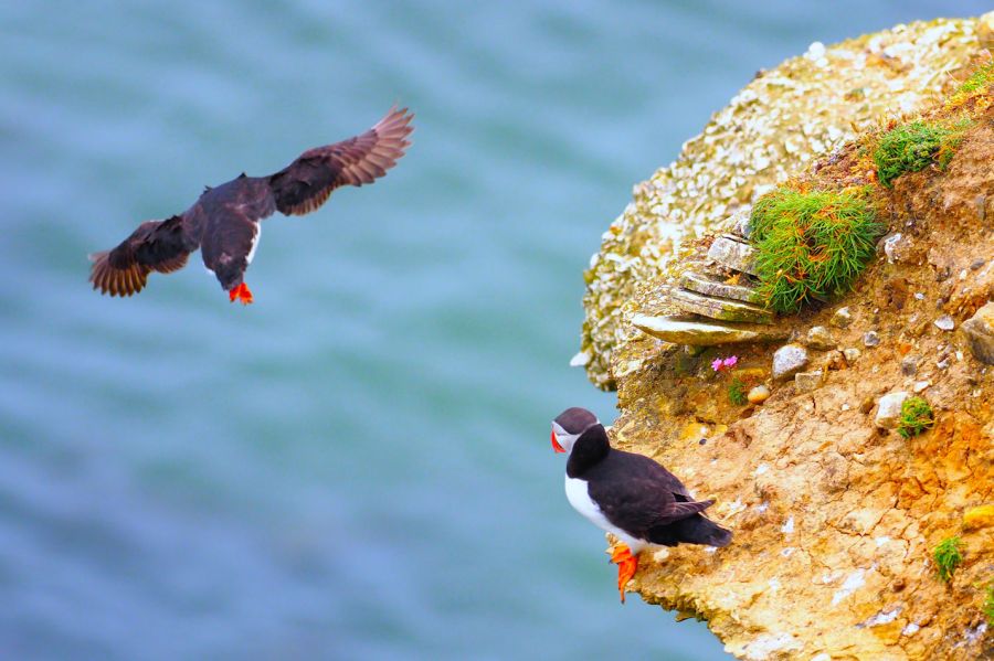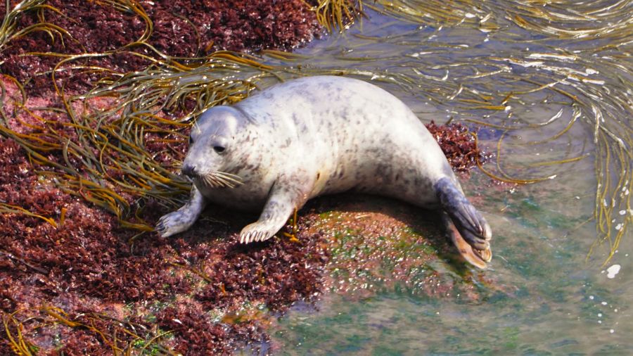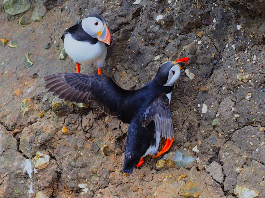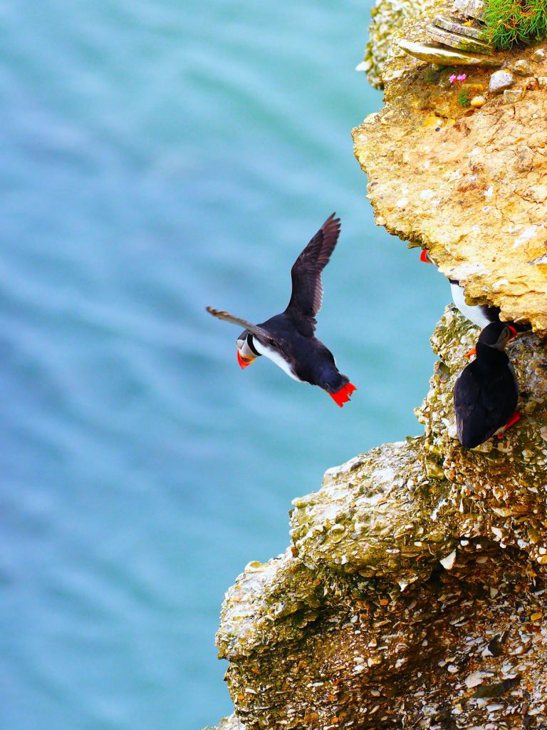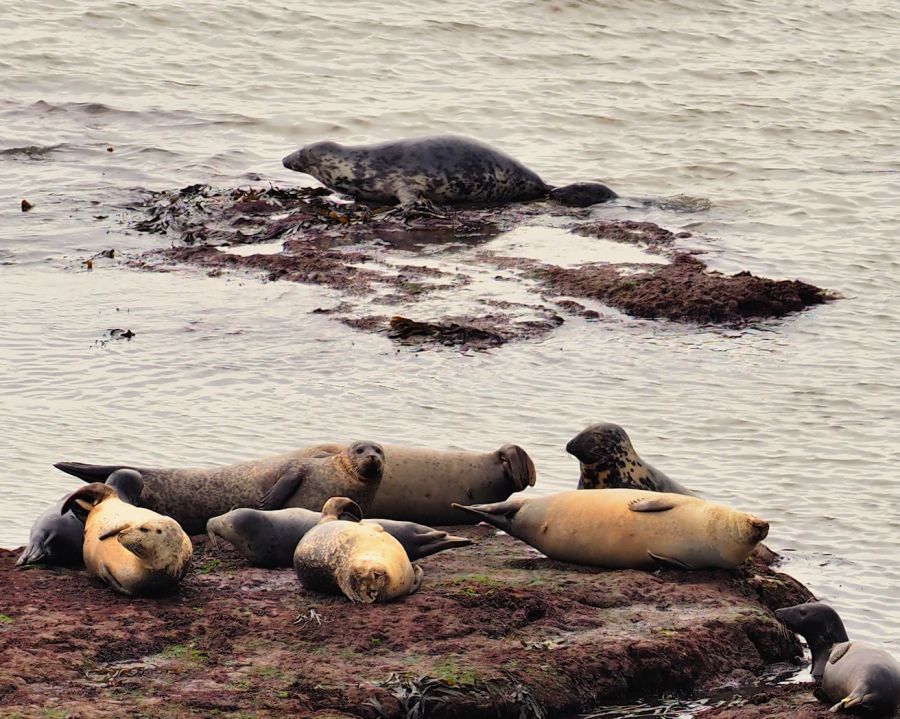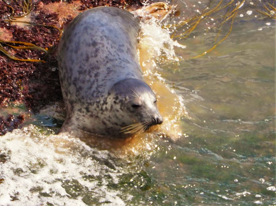 Hier wollen wir eigentlich nur kurz frühstücken. Aber einfach, ohne mal auf’s Meer zu schauen, wieder von hier wegfahren, wollen wir auch nicht, was sich als gute Entscheidung herausstellt. Denn sonst hätten wir den Felsen „The Drinking Dinosaur“ genauso verpasst wie die vielen Seehunde und die süßen Puffins. Von der wundervollen Landschaft mal ganz abgesehen. Und am meisten freuen wir uns über Puffin und Seehund auf einem Foto.