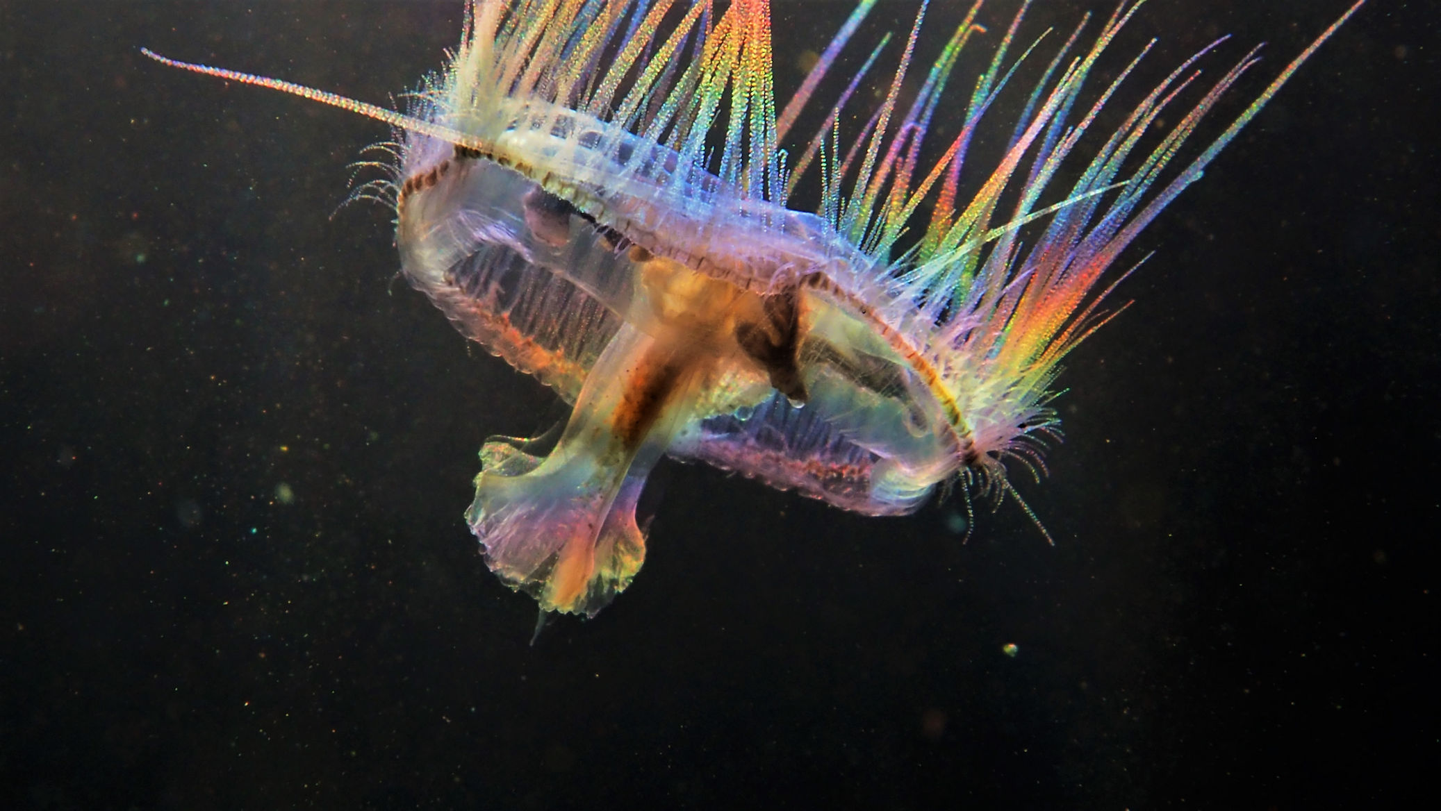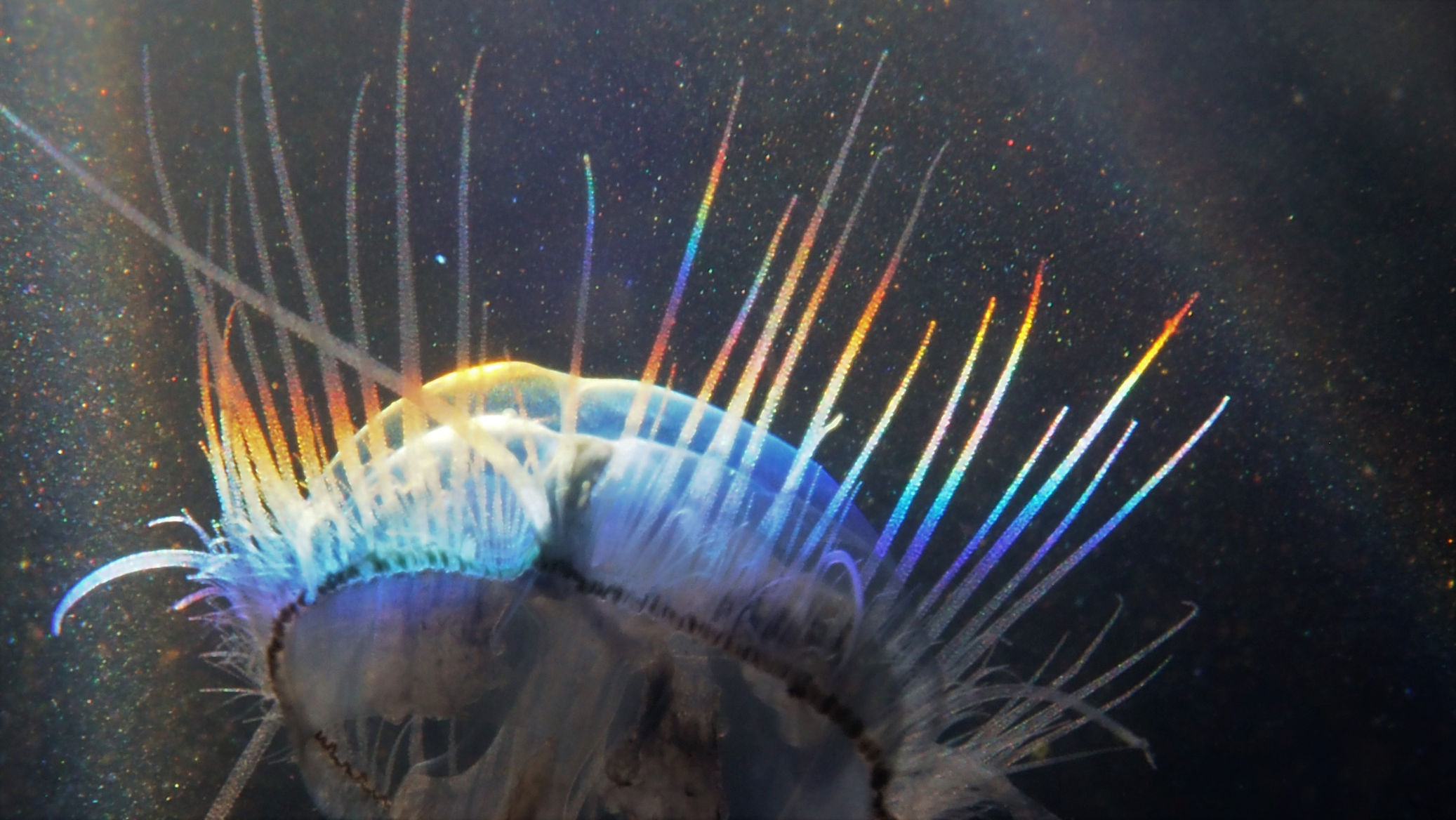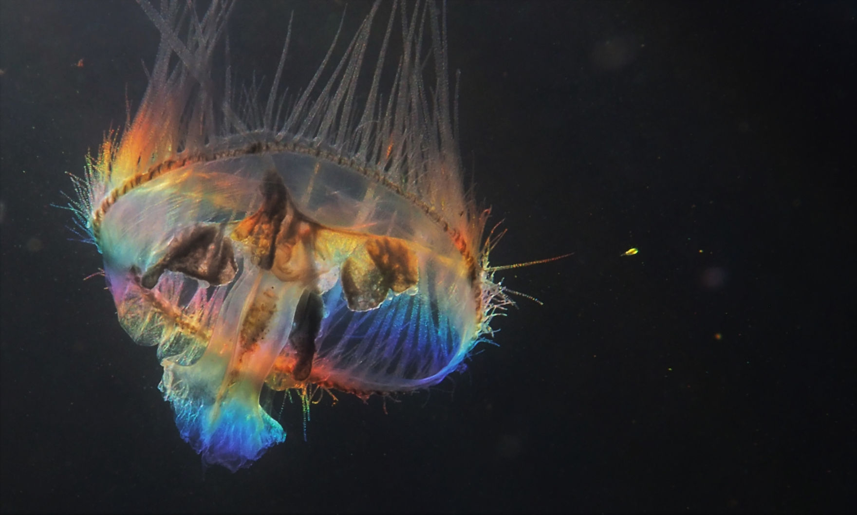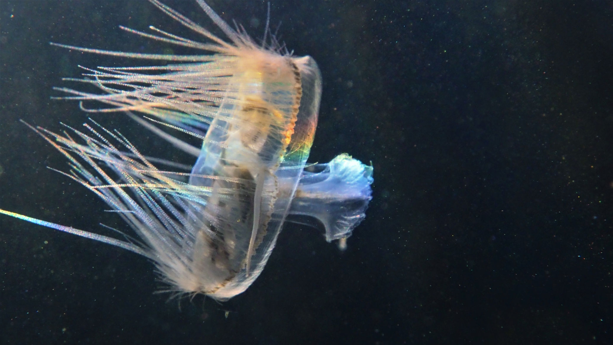 Nach einigen Änderungen an den Einstellungen und des Winkels zum Objekt ist er da: der erste richtig magische Moment: ein Volltreffer der Regenbogenfarben in der Qualle.