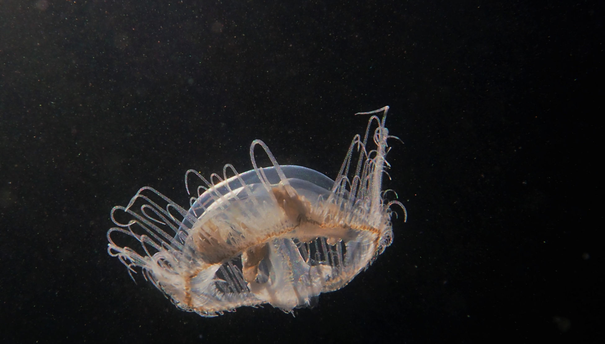 Es beginnt etwas schleppend. Quallen sind zwar da, aber auf den Fotos zeigen sich nur zartpastellfarbene Lichtspiele. Beim Blick auf die Restladung des Kameraakkus wird Ulli etwas nervös, denn dieser zeigt gerade mal noch 29% an. Egal….