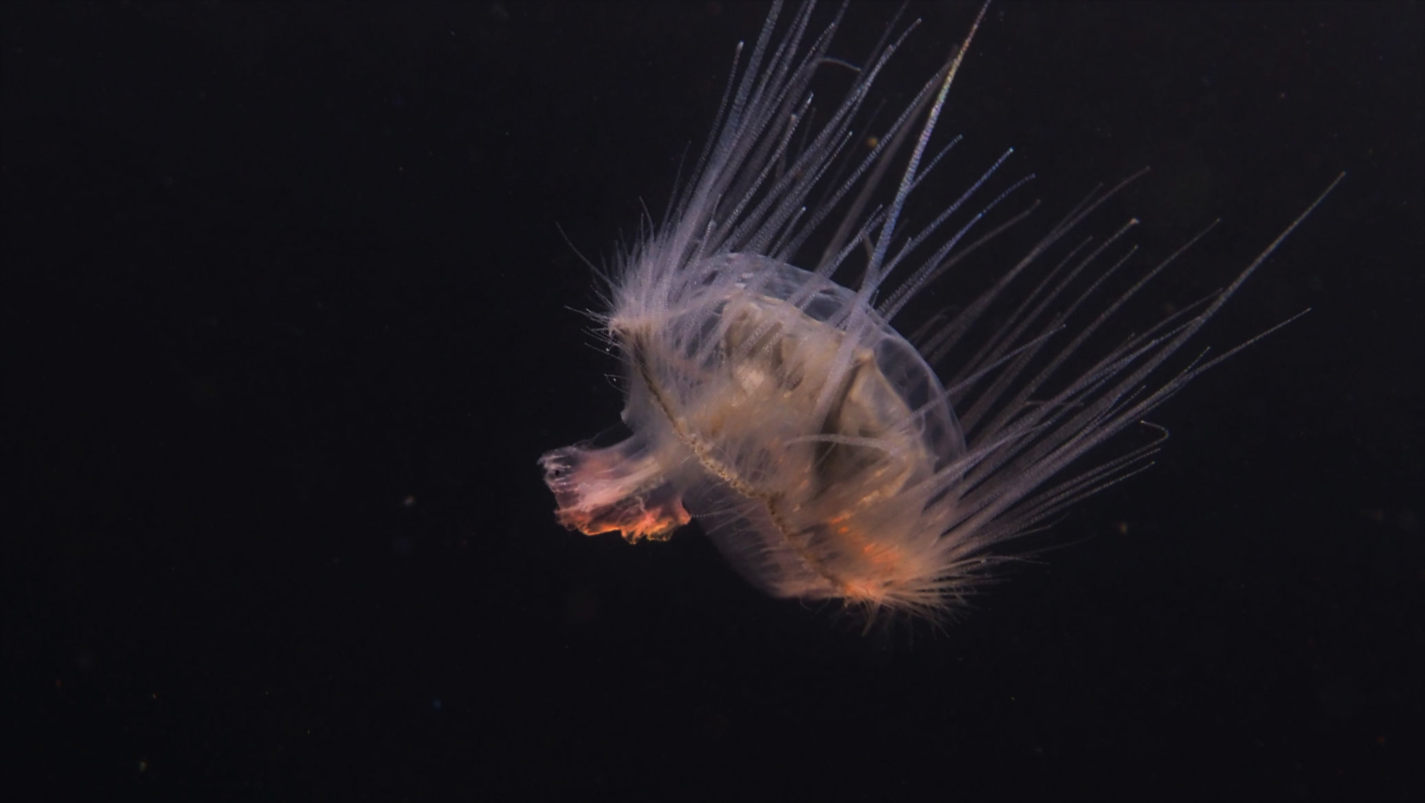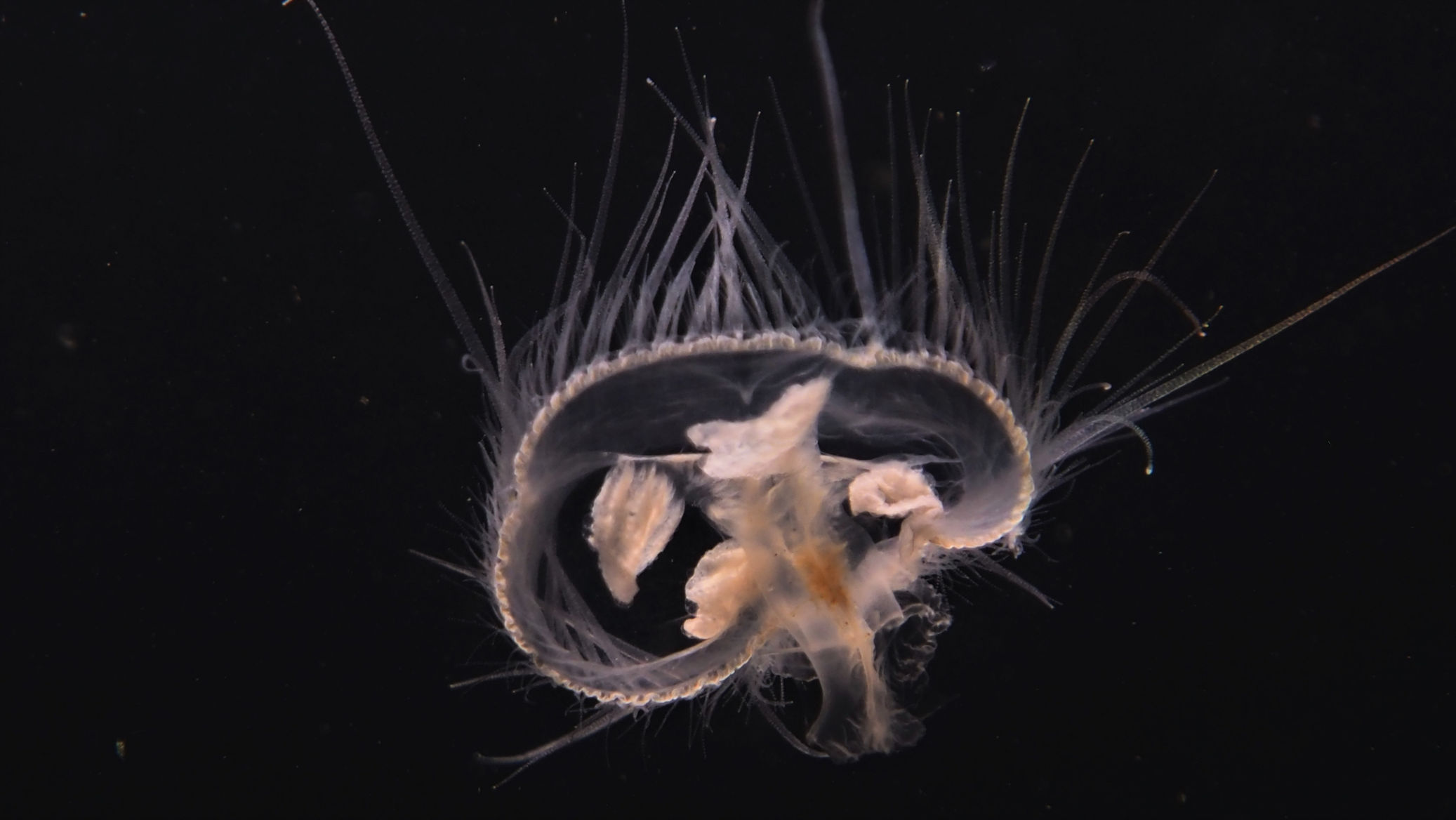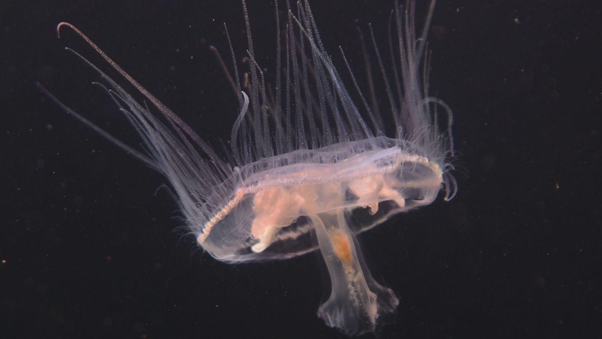 Durchmesser des Schirms bis 2,5 cm, am Schirmrand befinden sich bis über 600 nesselbesetzte, fadenförmige Tentakeln. Der sogenannte und auf den Fotos erkennbare Magenstiel endet in 4 Mundlappen. Diese Tiere vermehren sich anders wie andere nicht auf sexuelle Art, sondern durch die sogenannte Knospung.