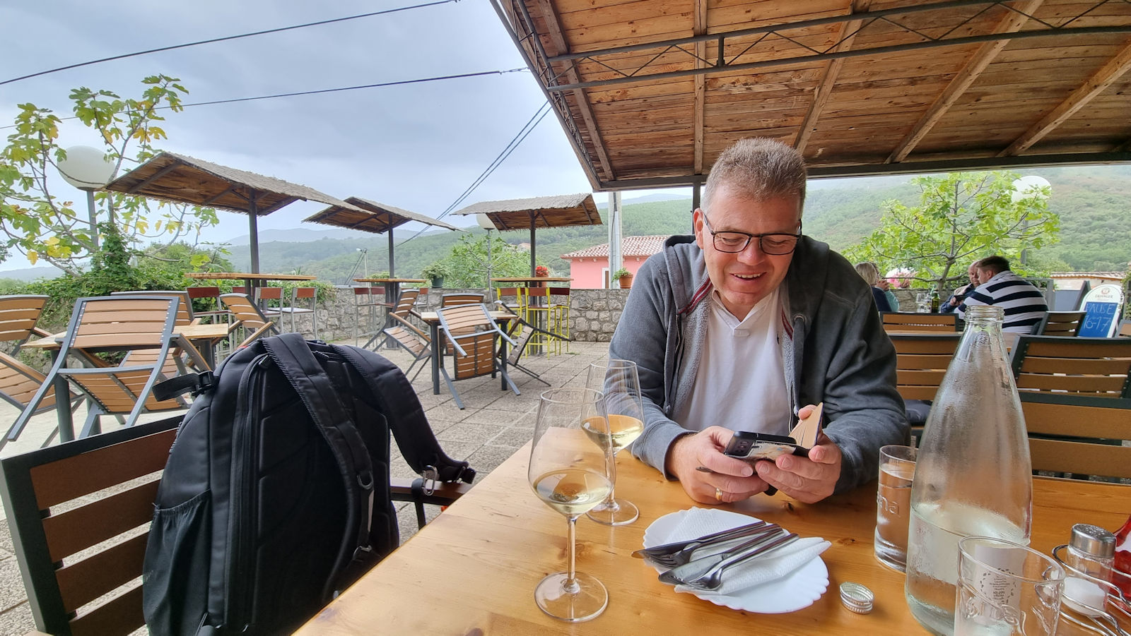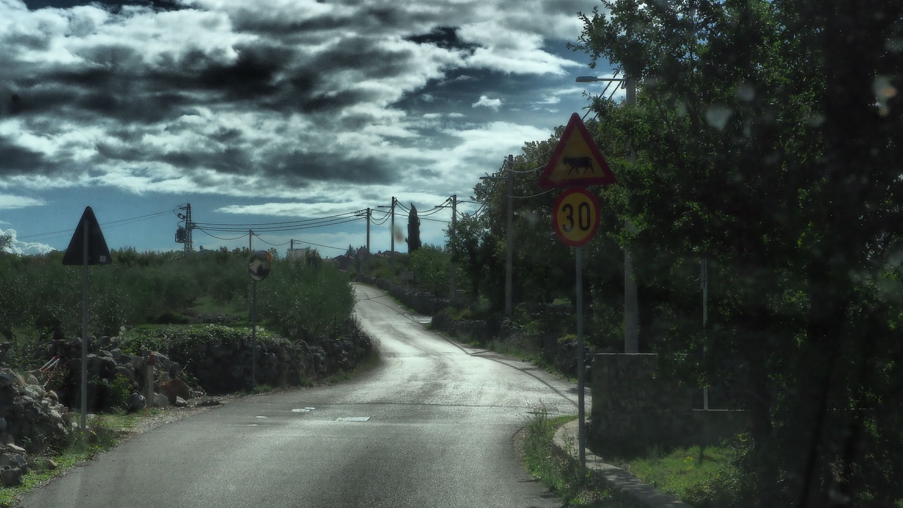 Wir schaffen es gerade noch vor dem nun folgenden, heftigen Regen zurück zum Womo zu kommen. Und was passt besser zu der dunklen, nassen Umgebung als….ein Rotwein, was sonst?