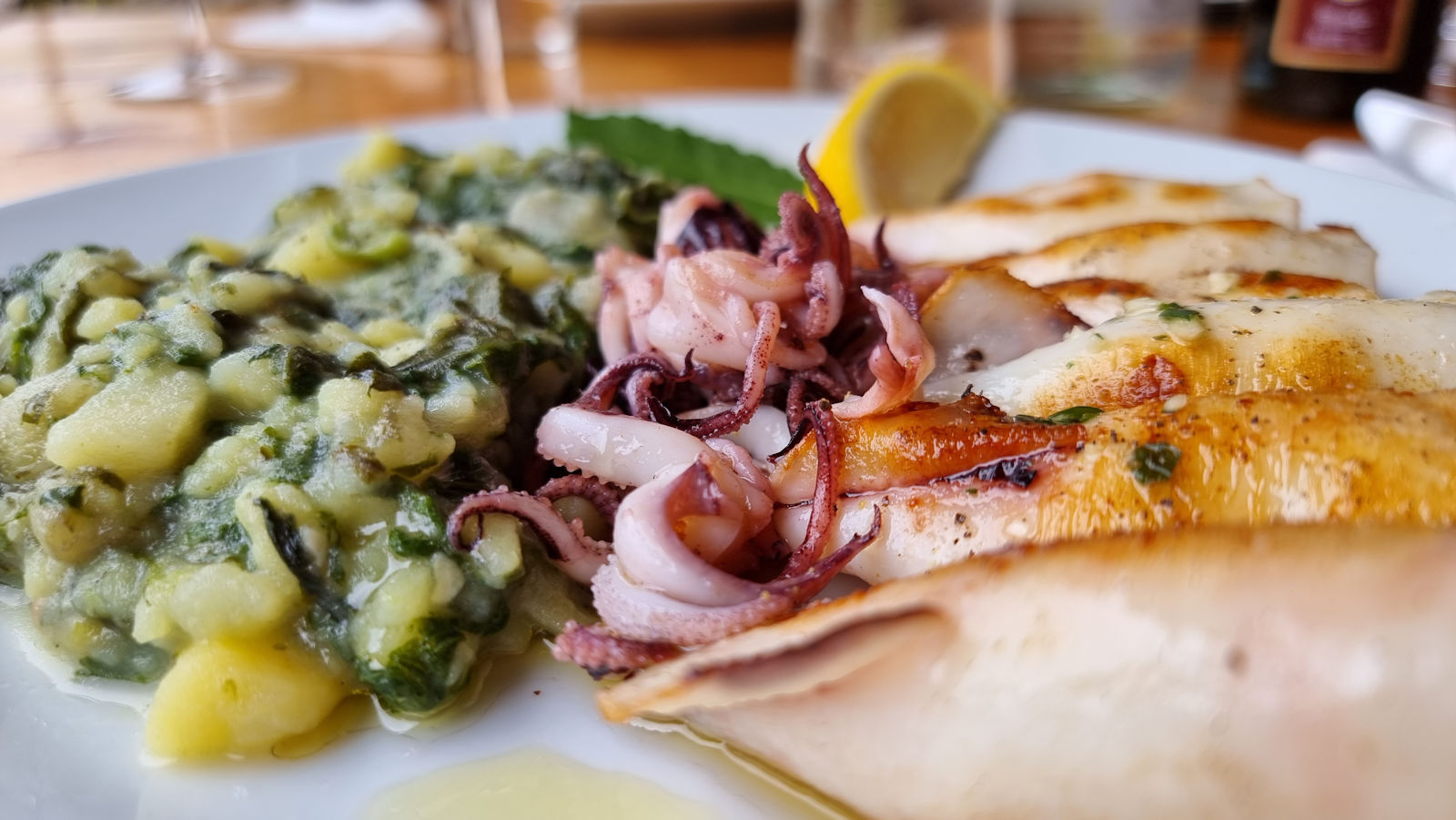Was gibt es Schöneres als eine heiße Dusche nach dem Tauchgang gefolgt von einem entspannten Mittagessen in der kleinen Trattoria vor dem Campingplatz. Bei Chardonnay, gemischtem Salat und Calamari vom Grill mit Mangoldkartoffeln stören die erneuten und auch recht vielen Regentropfen von oben kaum.