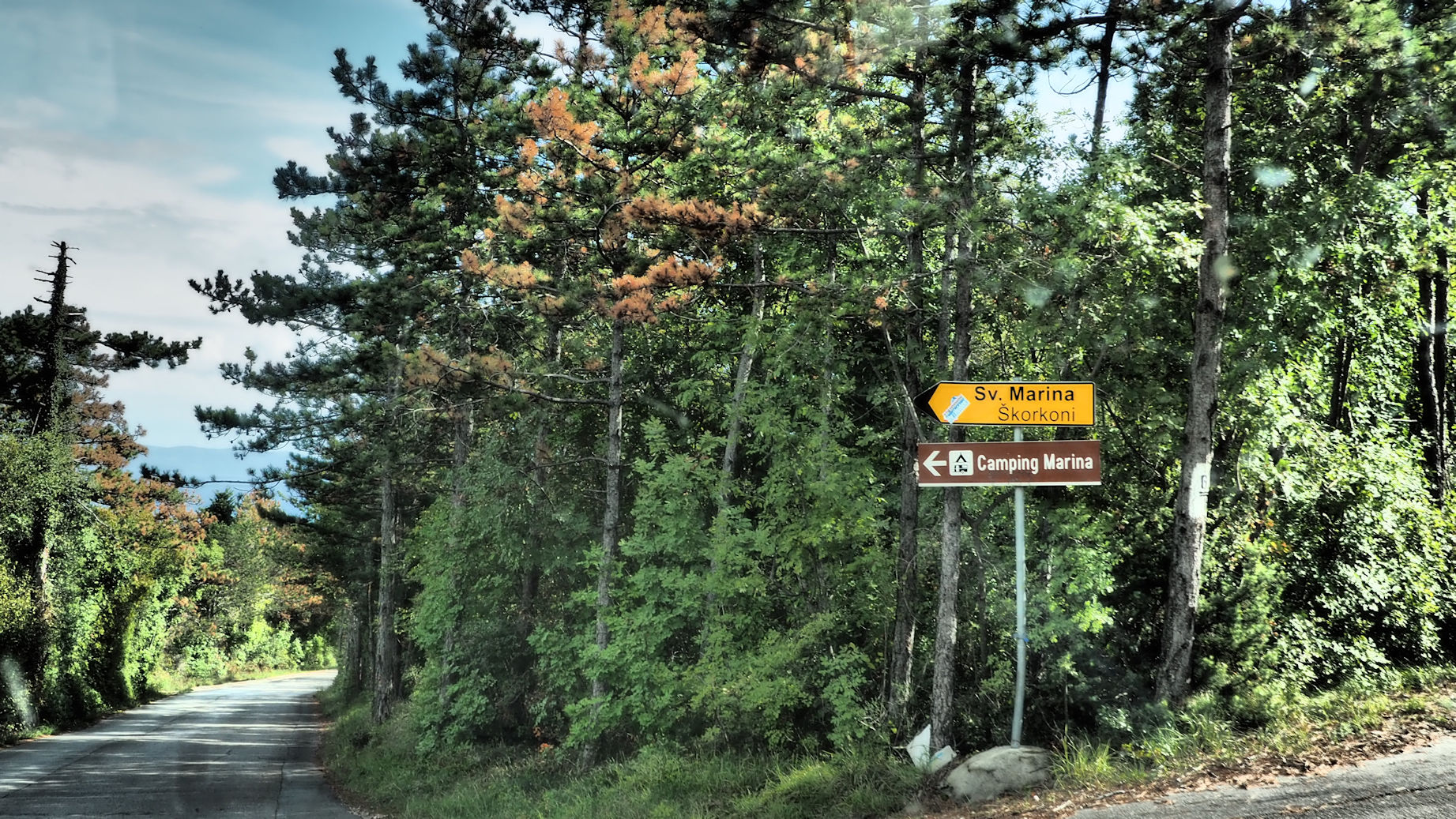 Unsere Route führt uns über die Krk-Brücke, an Rijeka vorbei in Richtung Pula. Hinter dem oberhalb von Rijeka liegenden Tunnel geht es links ab in Richtung Labin. Wir durchfahren Eichenwälder und verträumte Landschaften, kaufen unterwegs noch ein paar Kleinigkeiten ein, bevor wir gegen 14 Uhr auf einer spannenden, steil bergabführenden Straße den Eingang des Campings erreichen. Der Check-In ist schnell erledigt, jedoch ist Platz 16 für unser Womo zu klein. Daher entscheiden wir uns für Platz Nummer 18, informieren die Rezeption…alles wunderbar unkompliziert.