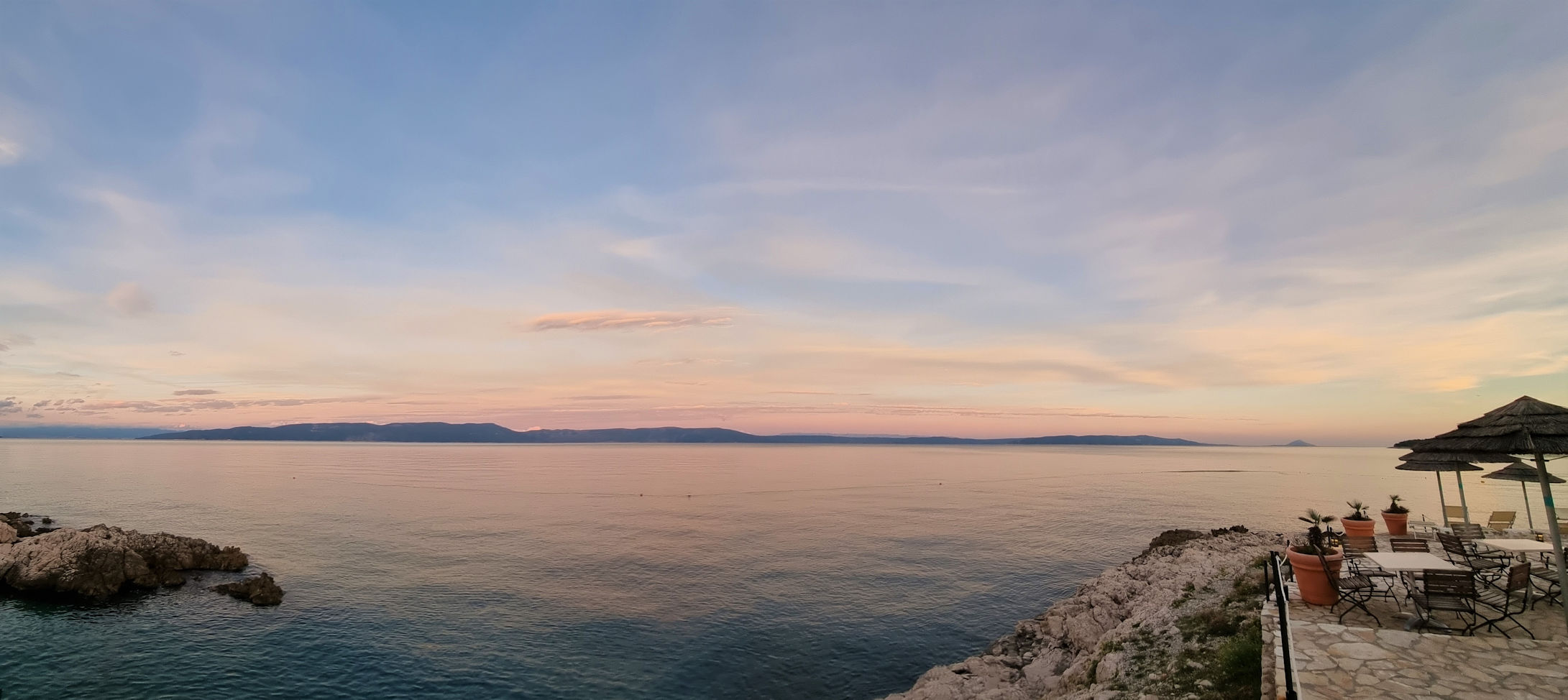 Noch ist ein wenig wechselhaftes Wetter. Es zeigen sich immer wieder Wolken und am Nachmittag frischt der Wind auf. Gegen 17 Uhr brechen wir auf zum späten Mittag bzw. frühen Abendessen. Die Speisen sind frisch zubereitet, es schmeckt sehr lecker und die Mitarbeiter im Restaurant sind alle sehr nett und zuvorkommend. Die Fellzwerge bekommen sogar jeder ein eigenes Wassernäpfchen!