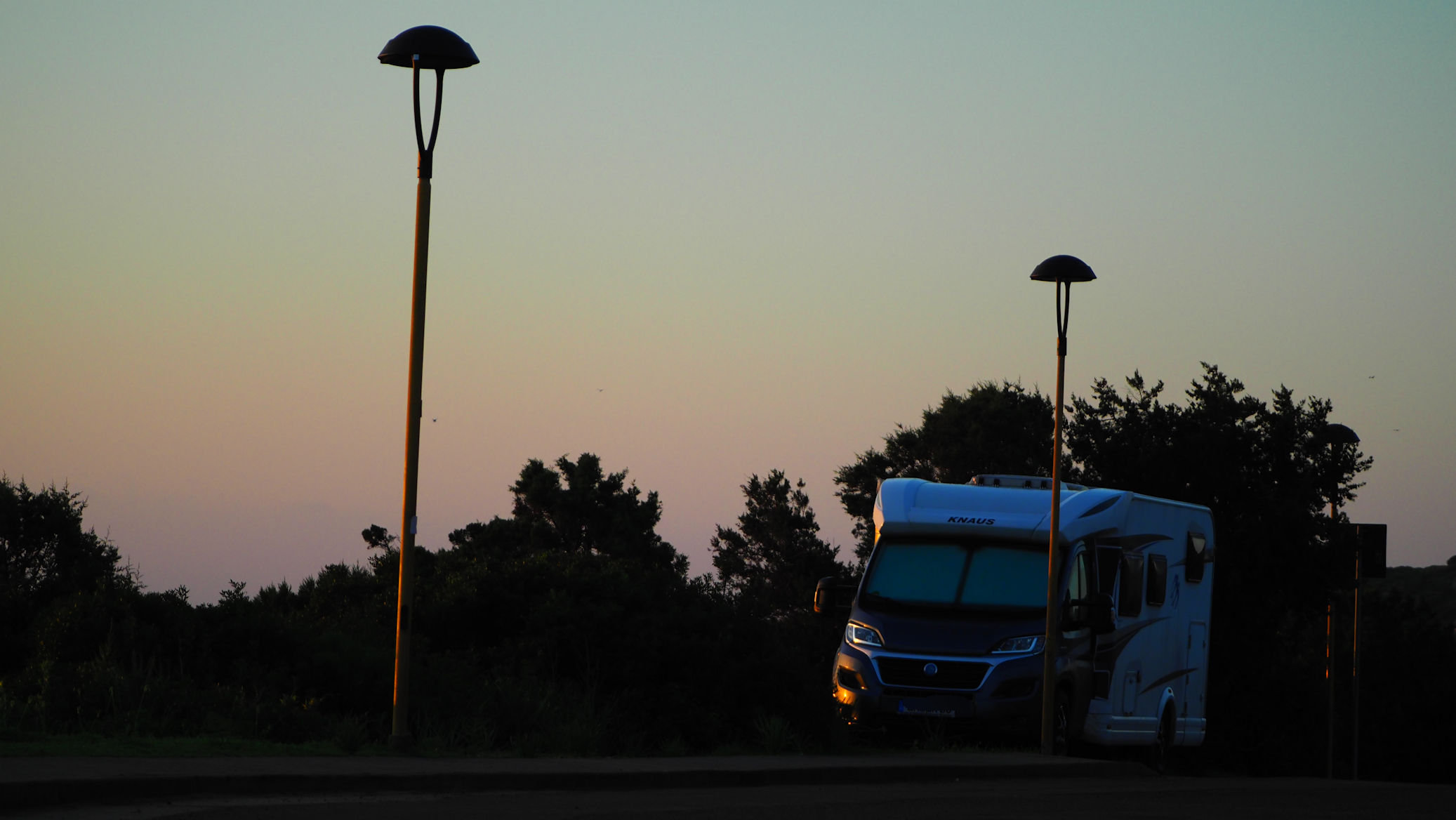 Witzig ist auch ein neben uns parkendes Womo, dass ebenfalls Nikolausstuhlhussen als Weihnachtsdeko über die Vordersitze gezogen hat. Die beiden Insassen wundern sich zuerst, warum wir deren Womo fotografieren, müssen dann aber auch schmunzeln. Es folgt ein reger Austausch der bisher bereisten Plätze. Die beiden sind auf Inselrunde gegen den Uhrzeigersinn, wir in der Gegenrichtung – jedenfalls derzeit.