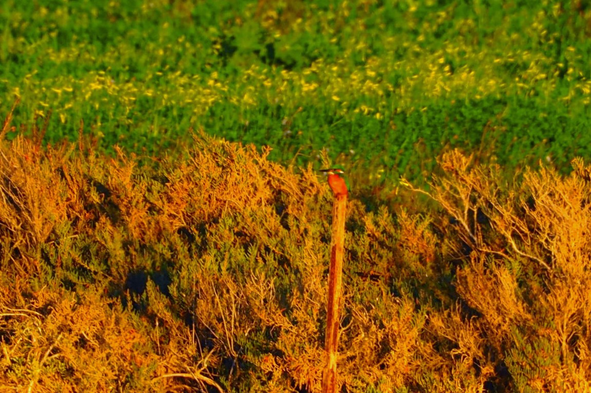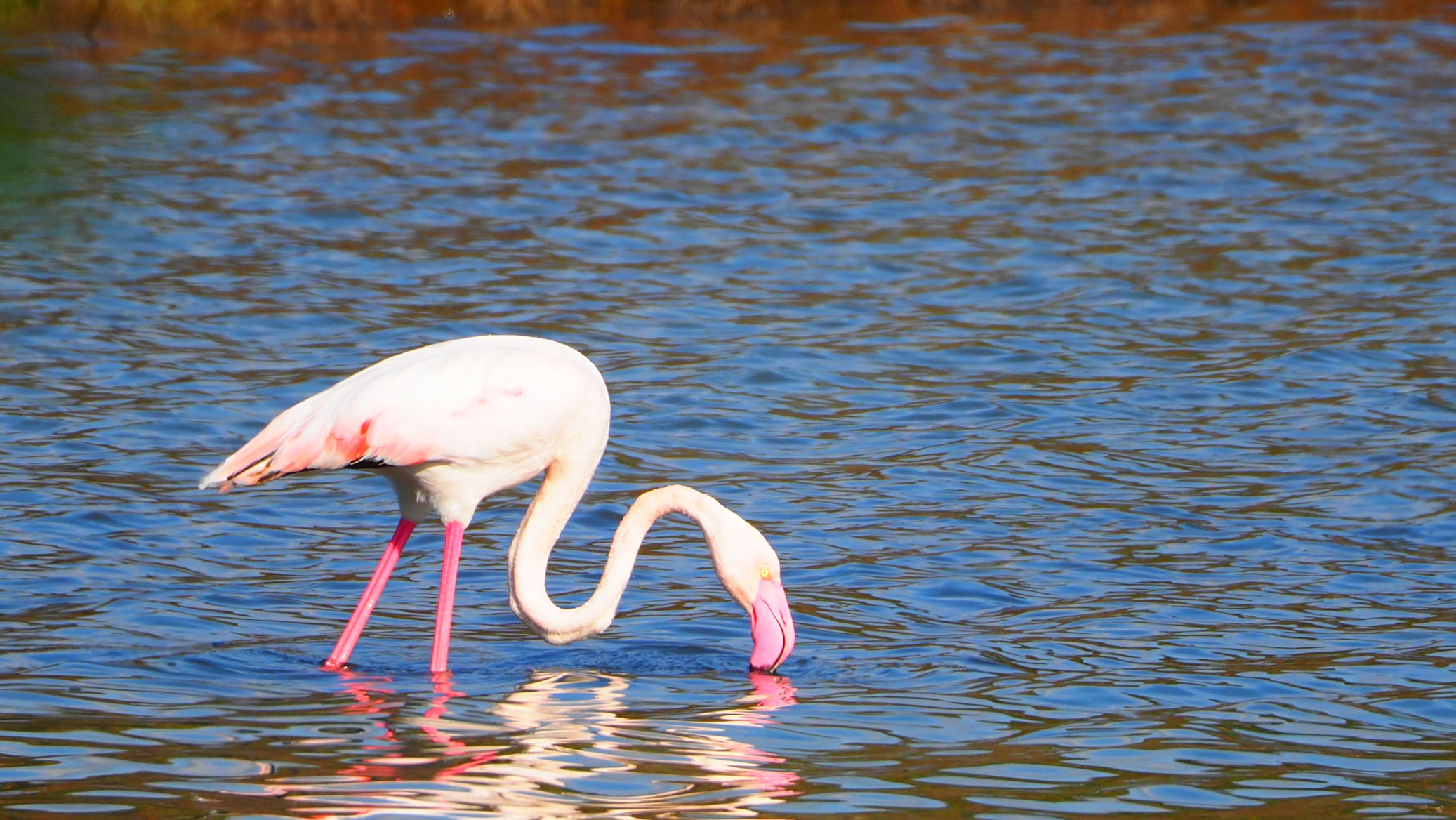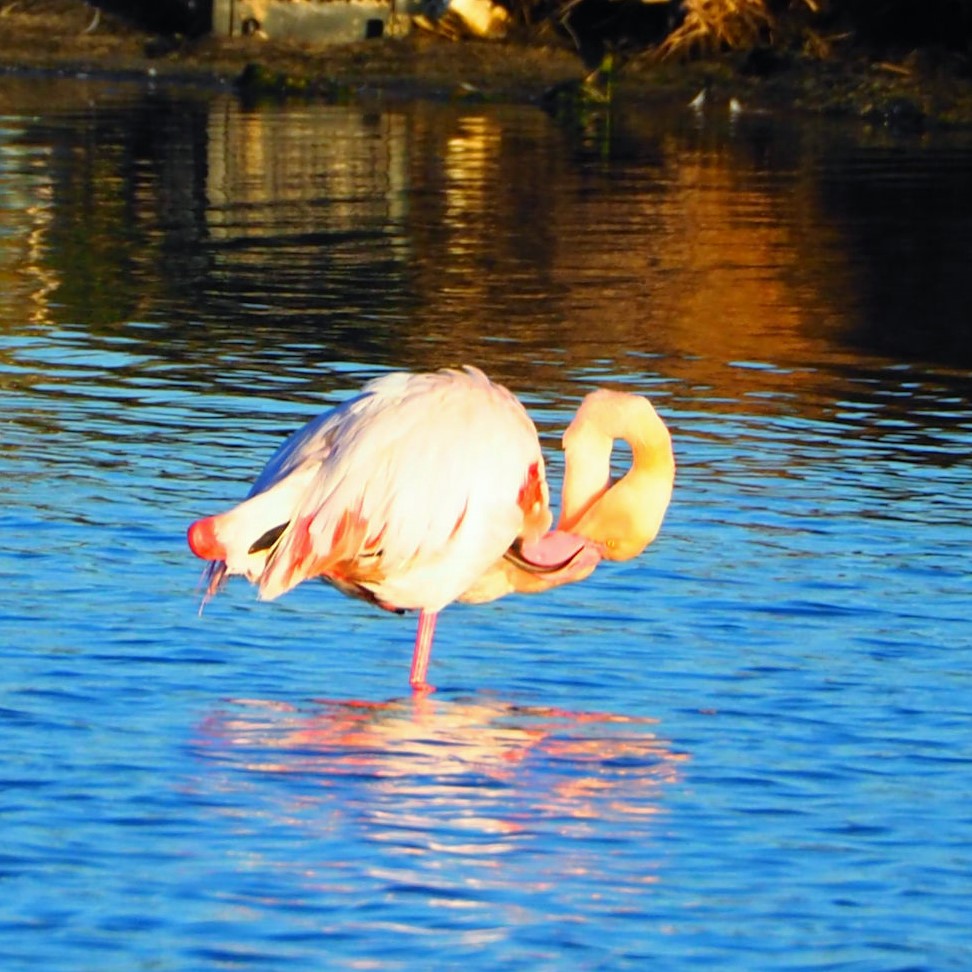 Und nun? Wir entscheiden uns für eine kurze Fahrt zur Spiaggia di Porto Botte in der Nähe von Sant’Antioco. Dort parken wir im beginnenden Abendlicht direkt neben einer Gruppe Flamingos und einer kleinen, blauen Überraschung: ein Martin Pescatore, ein Eisvogel scheint die bildschönen Flamingos regelrecht zu beaufsichtigen.