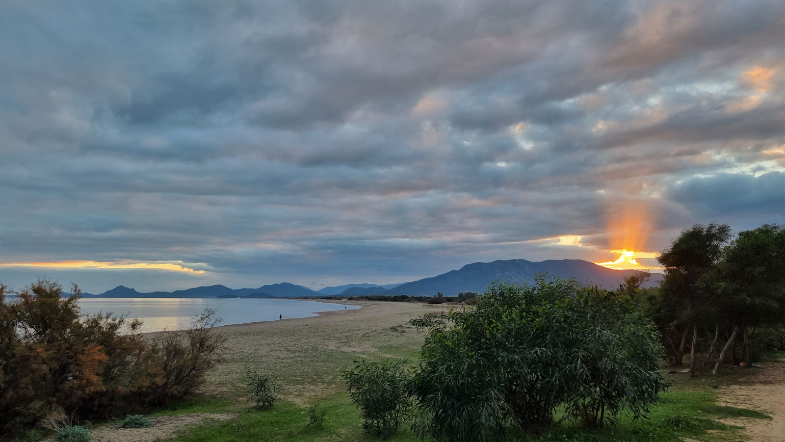 Der Sonnenaufgang ist heute richtig orange und zaubert schöne Farben in die Landschaft. Unser „Frühstücksglück“ wollen wir heute etwa 12 km nördlich von hier in der Hakuna Matata Beach Bar versuchen. Der Strand ist traumhaft, die Bar leider geschlossen. Aber an so einem Strand mundet auch ein Bialetti und dazu aufgetaute Cornetti. Unterwegs durchfahren wir kleinere Vororte von Tortoli, die sich in der Morgensonne richtig nett präsentieren.