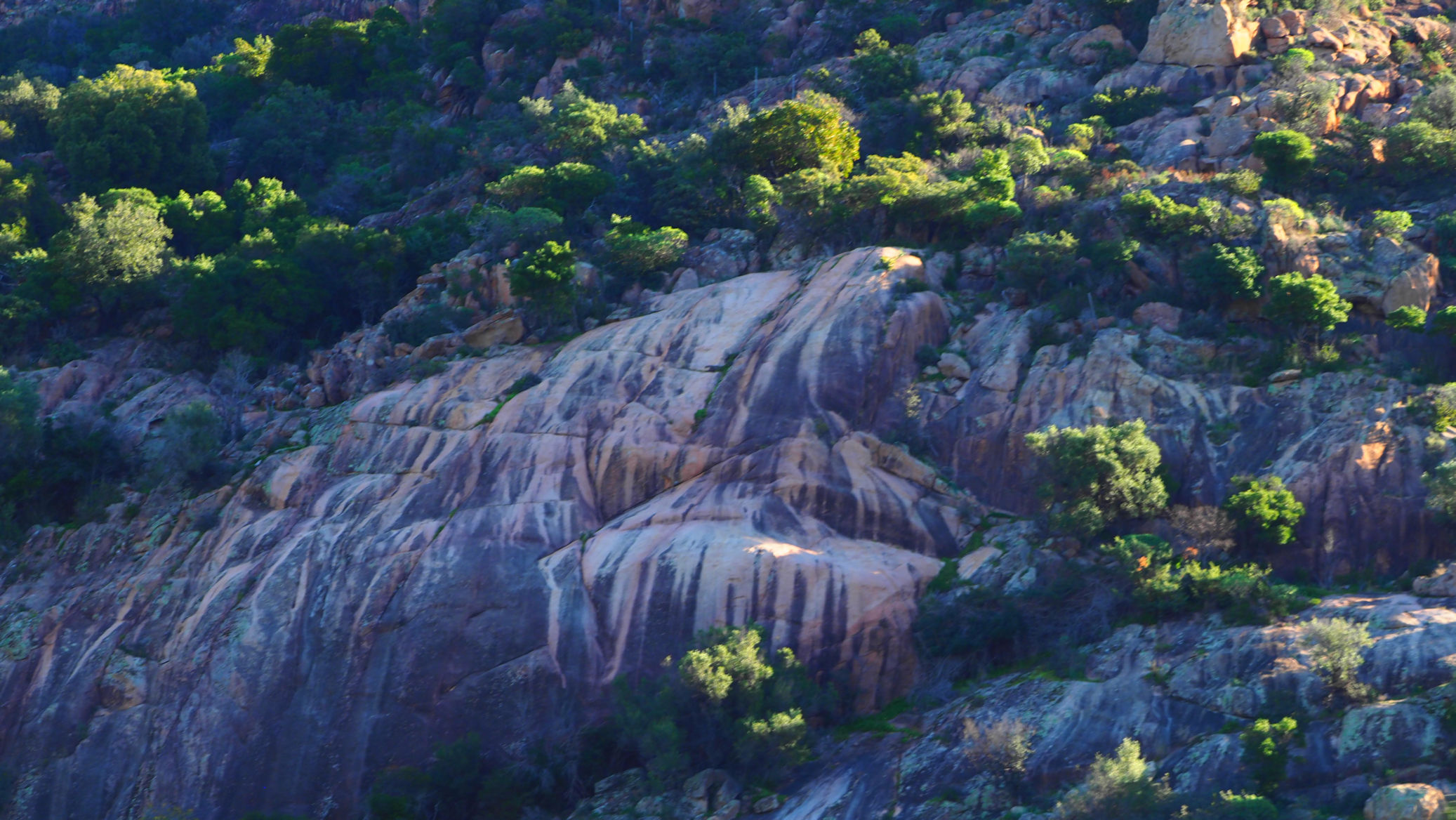Auf unserer Fahrt dorthin kommen wir an einigen der für diesen Teil der Insel typischen roten Felsen vorbei. Schön, aber nicht spektakulär.