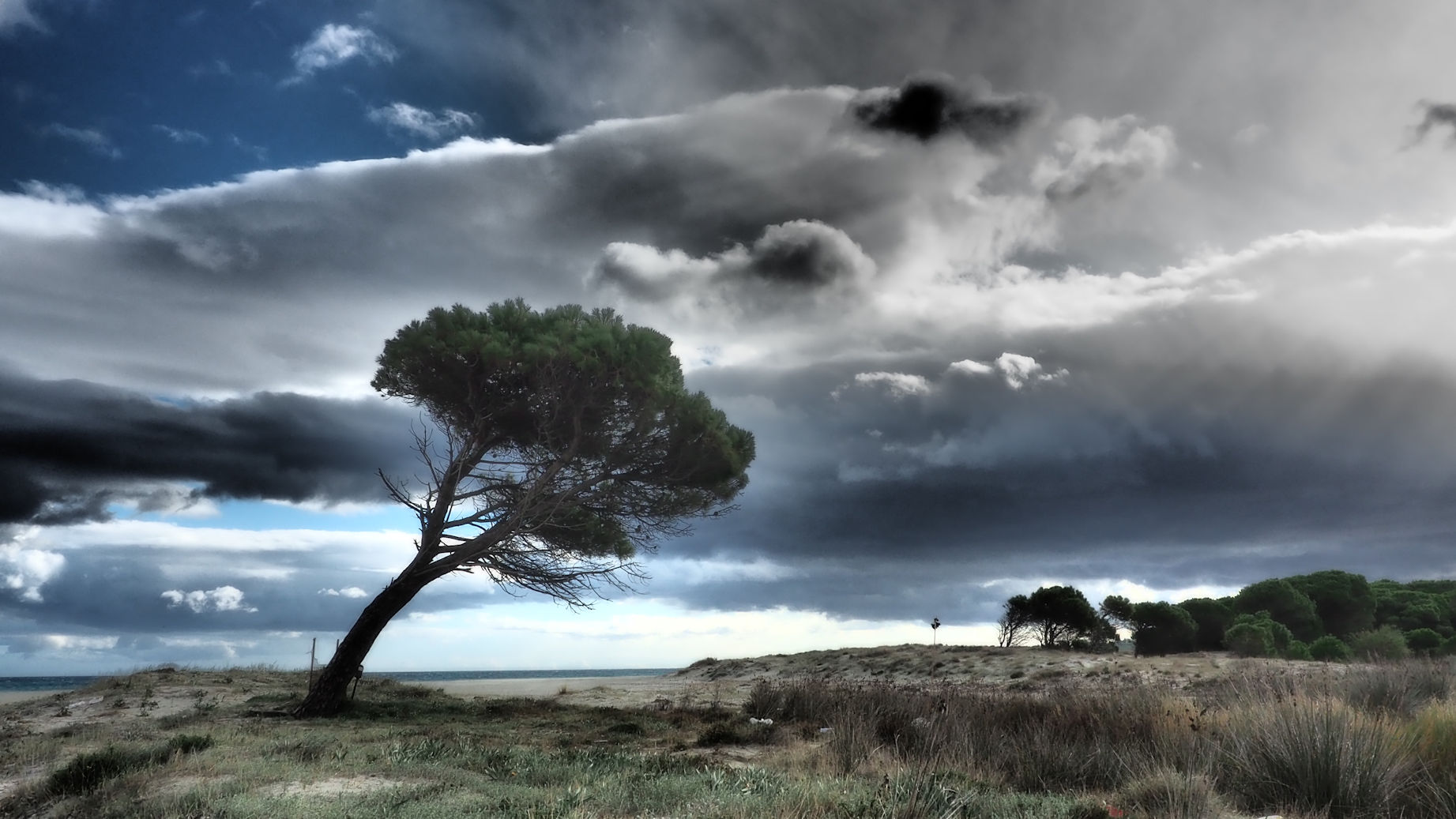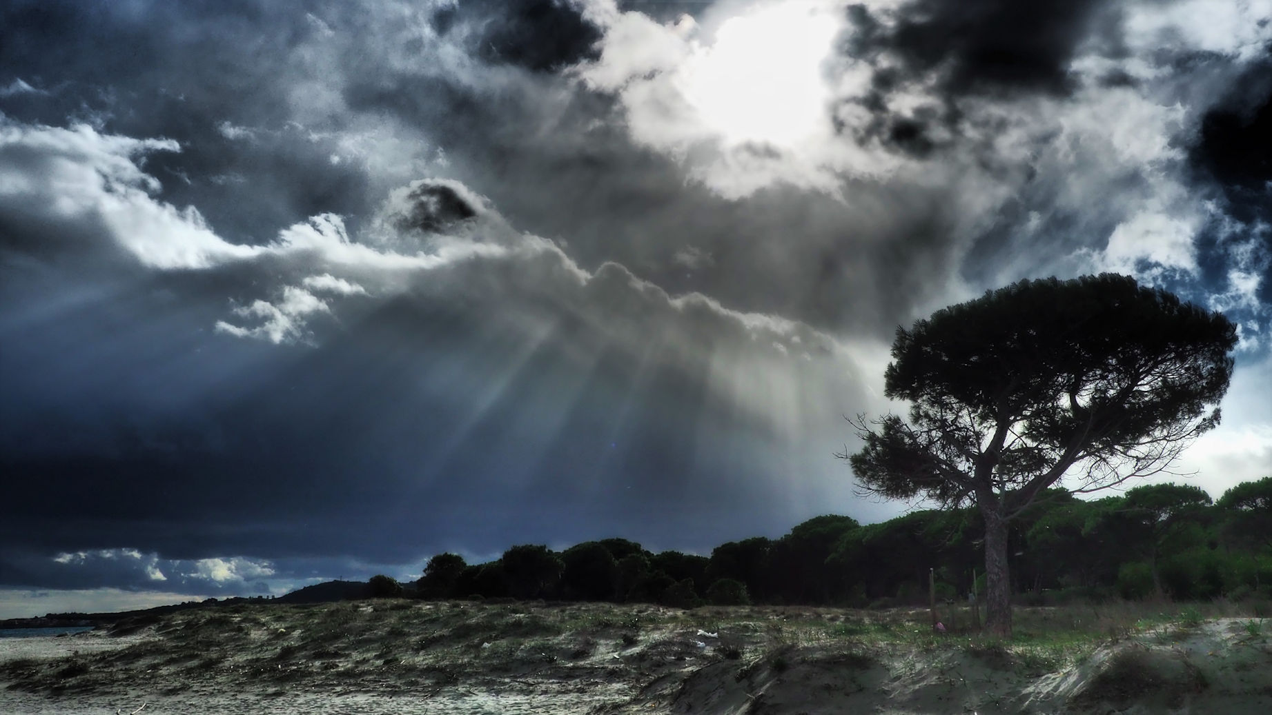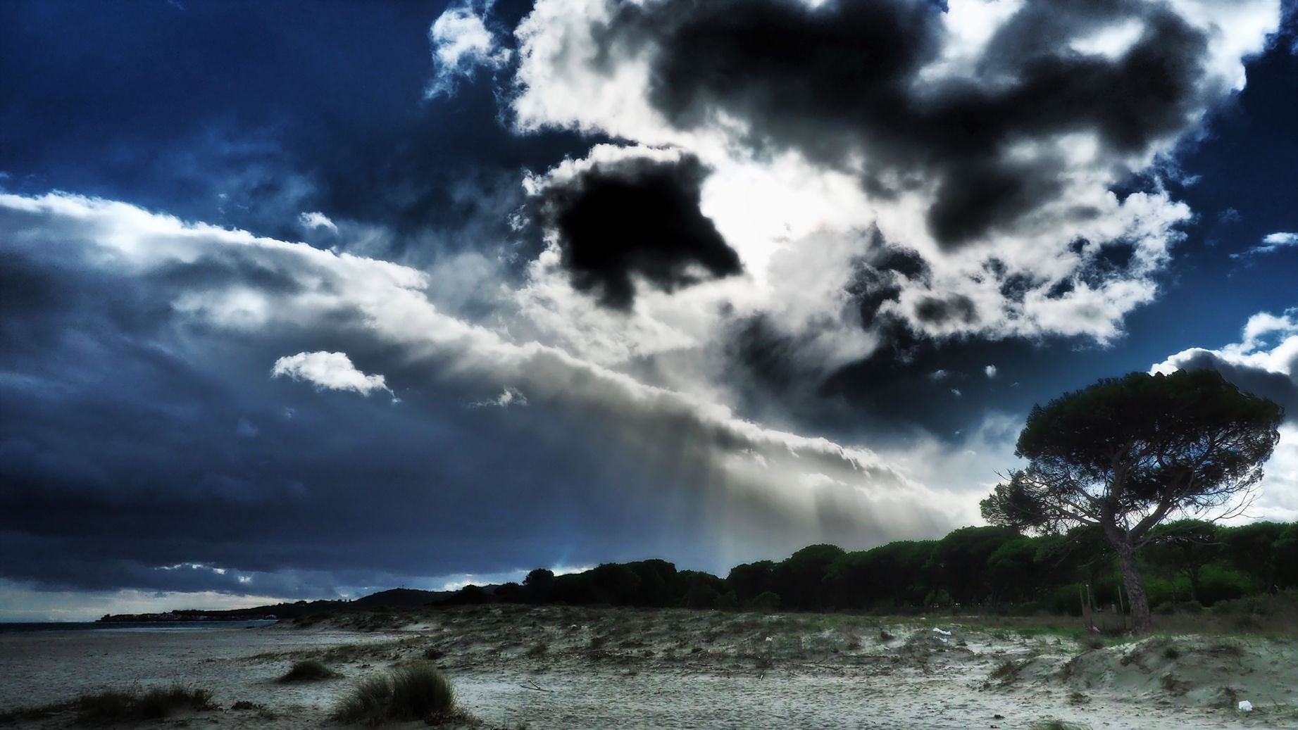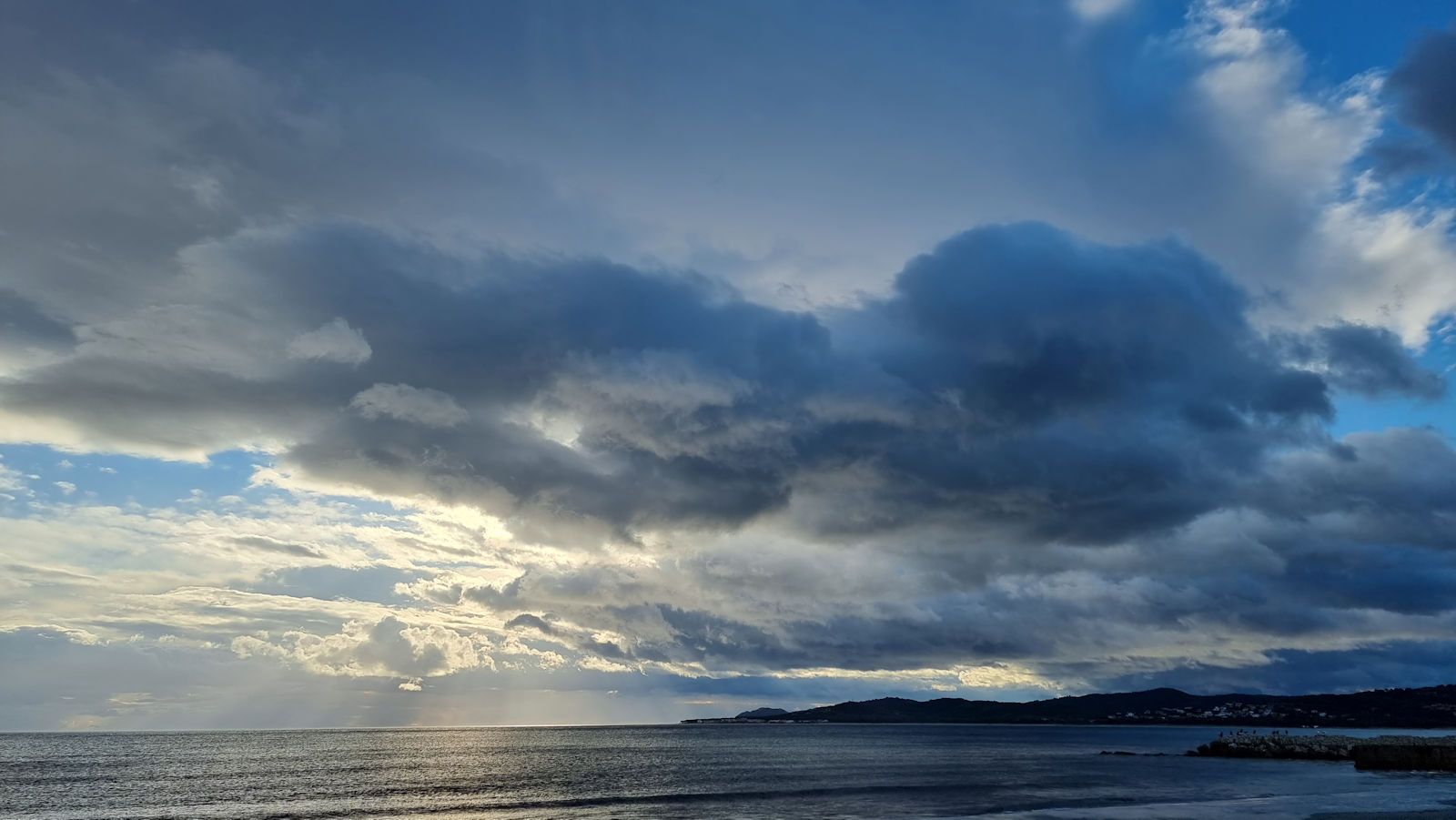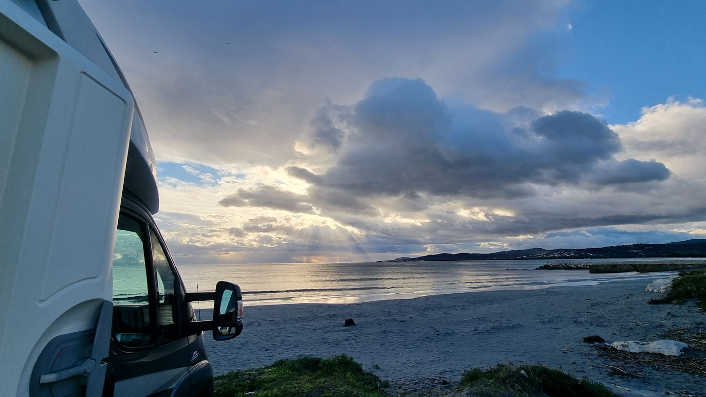 Als wir um halb 9 die Rollos aufziehen, ist bereits ein wenig blauer Himmel zu sehen. Da wir jedoch inmitten von Pfützen parken, beschließen wir einen Ortswechsel, da die Fellnasen ja Gassigegen und nicht -schwimmen sollen. Wir parken am Fischereihafen von Caletta mit Blick auf den Strand und eine wunderbare Wolkenstimmung.